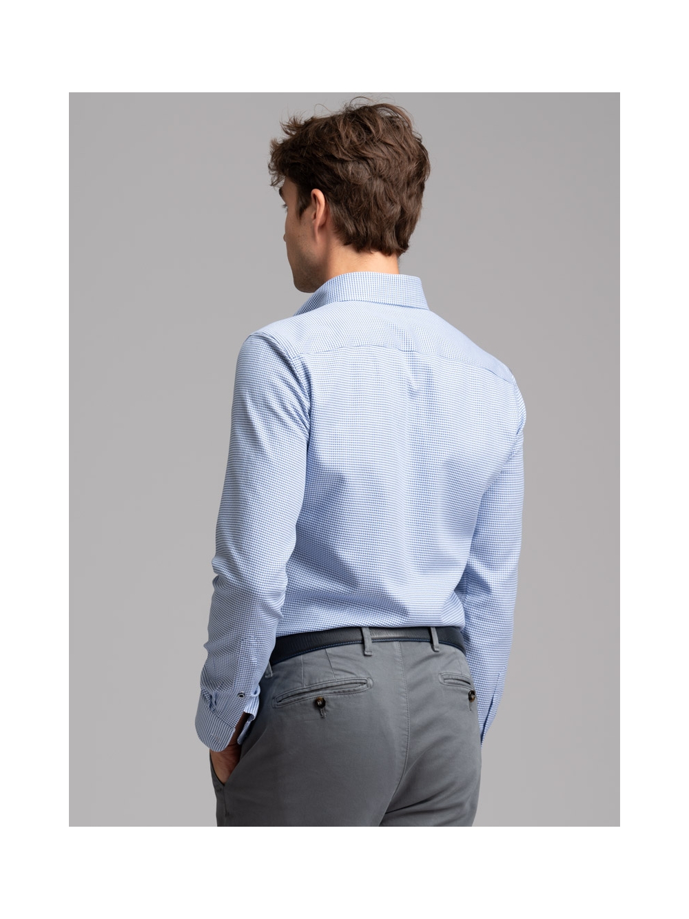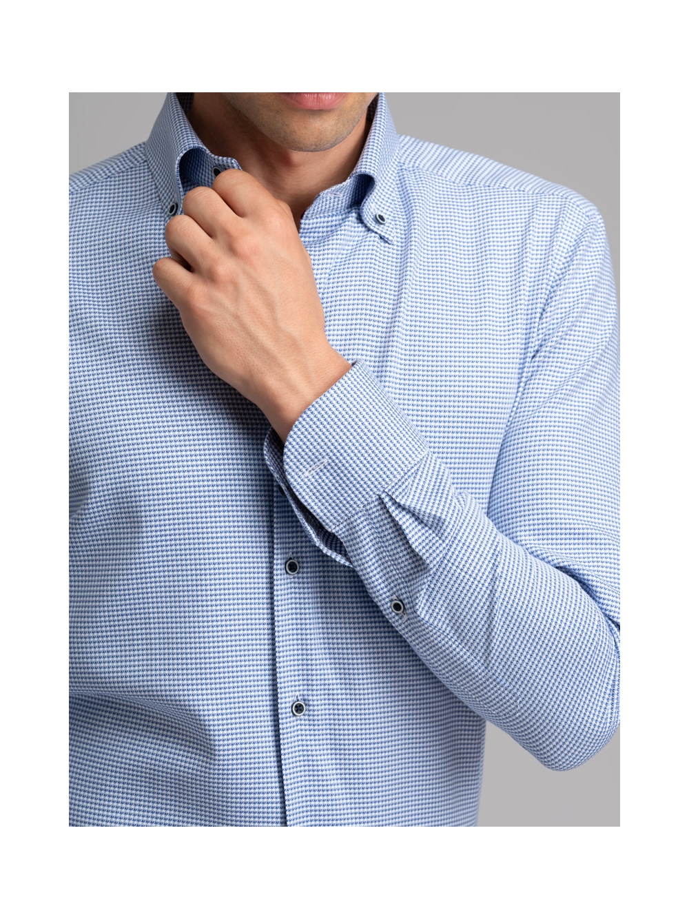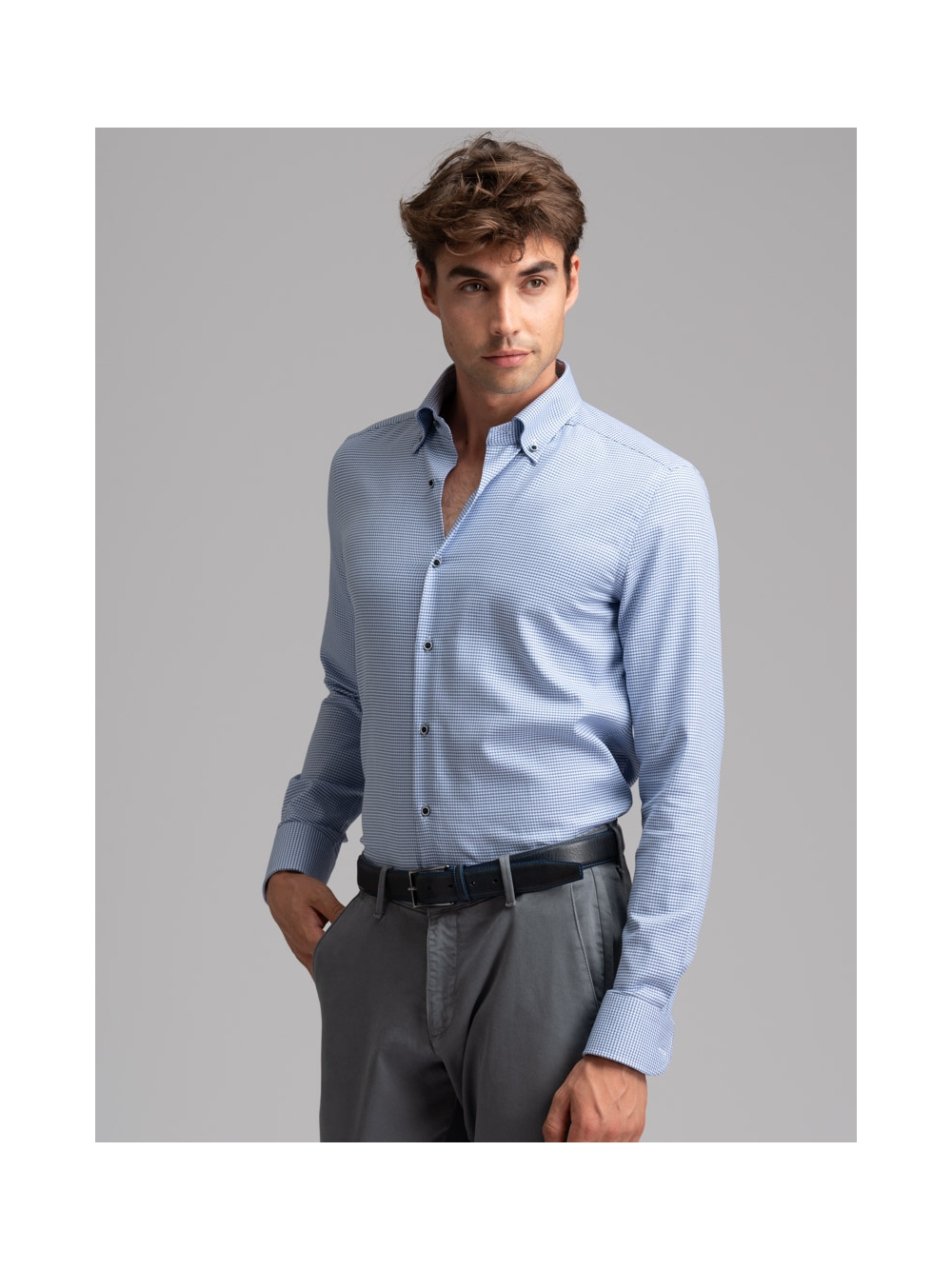 Camicia uomo con collo button down realizzata in tessuto micro fantasia azzurro con bottoni e inserti di tessuto a contrasto.