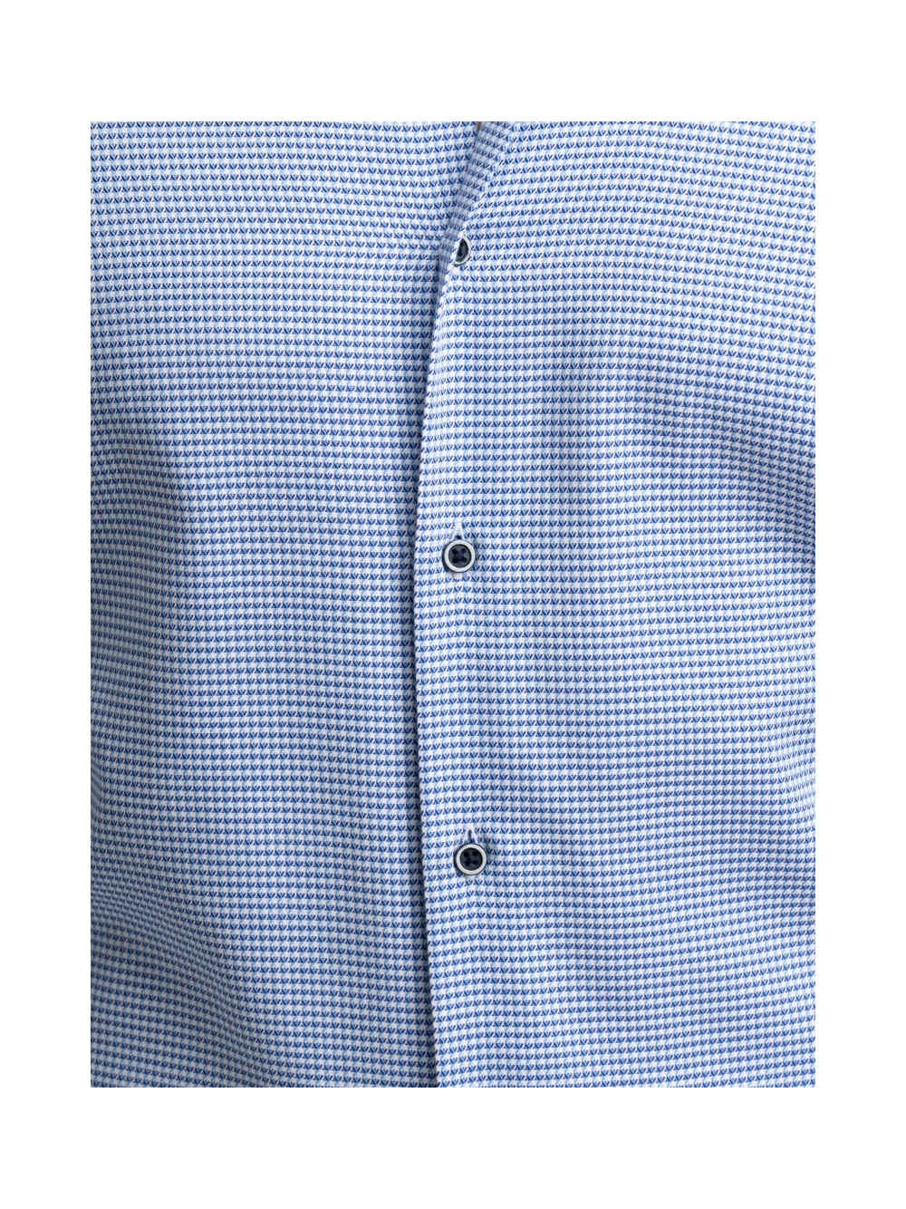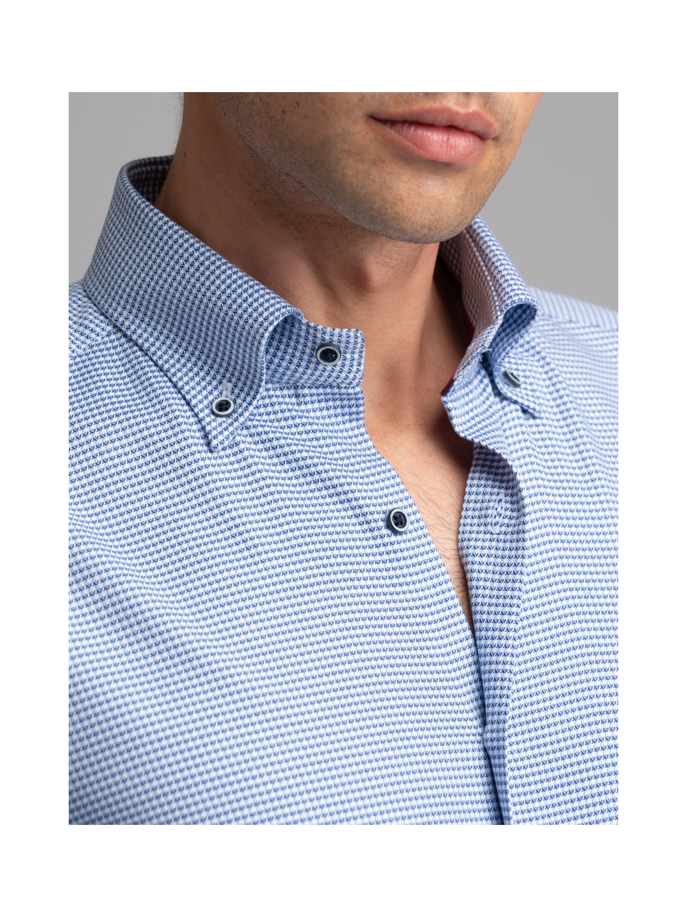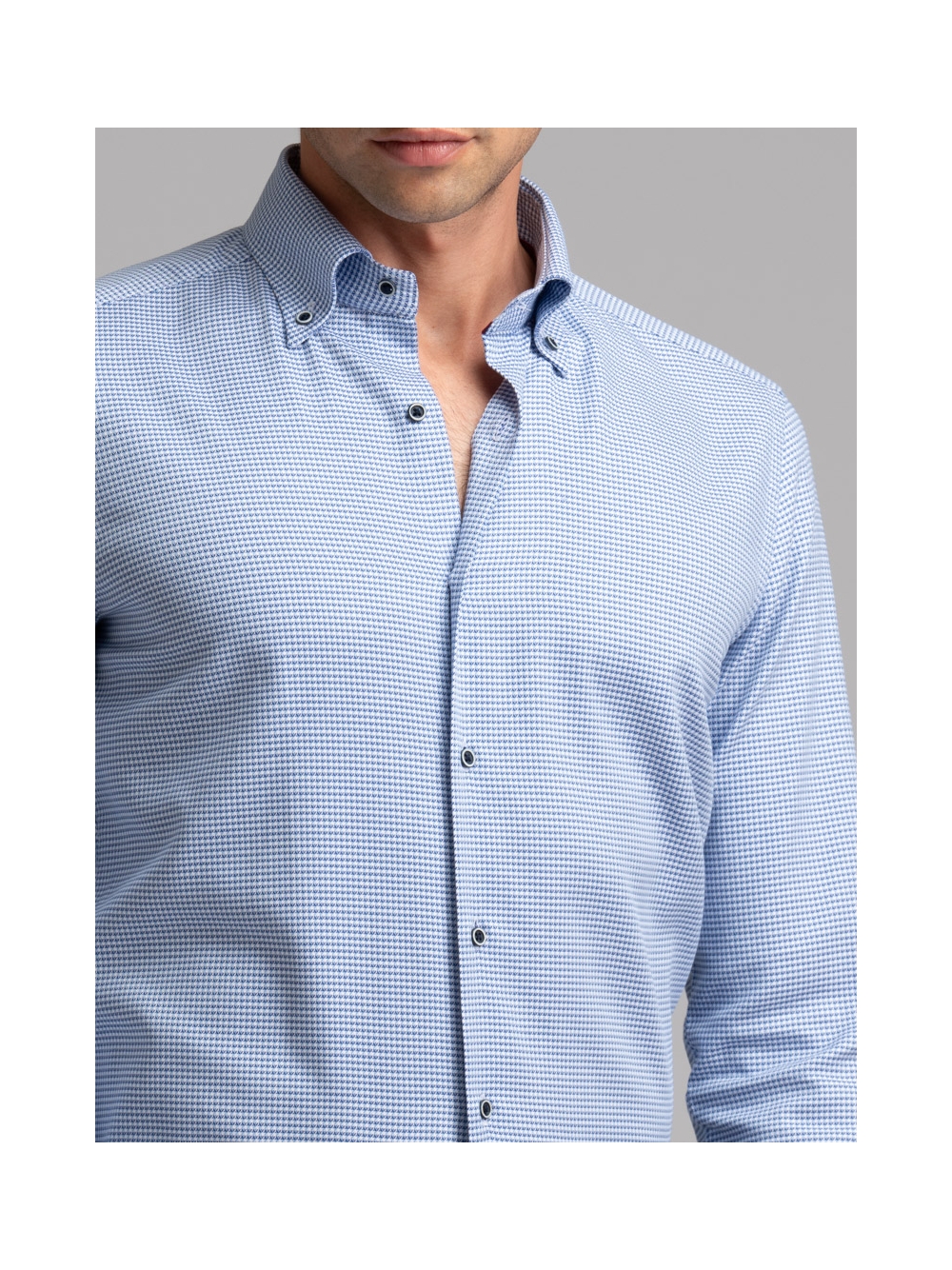 Camicia uomo con collo button down realizzata in tessuto micro fantasia azzurro con bottoni e inserti di tessuto a contrasto.