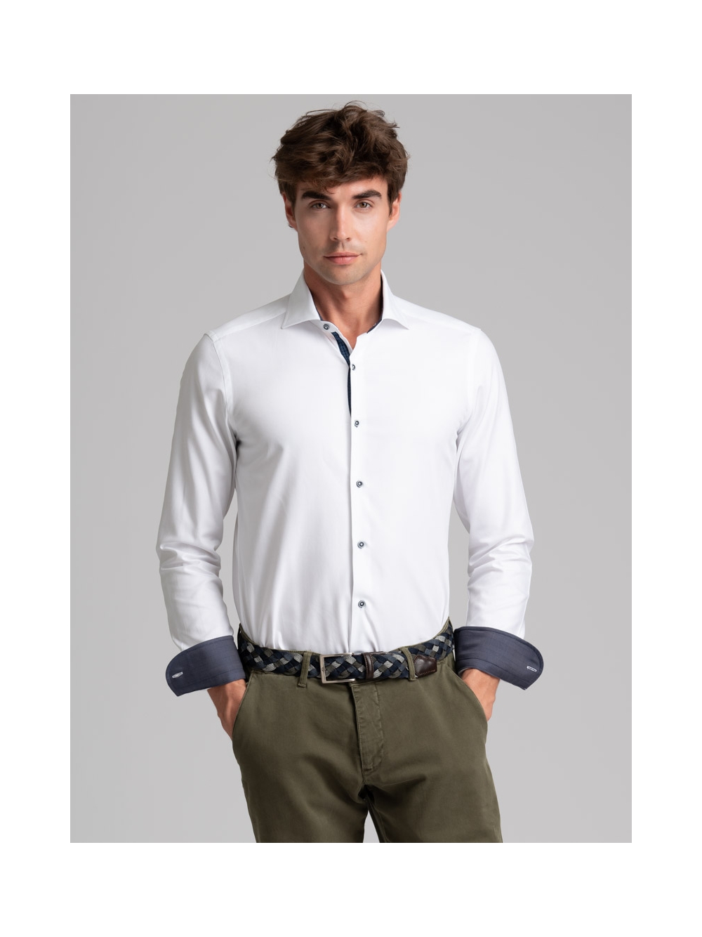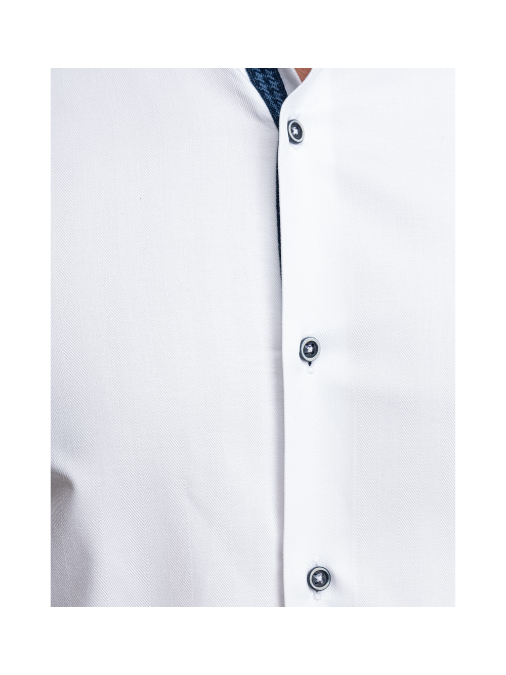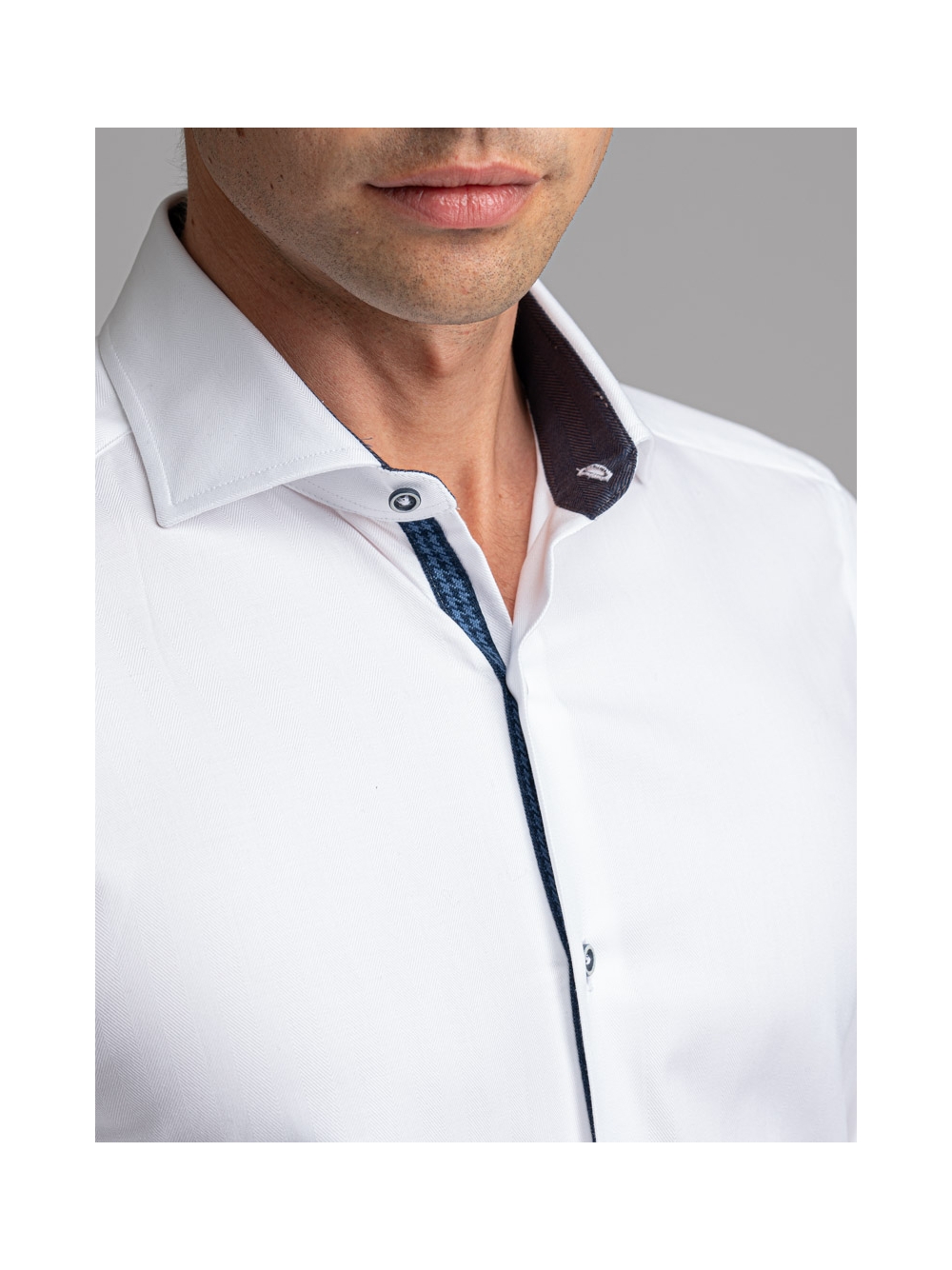 Camicia uomo con collo semifrancese in tessuto bianco base twill con fantasia a spina di pesce, inserti a contrasto e bottoni abbinati.