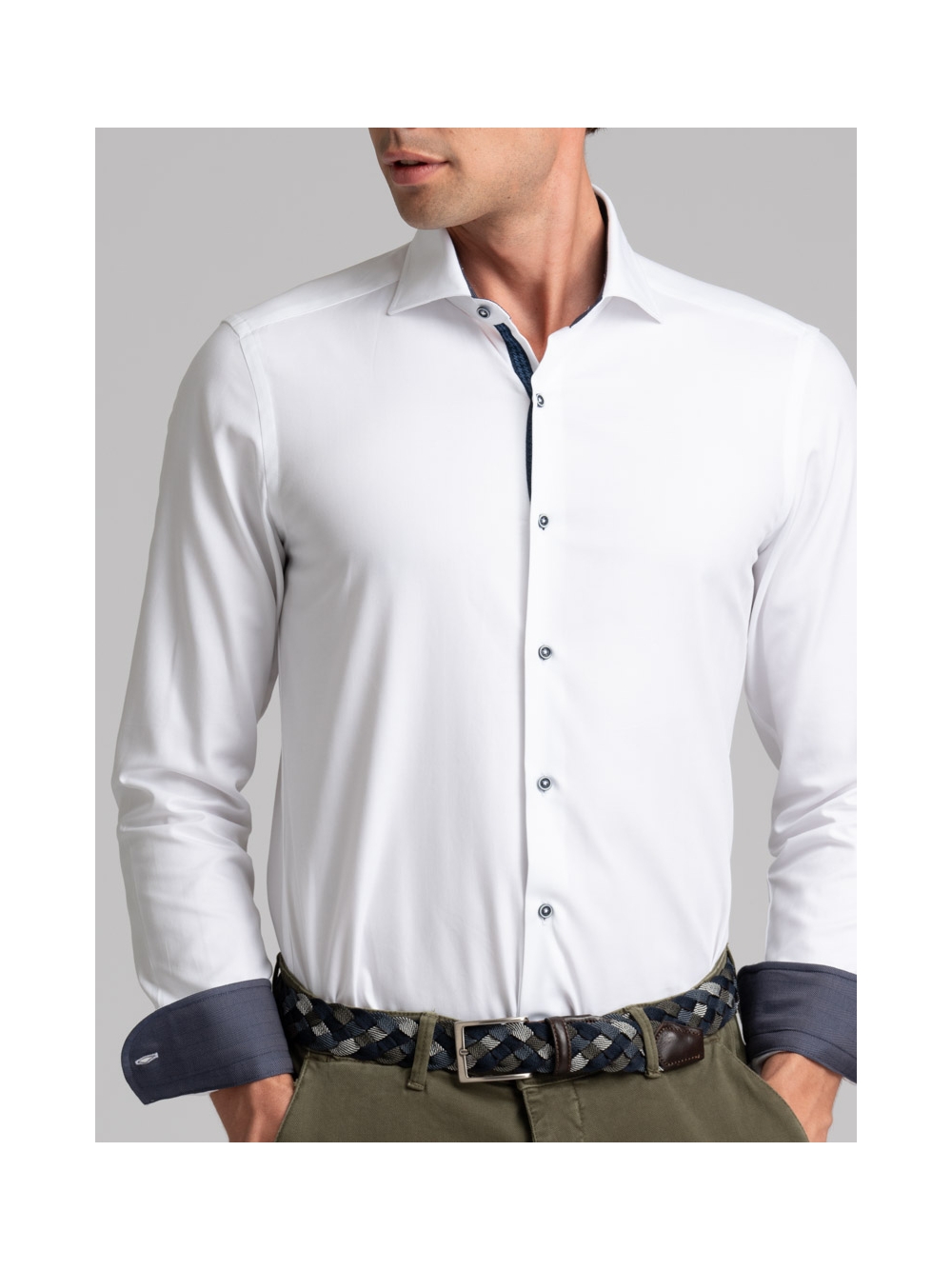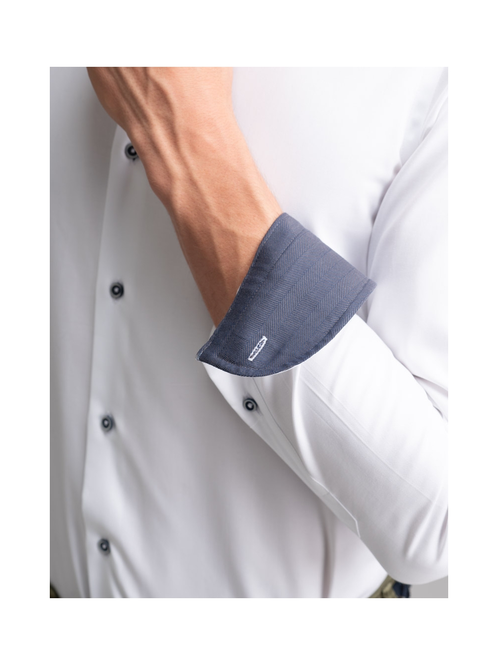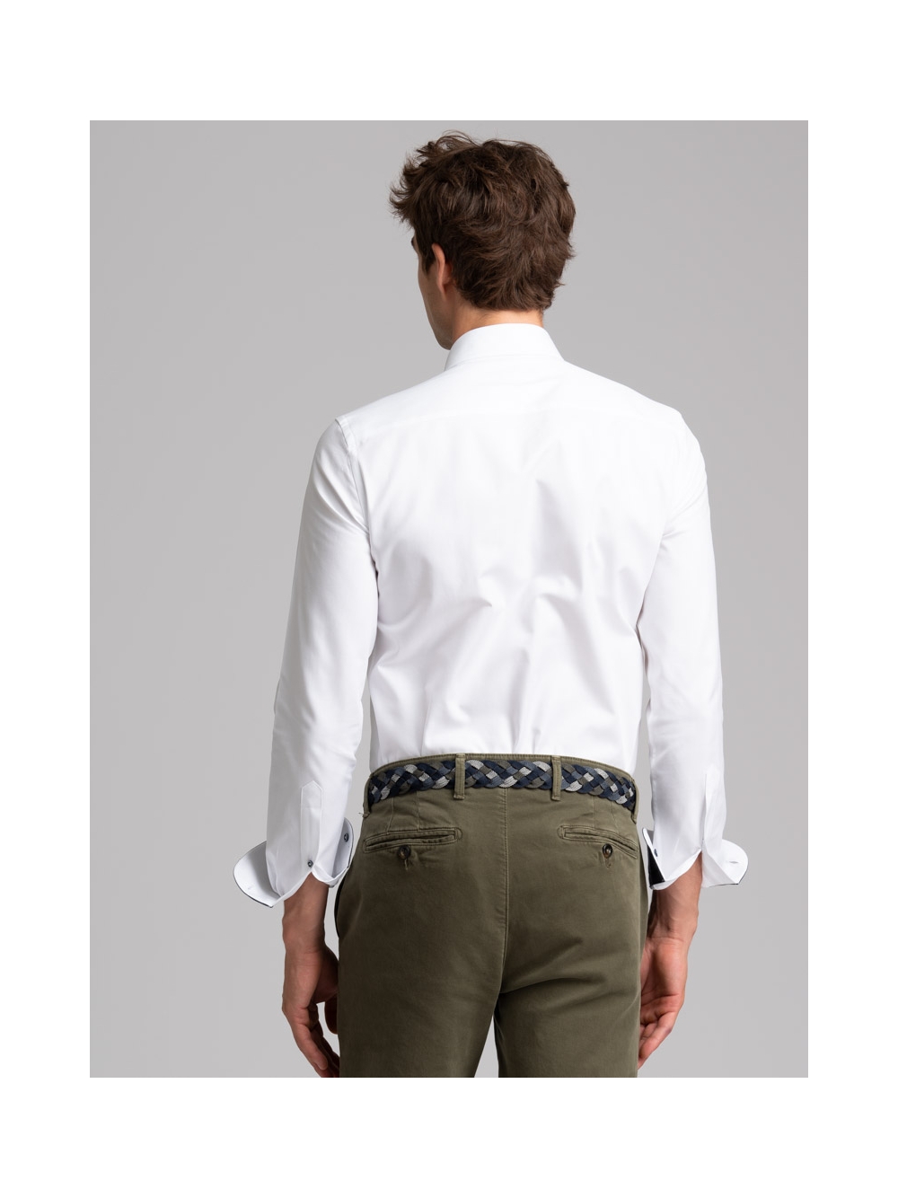 Camicia uomo con collo semifrancese in tessuto bianco base twill con fantasia a spina di pesce, inserti a contrasto e bottoni abbinati.
