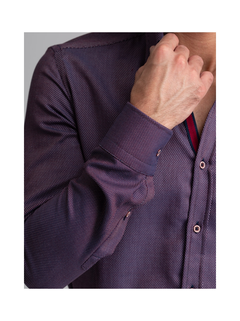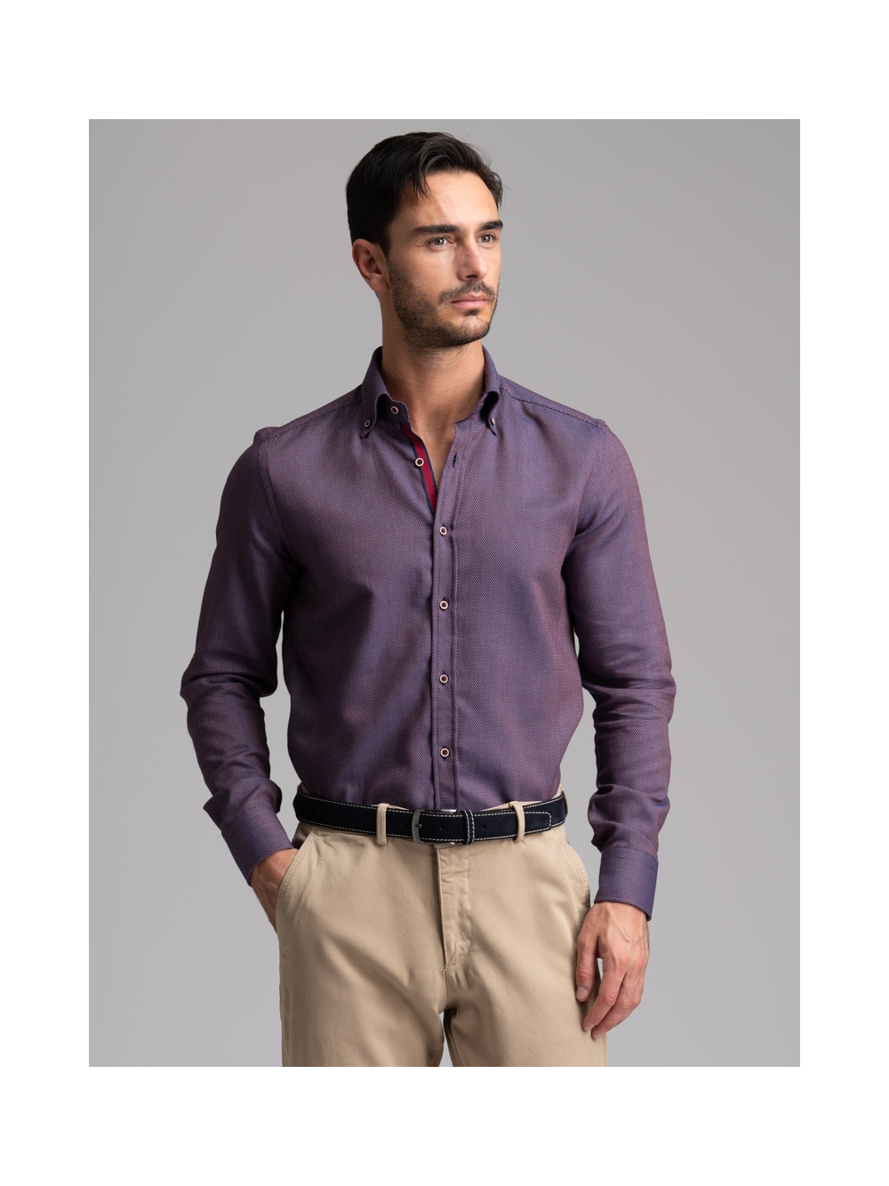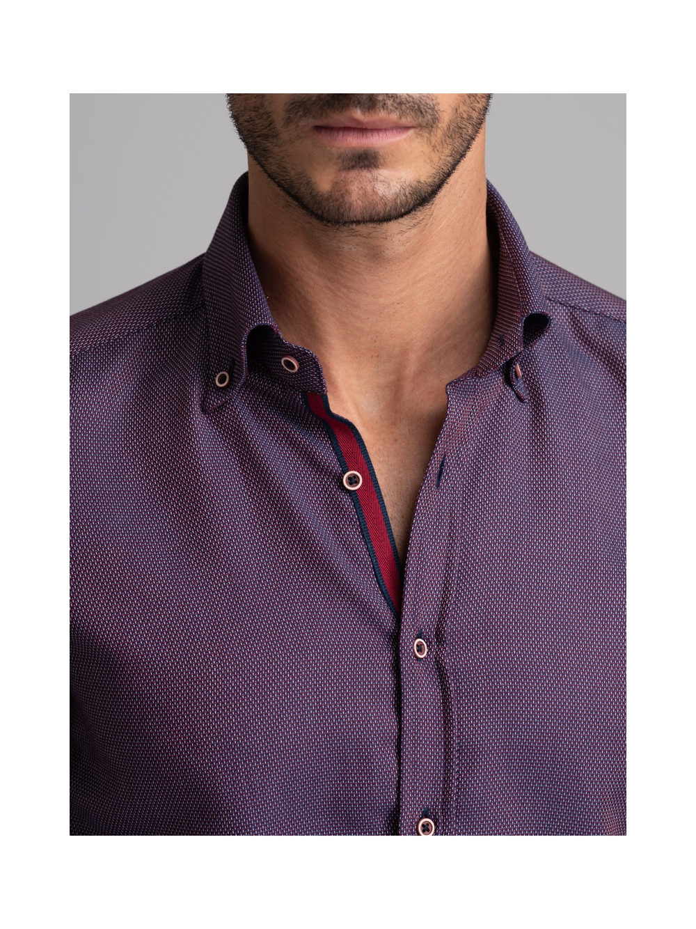 Camicia uomo con collo button down in tessuto micro armaturato bordeaux con nastro bicolore applicato nell’interno collo e bottoni contrasto.