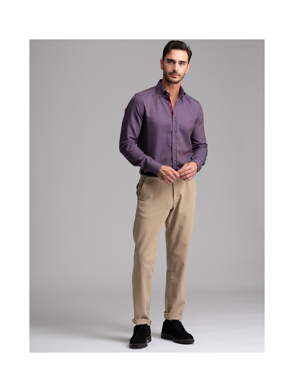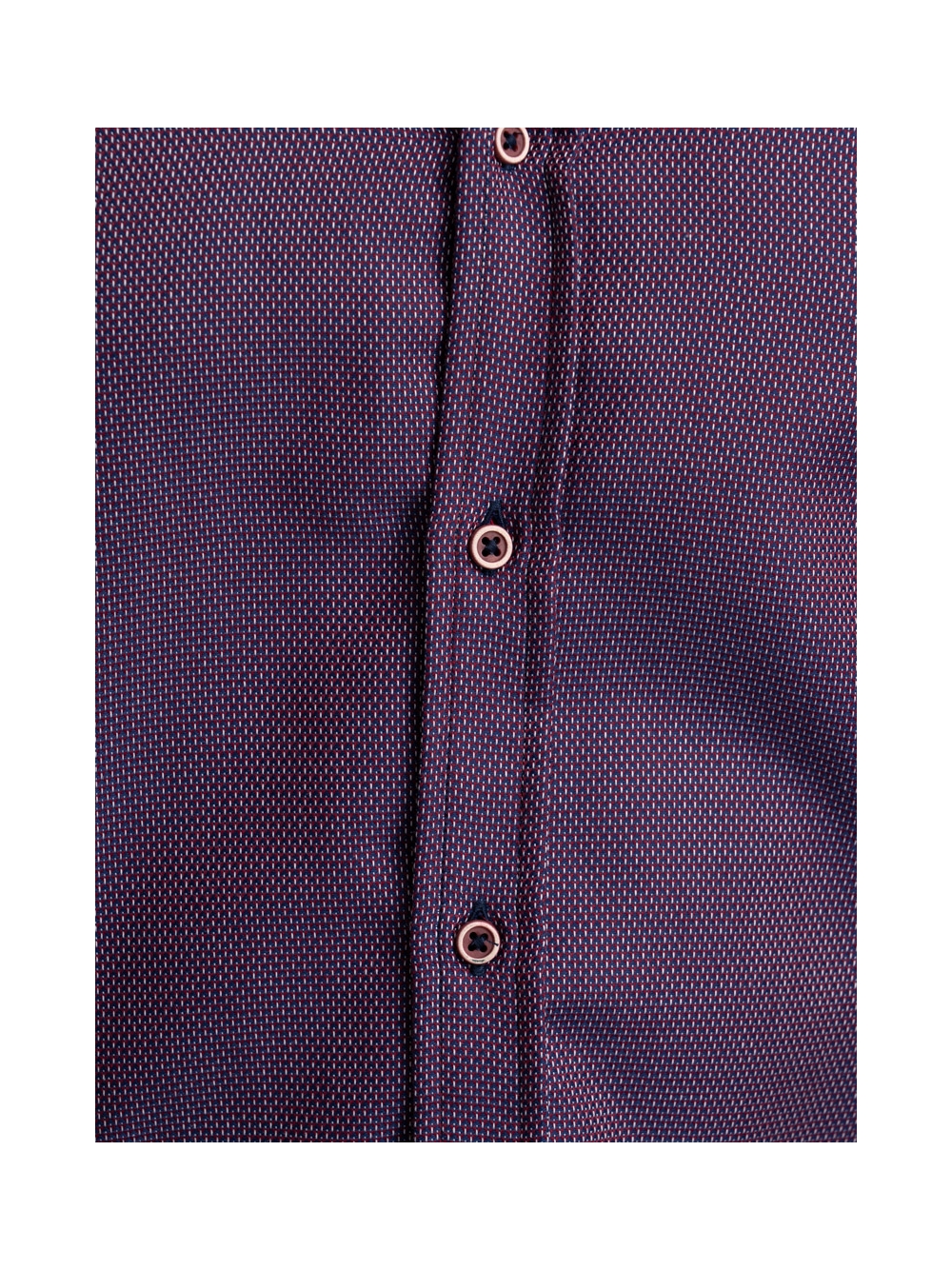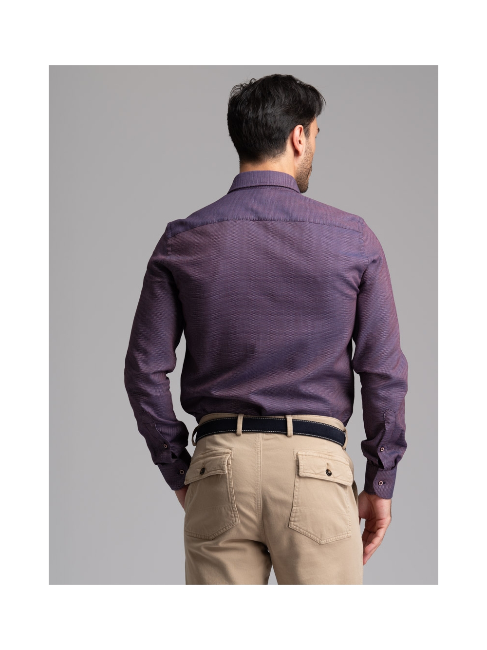 Camicia uomo con collo button down in tessuto micro armaturato bordeaux con nastro bicolore applicato nell’interno collo e bottoni contrasto.