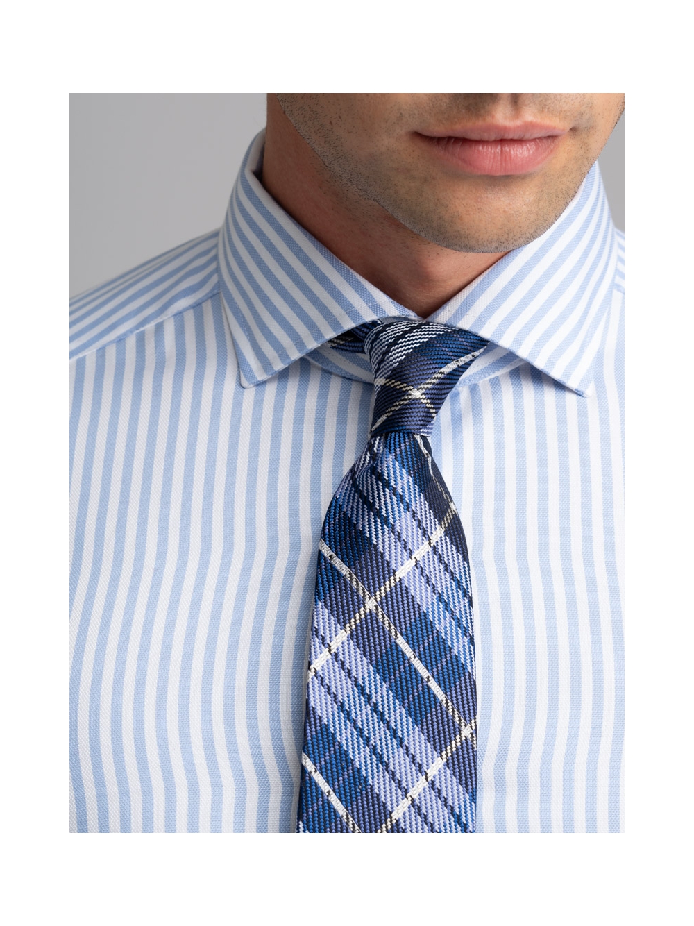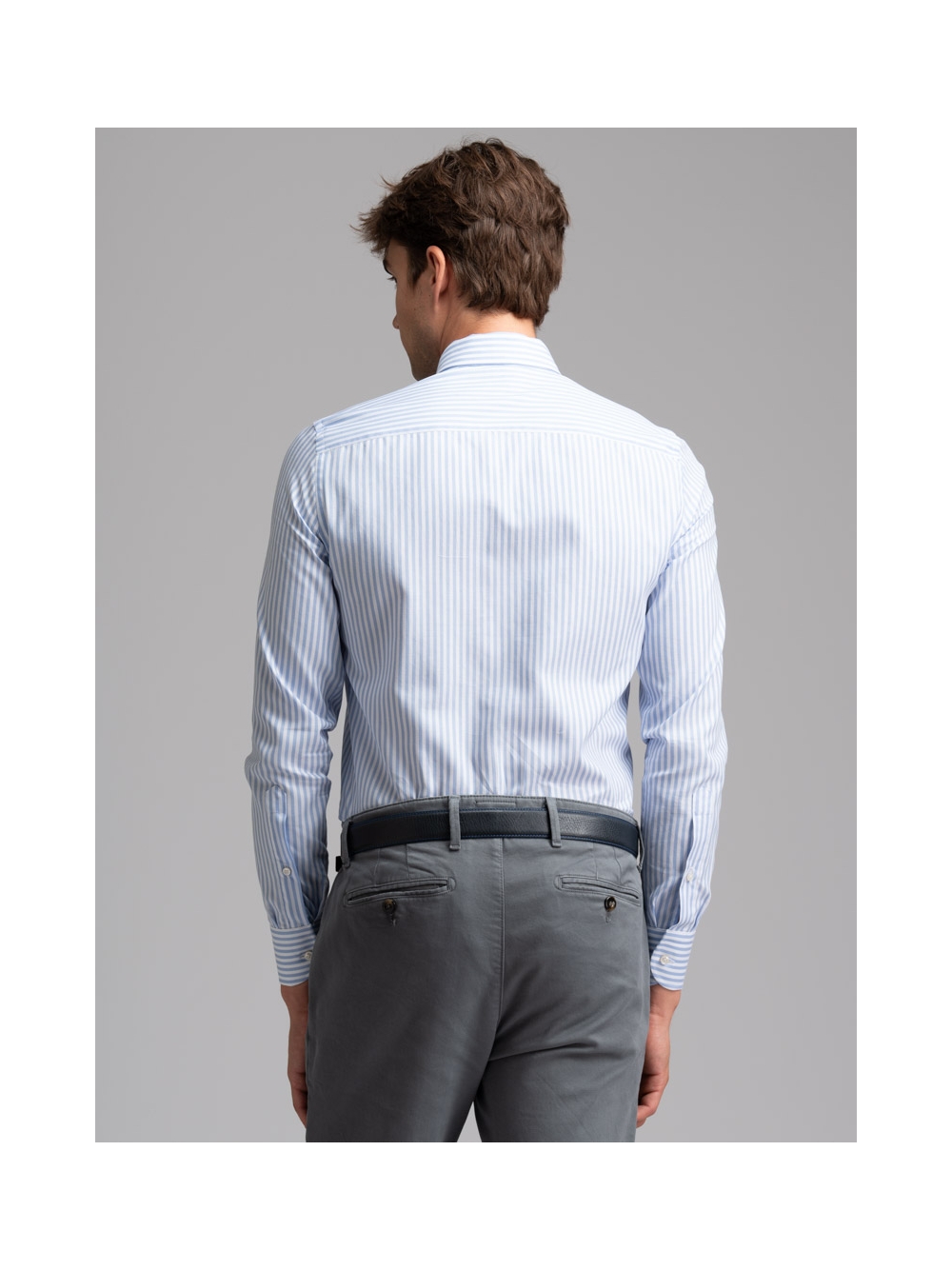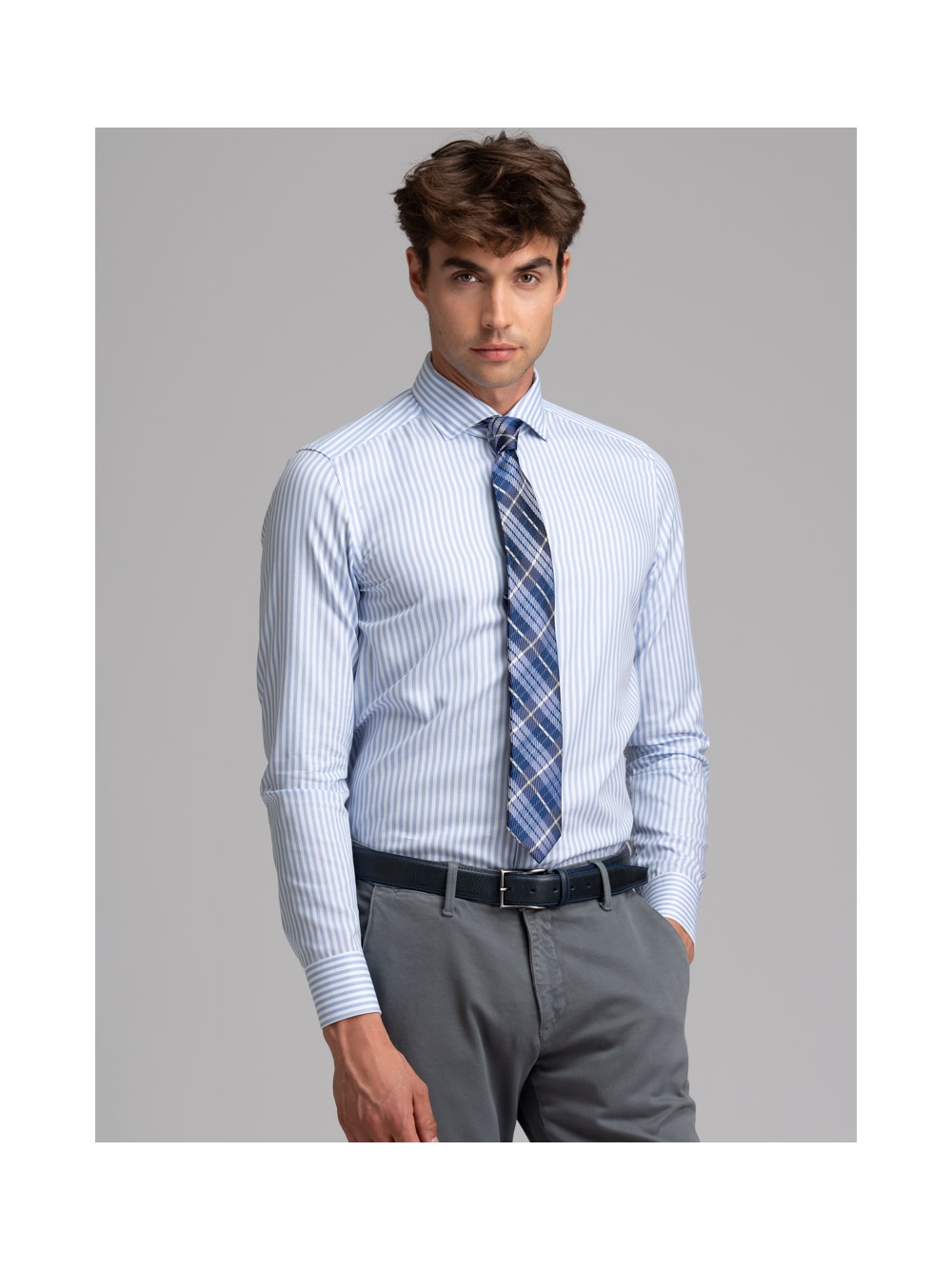 Camicia uomo con collo semi francese realizzata in tessuto di cotone giro inglese con fantasia a righe bianche e azzurre. Con la manica lunga e una vestibilità slim, questa è una camicia uomo office per una moda uomo elegante.