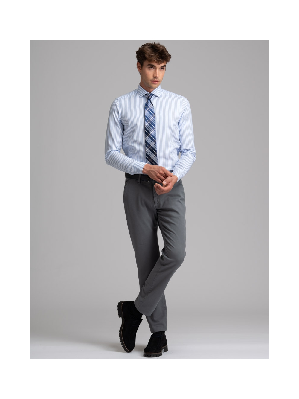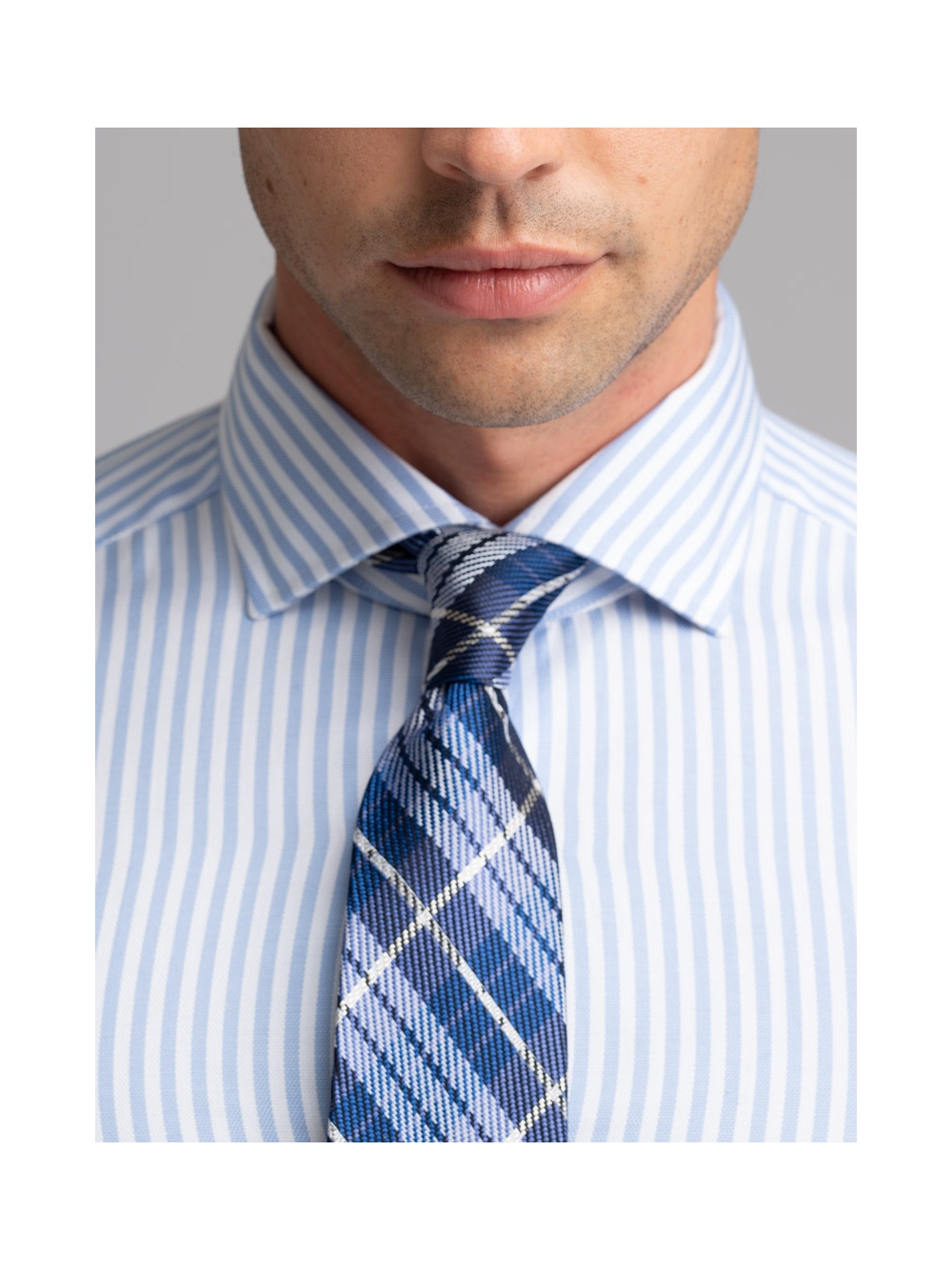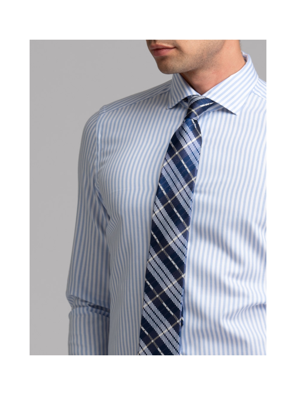 Camicia uomo con collo semi francese realizzata in tessuto di cotone giro inglese con fantasia a righe bianche e azzurre. Con la manica lunga e una vestibilità slim, questa è una camicia uomo office per una moda uomo elegante.