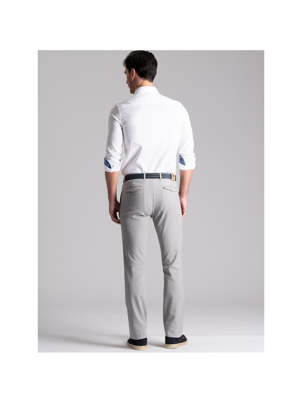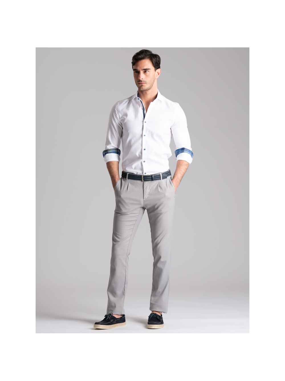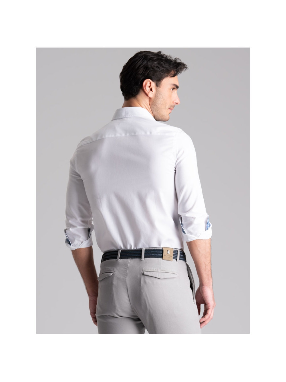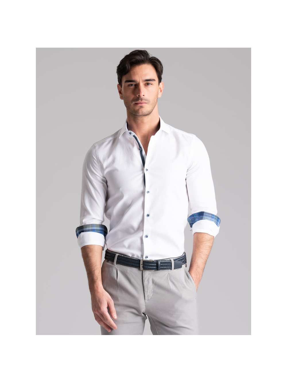 Camicia uomo bianca con collo semi francese in tessuto operato giro inglese con inserti in tessuto nell’interno collo, polsi e mosca.