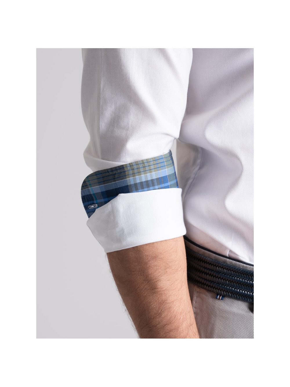 Camicia uomo con collo semi francese realizzata in tessuto di cotone operato giro inglese tinta unita bianco, a manica lunga e vestibilità slim. La camicia è arricchita da un inserto in tessuto fantasia madras multicolore sui polsi, la mosca e nell’interno collo, nastro gros grain lungo il canolo e bottoni bicolore blu avio e azzurro.