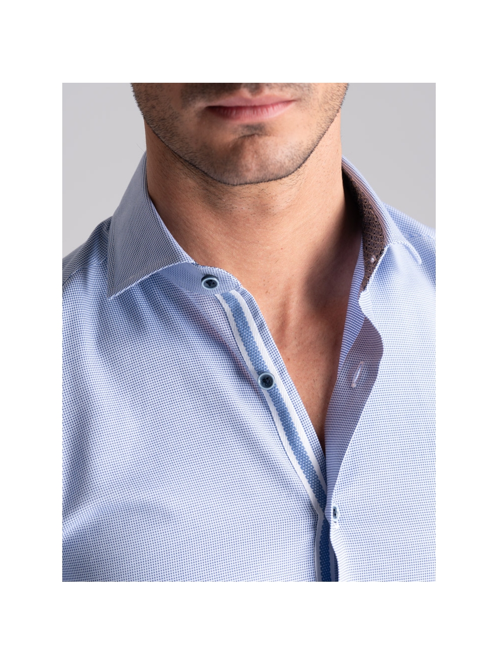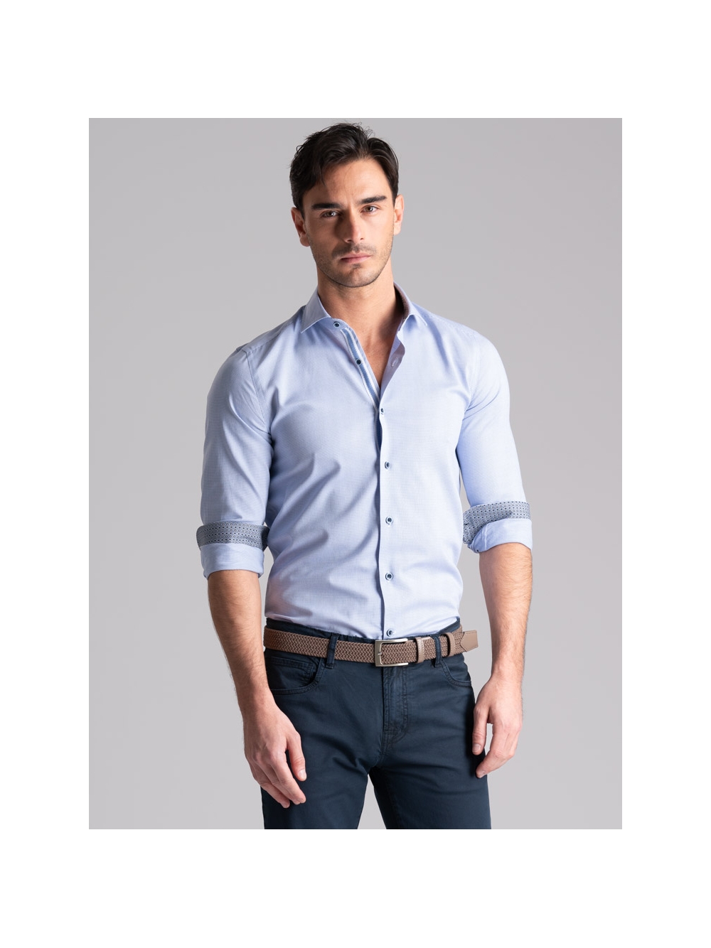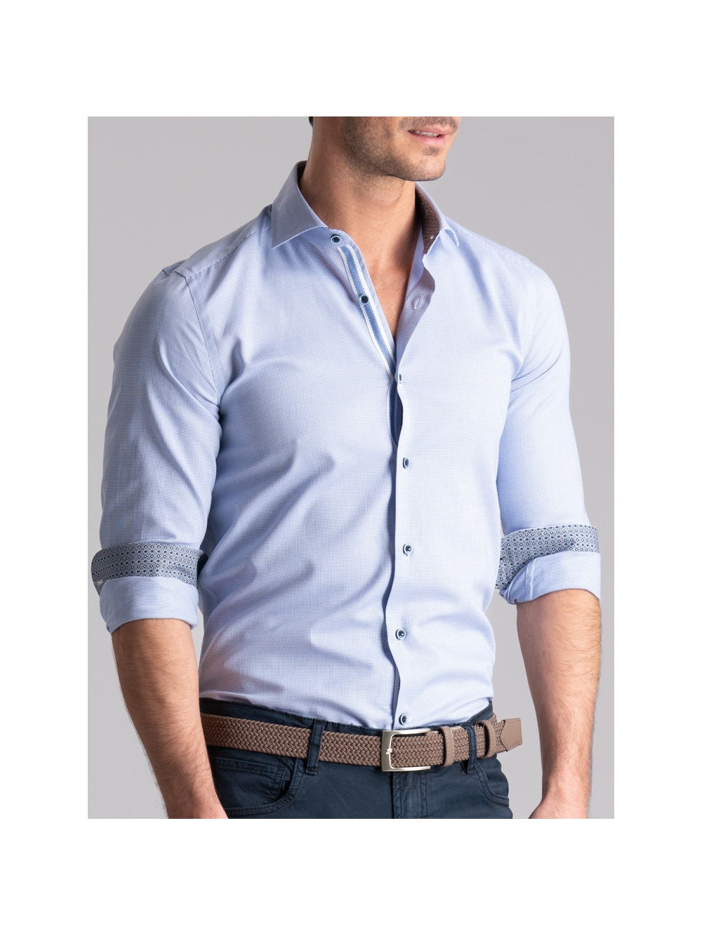 Camicia uomo con collo semi francese realizzata in tessuto micro armaturato tinta unita azzurro, a manica lunga e vestibilità slim. La camicia è arricchita da un inserto in tessuto micro stampa nei toni del bianco e del blu nell’interno collo, mosca e polsi, nastro applicato lungo il canolo e bottoni bicolore avio e azzurro.