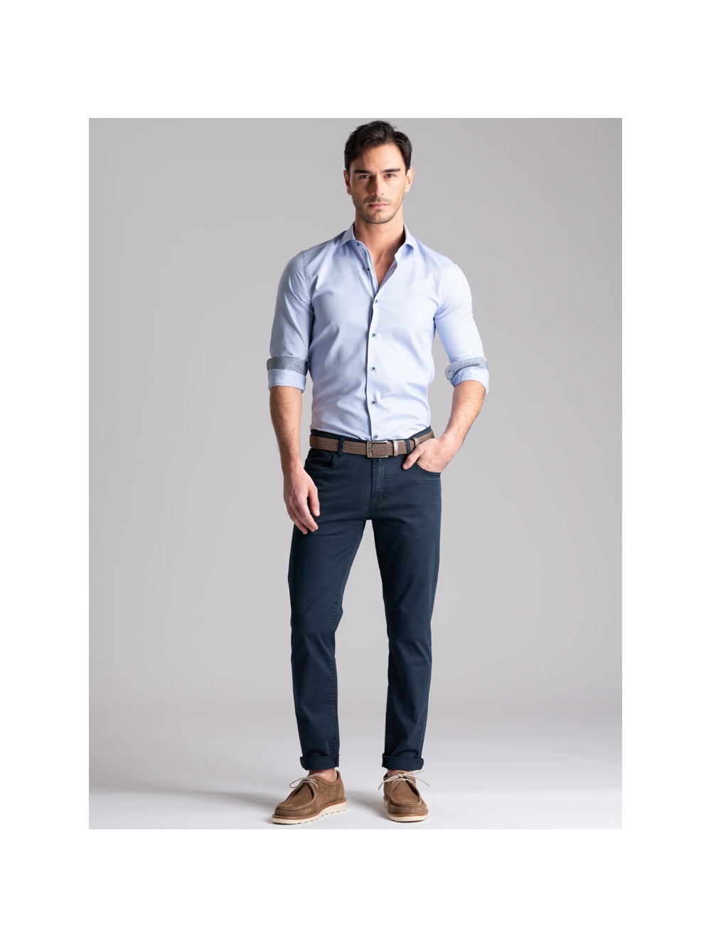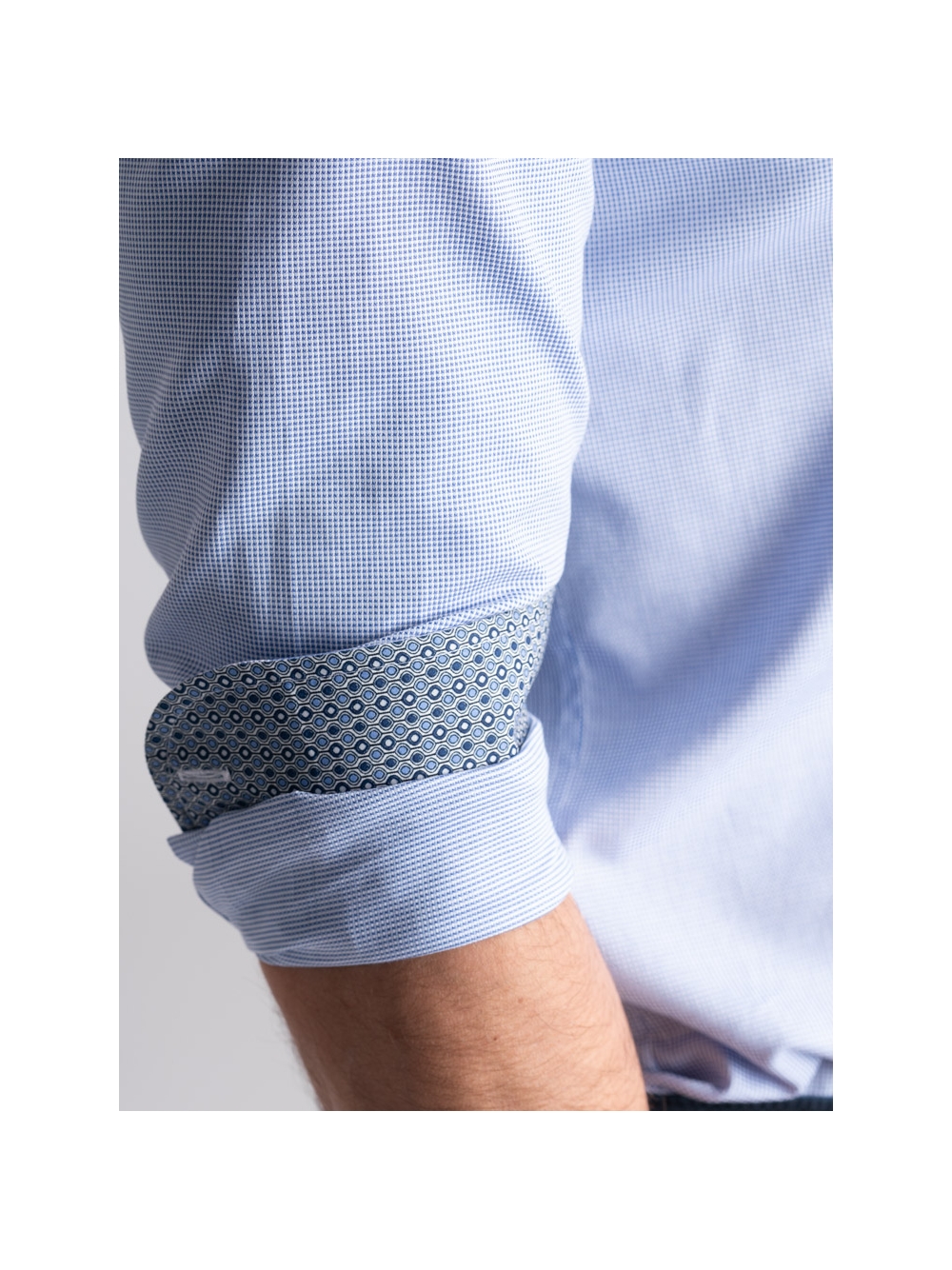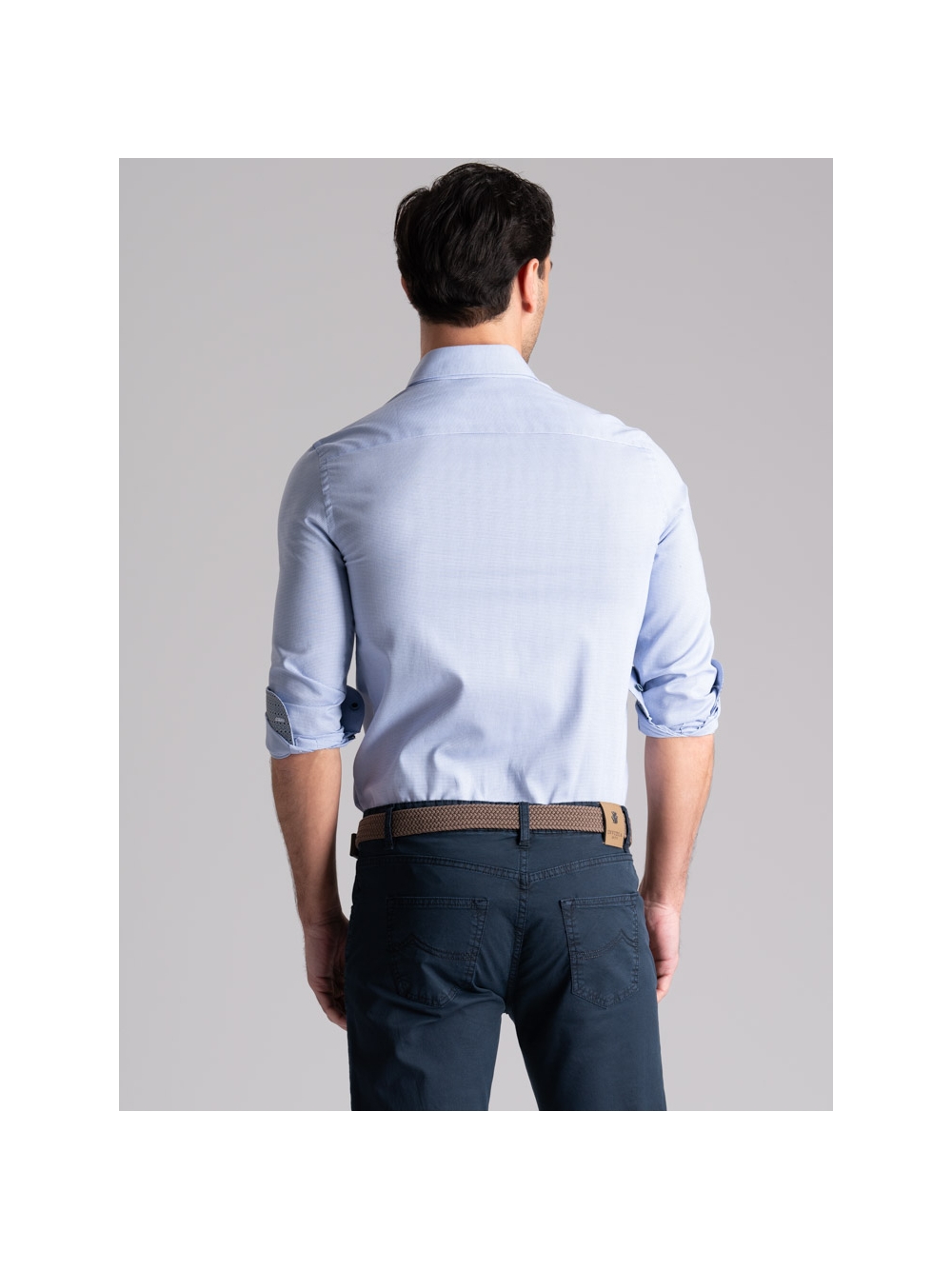 Camicia uomo con collo semi francese realizzata in tessuto micro armaturato tinta unita azzurro, a manica lunga e vestibilità slim. La camicia è arricchita da un inserto in tessuto micro stampa nei toni del bianco e del blu nell’interno collo, mosca e polsi, nastro applicato lungo il canolo e bottoni bicolore avio e azzurro.