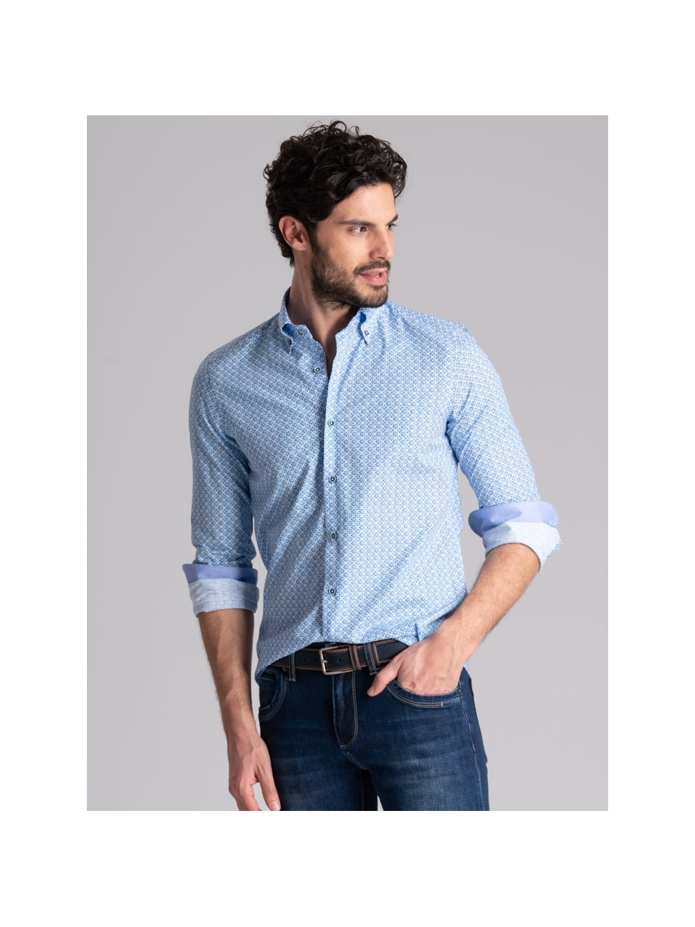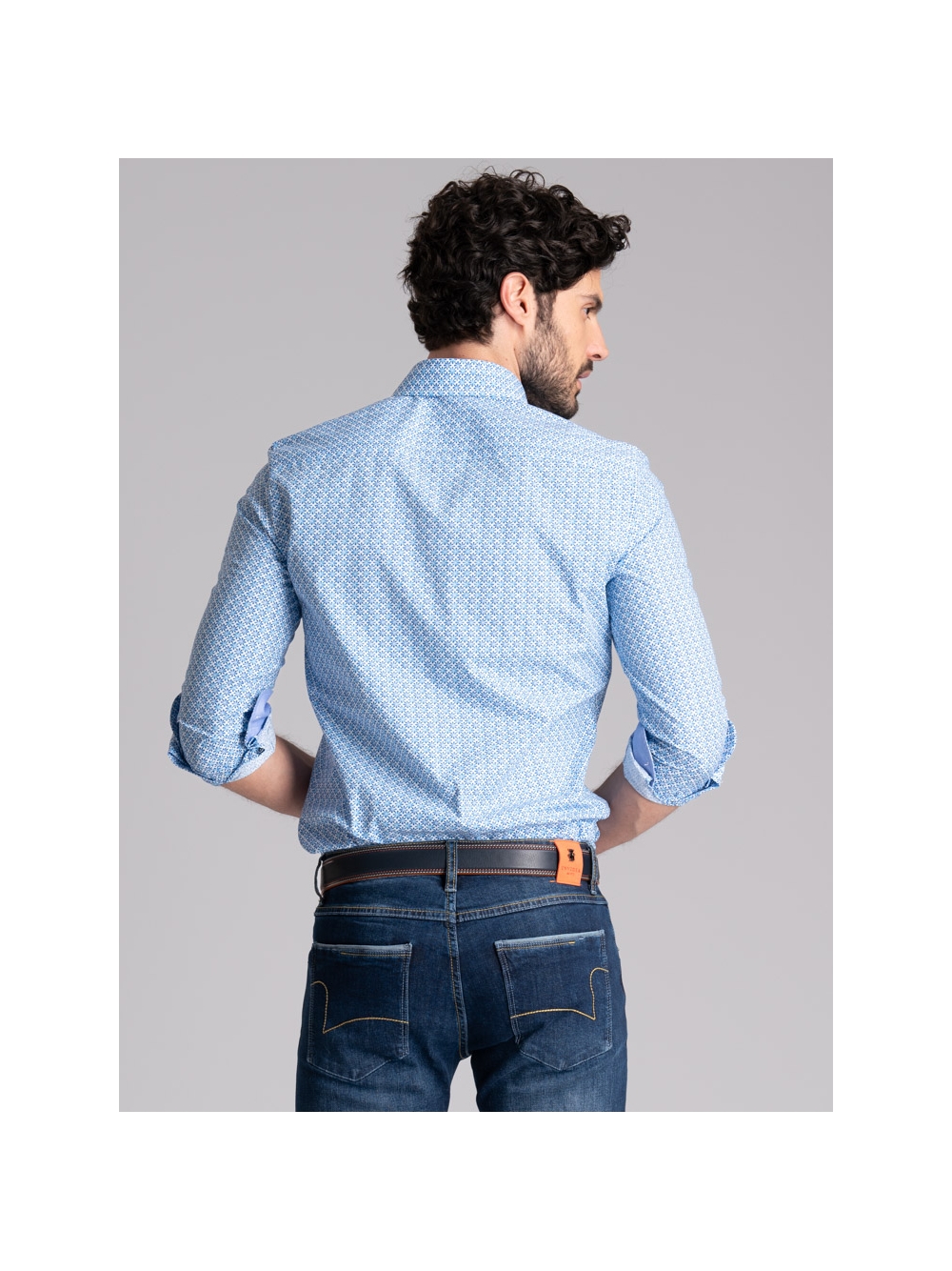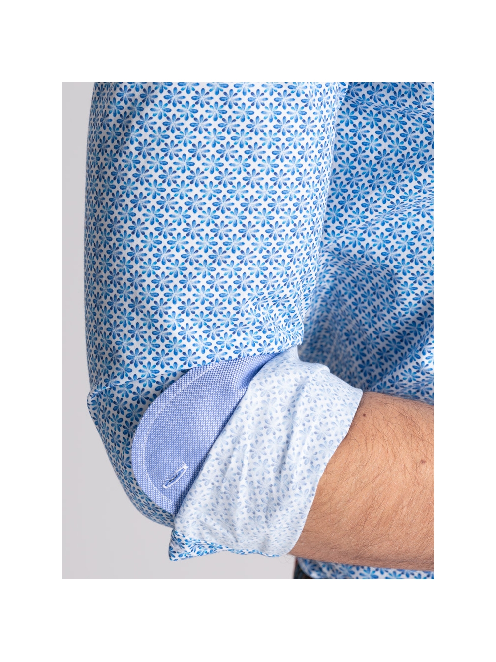 Camicia uomo con collo semi francese realizzata in tessuto popeline fantasia fiorellino nei toni dell’azzurro e del rosso, a manica lunga e vestibilità slim. La camicia è arricchita da un nastro applicato all'interno del collo, e bottoni bicolore blu e bianco.