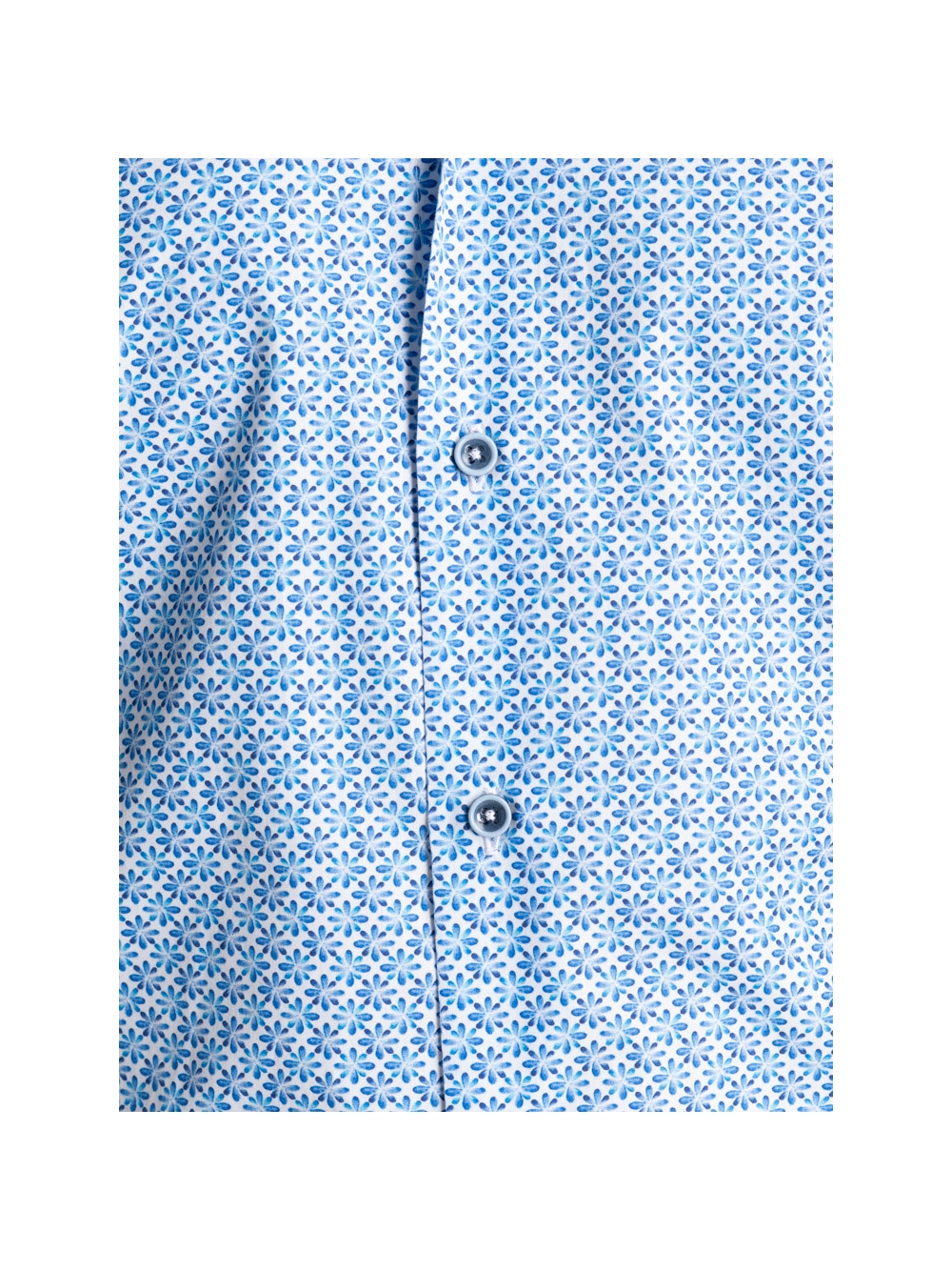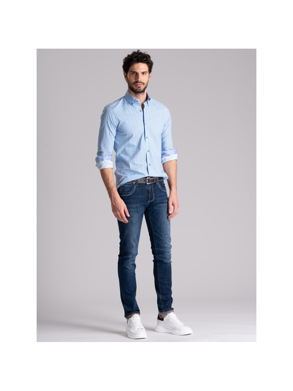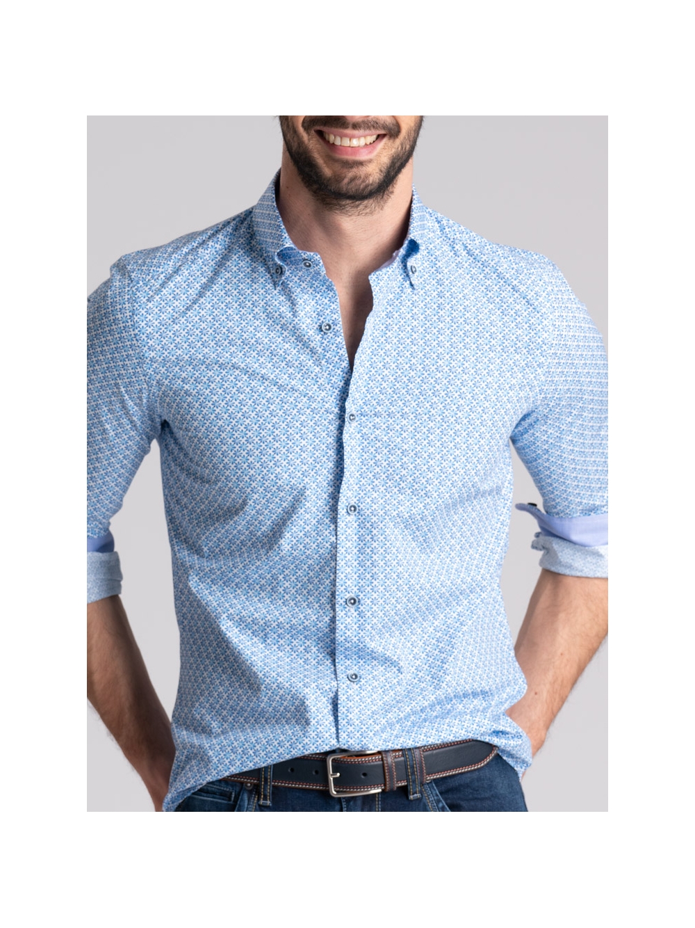Camicia uomo con collo semi francese realizzata in tessuto popeline fantasia fiorellino nei toni dell’azzurro e del rosso, a manica lunga e vestibilità slim. La camicia è arricchita da un nastro applicato all'interno del collo, e bottoni bicolore blu e bianco.