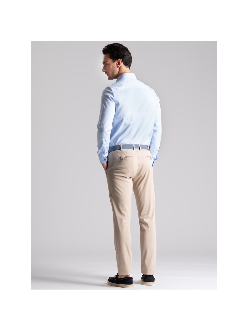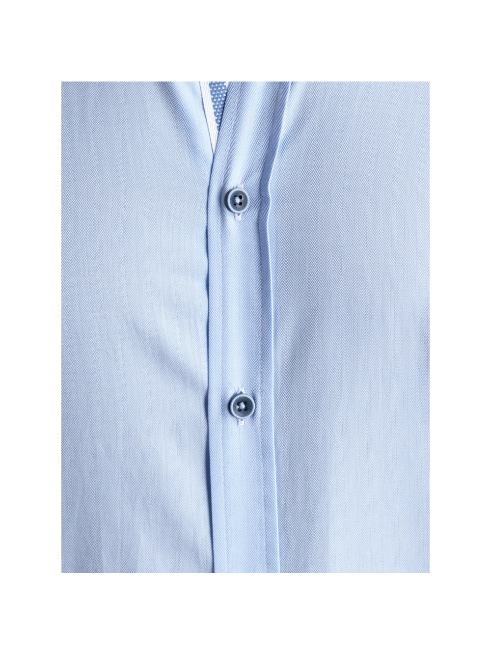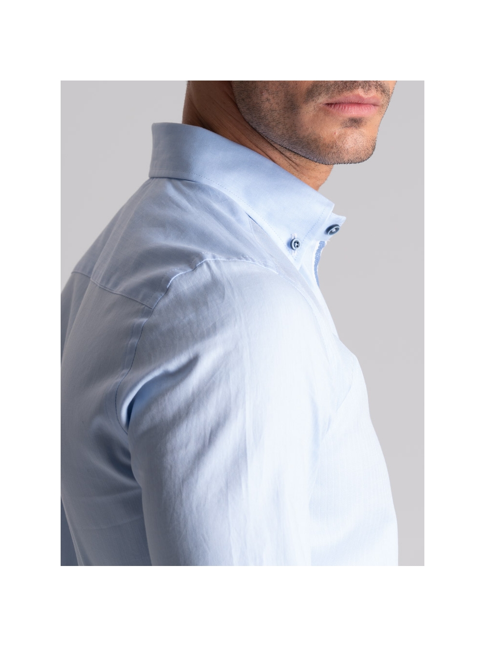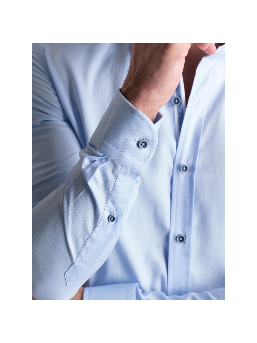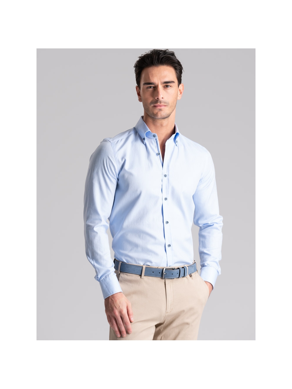 Camicia uomo con collo button down realizzata in tessuto a spina di pesce tinta unita azzurra, a manica lunga e vestibilità slim. La camicia è arricchita da un inserto in gros grain lungo il canolo e l’interno collo, e bottoni bicolore avio e azzurro.