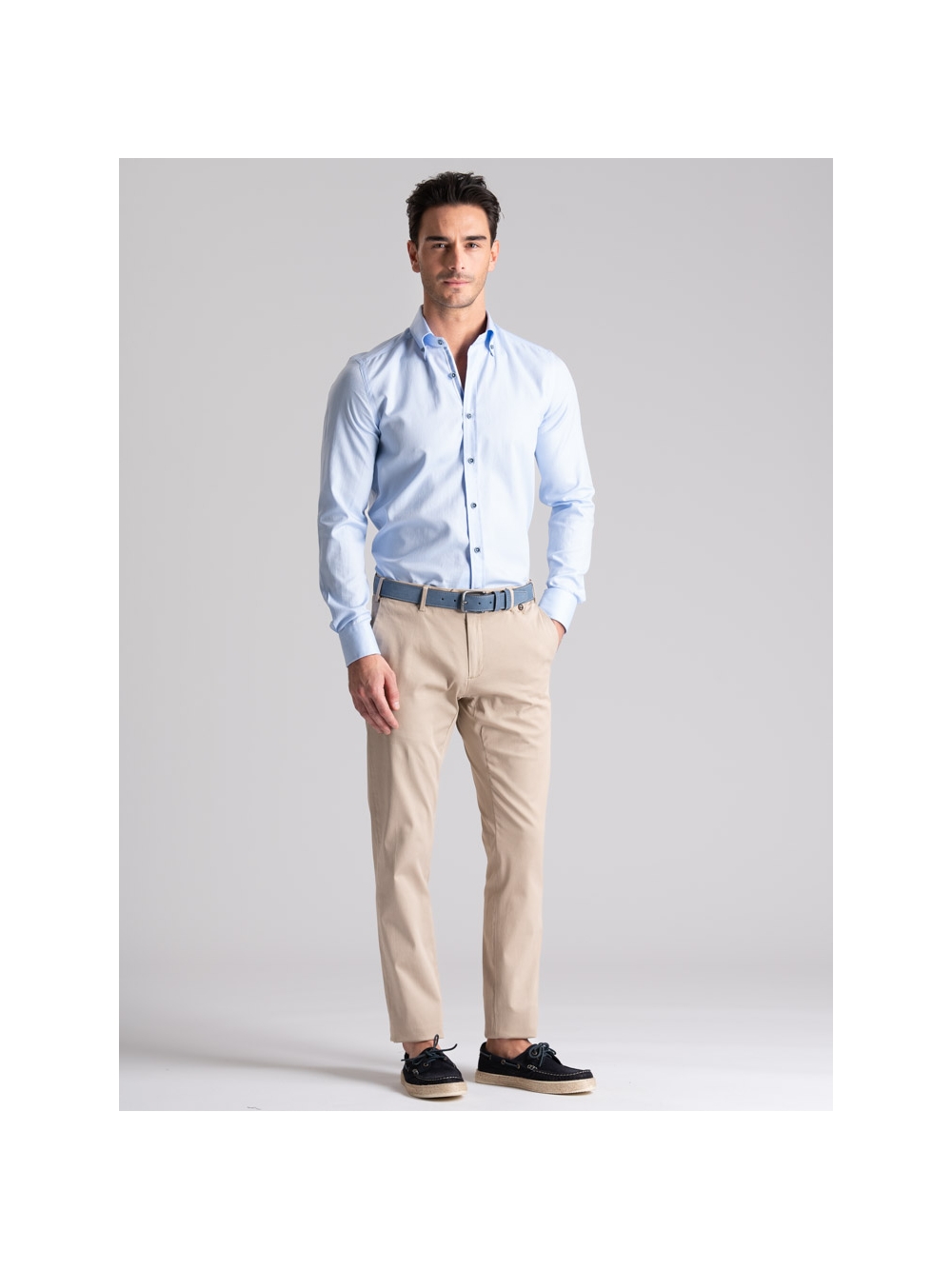 Camicia uomo azzurra con collo button down in tessuto spina di pesce con inserti in gros grain lungo il canolo e l’interno collo.