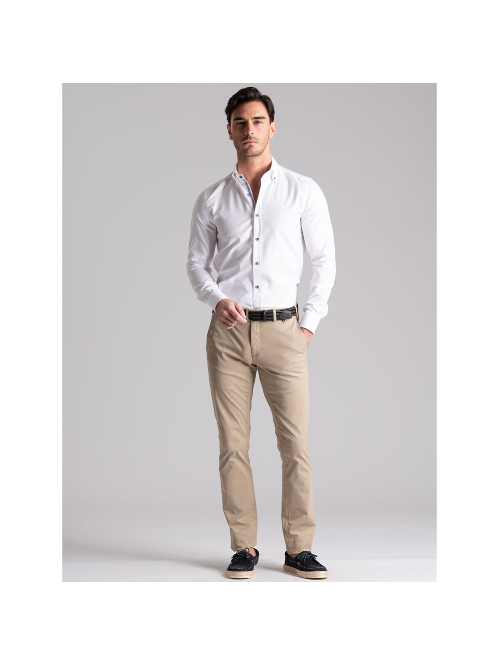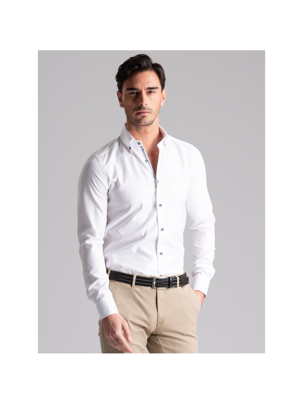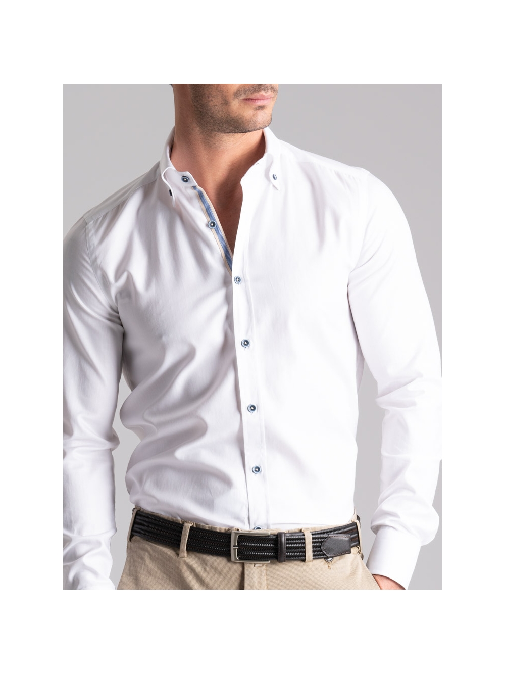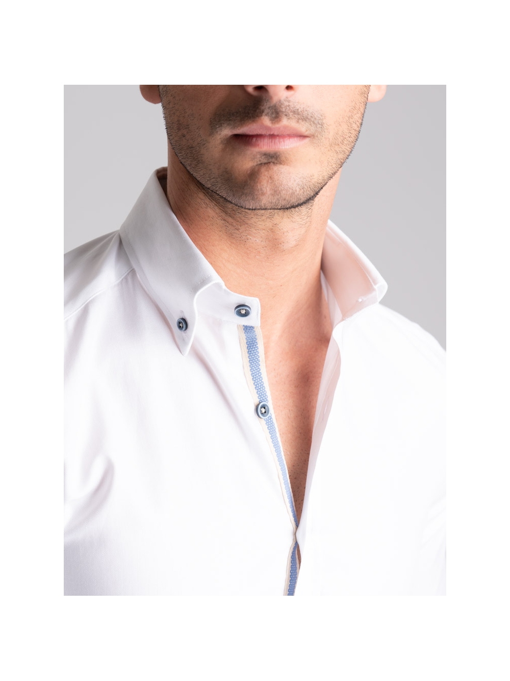 Camicia uomo bianca con collo button down in tessuto spina di pesce con inserti in gros grain lungo il canolo e l’interno collo.