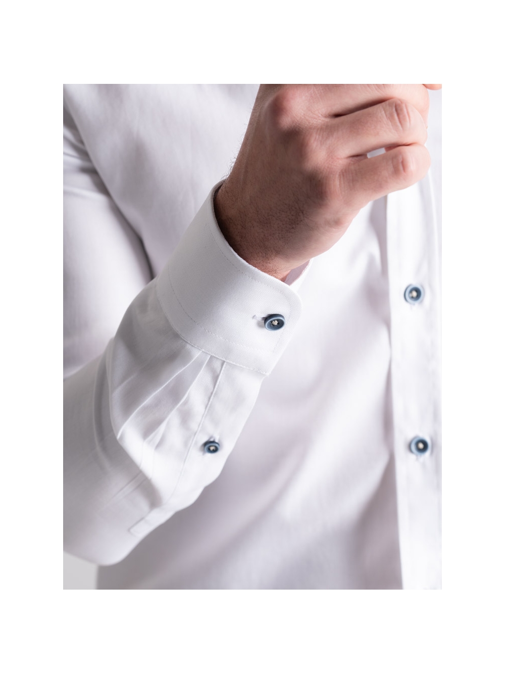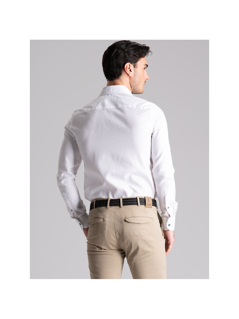 Camicia uomo con collo button down realizzata in tessuto a spina di pesce tinta unita bianca, a manica lunga e vestibilità slim. La camicia è arricchita da un inserto in gros grain lungo il canolo e l’interno collo, e bottoni bicolore avio e azzurro.