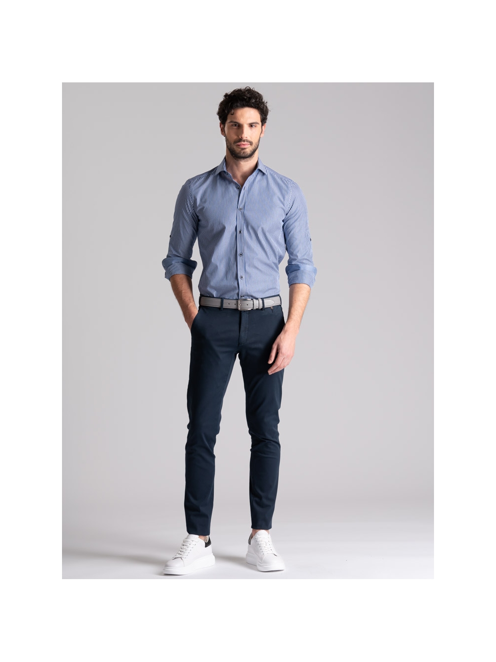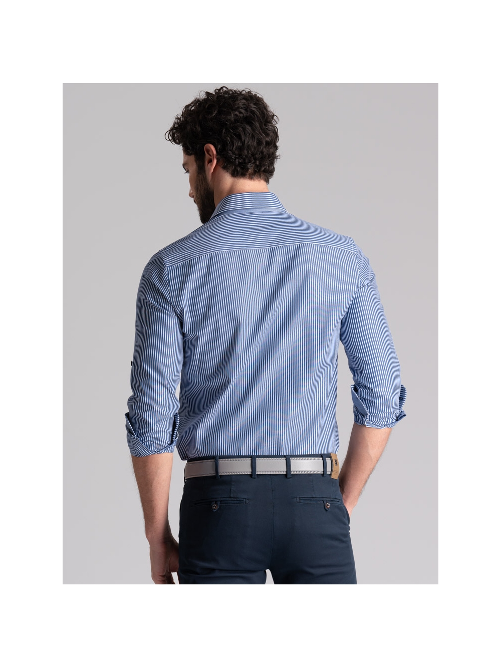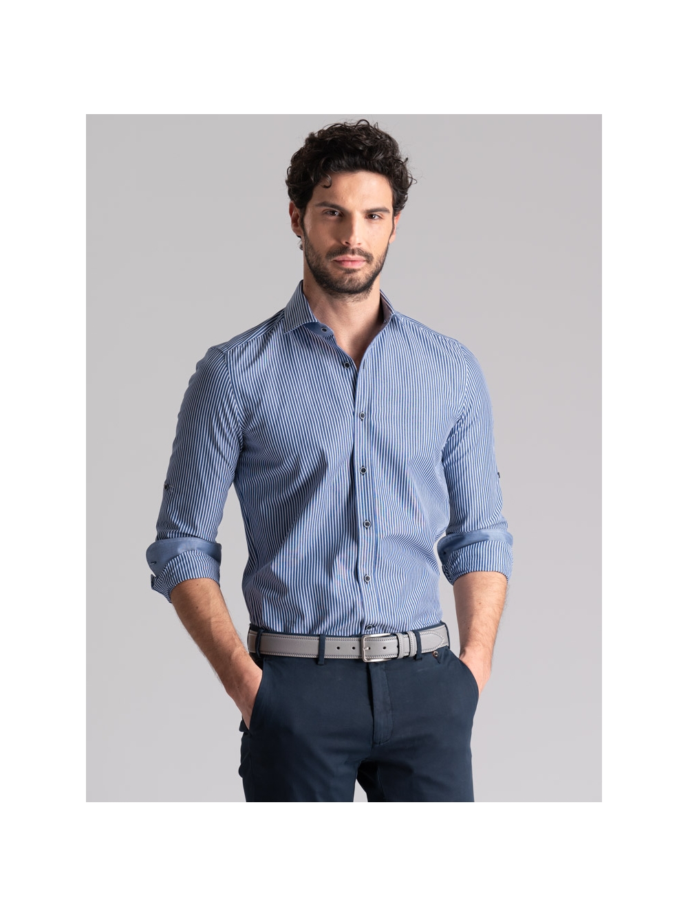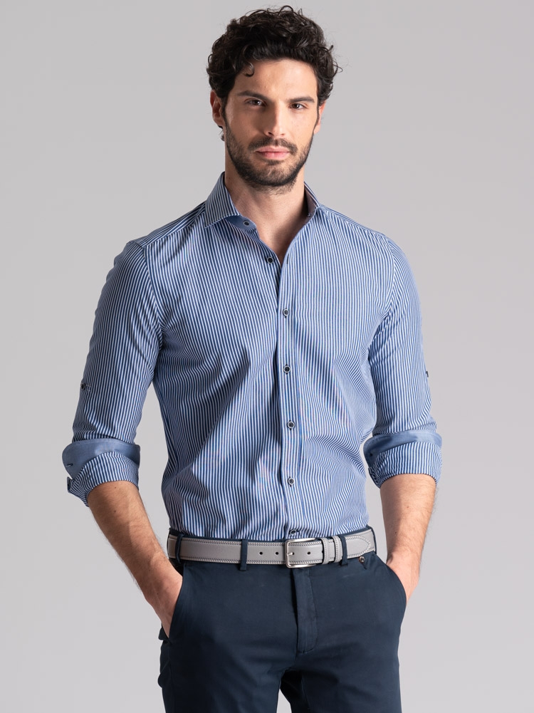 Camicia uomo con collo semi francese realizzata in tessuto popeline a righe blu e bianco, a manica lunga e vestibilità slim. La camicia è arricchita da un inserto in tessuto di colore a contrasto nell’interno collo, mosca e polsi, e bottoni bicolore blu e bianco.