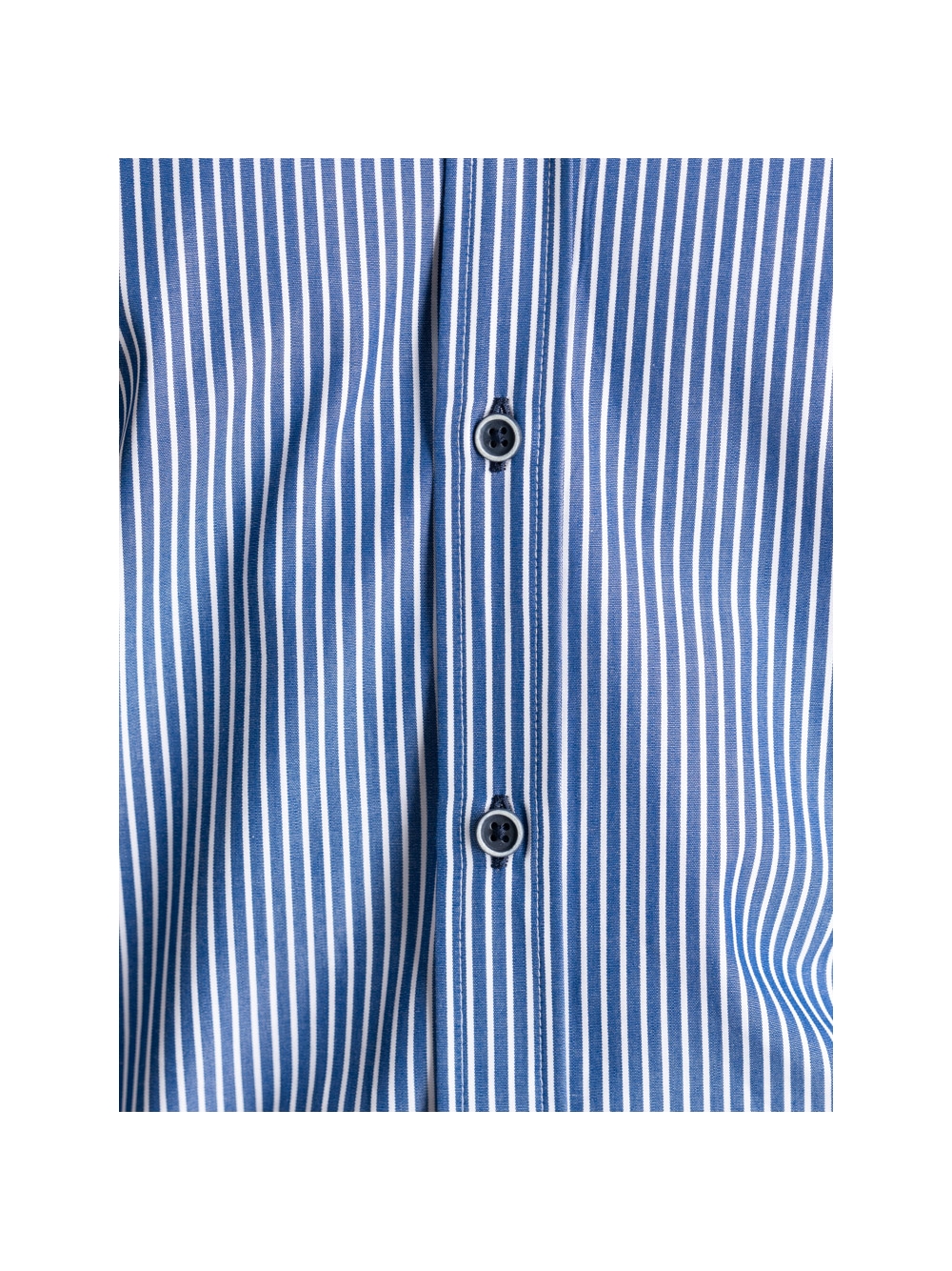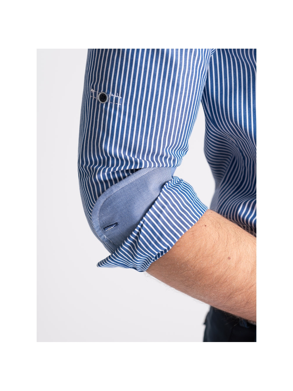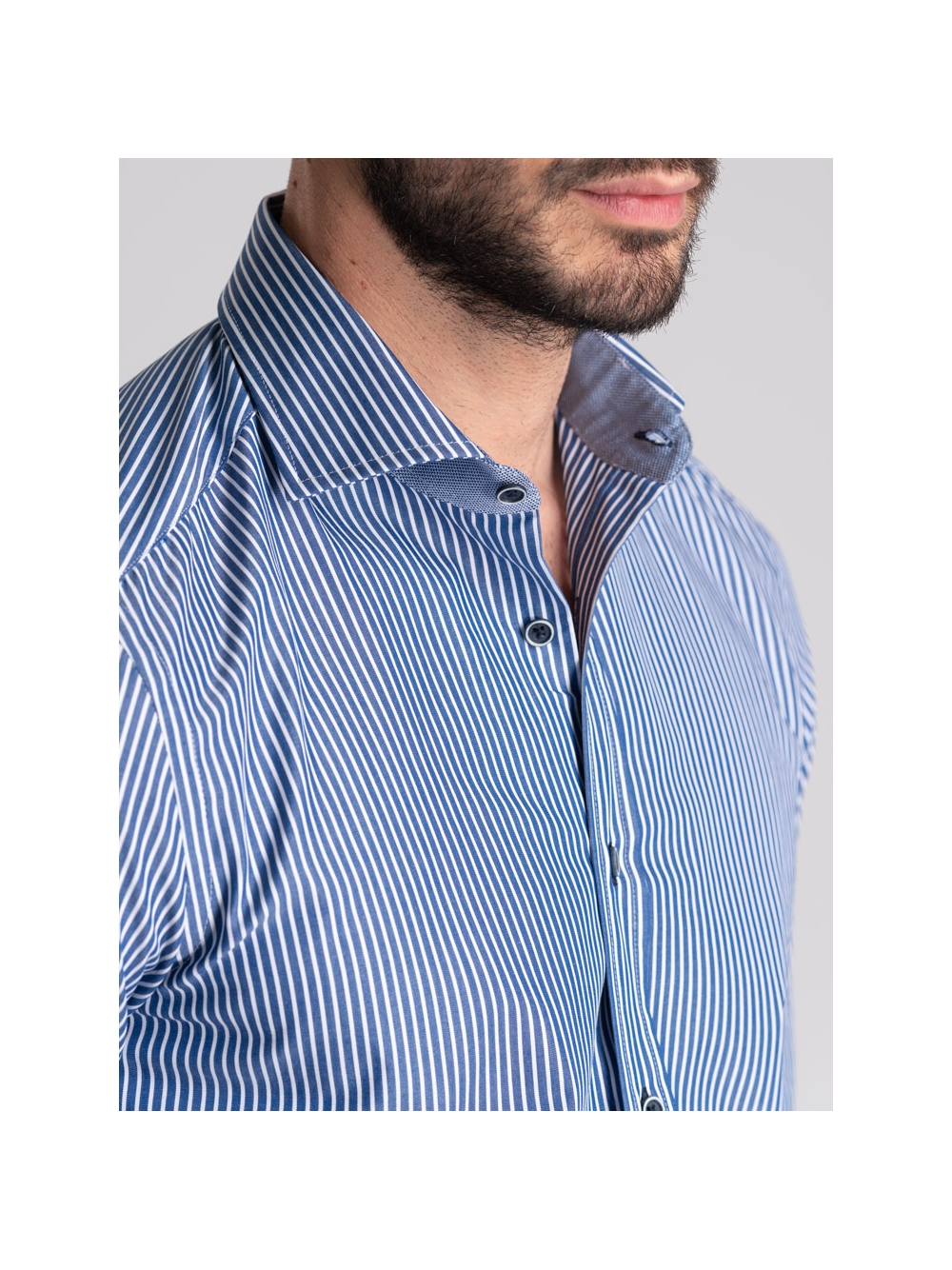 Camicia uomo rigata blu e bianco con collo semi francese in popeline di cotone con alamaro e interno lista e polsi a contrasto.
