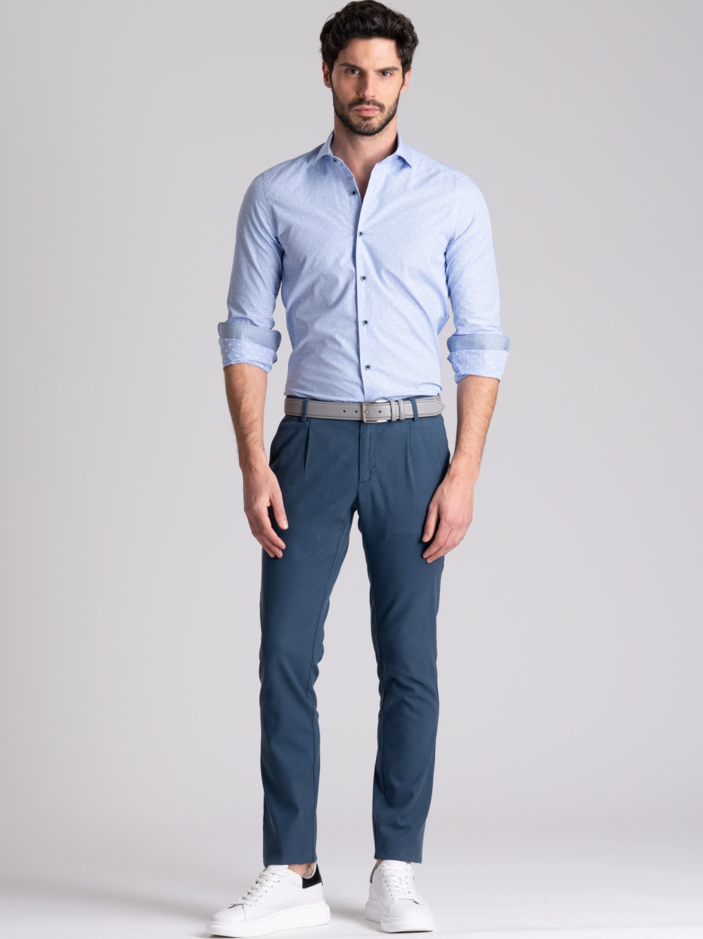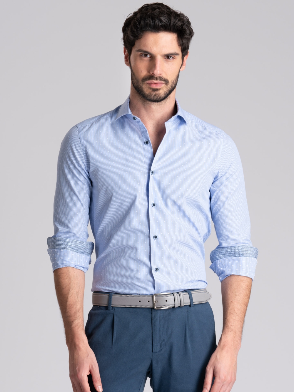 Camicia uomo con collo semi francese realizzata in tessuto fil coupé a righe azzurre e bianche, a manica lunga e vestibilità slim. La camicia è arricchita da un inserto in tessuto micro stampa geometrica nell’interno collo e polsi e bottoni bicolore avio e azzurro.