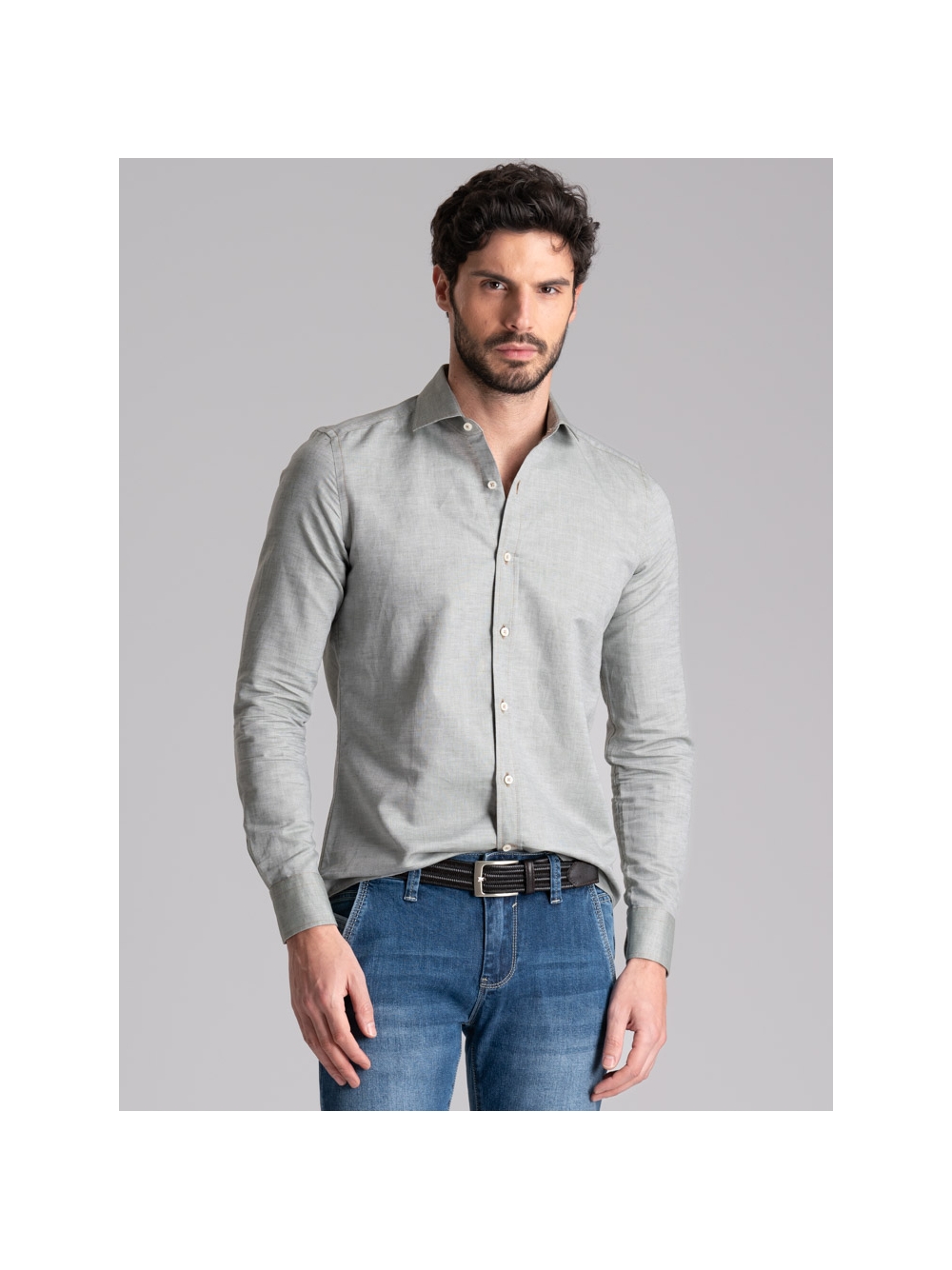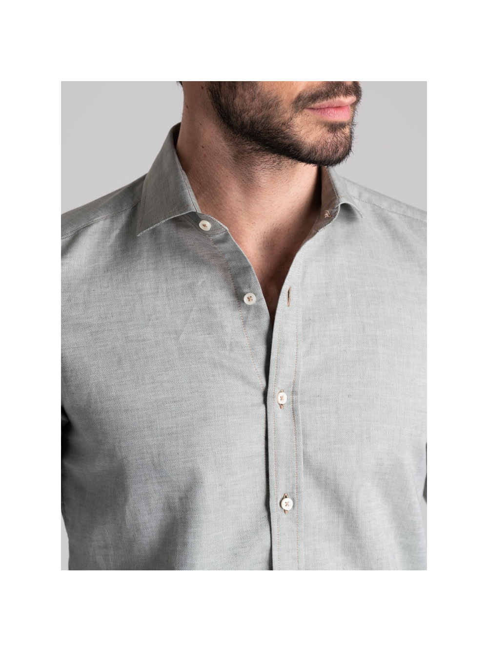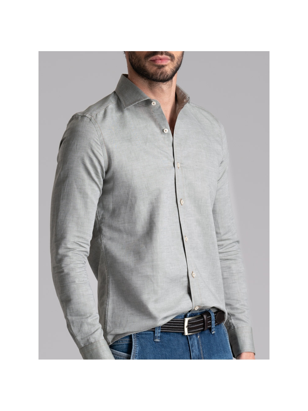 Camicia uomo con collo semi francese realizzata in tessuto misto lino tinta unita verde, a manica lunga e vestibilità slim. La camicia è arricchita da cuciture a contrasto color sabbia.
