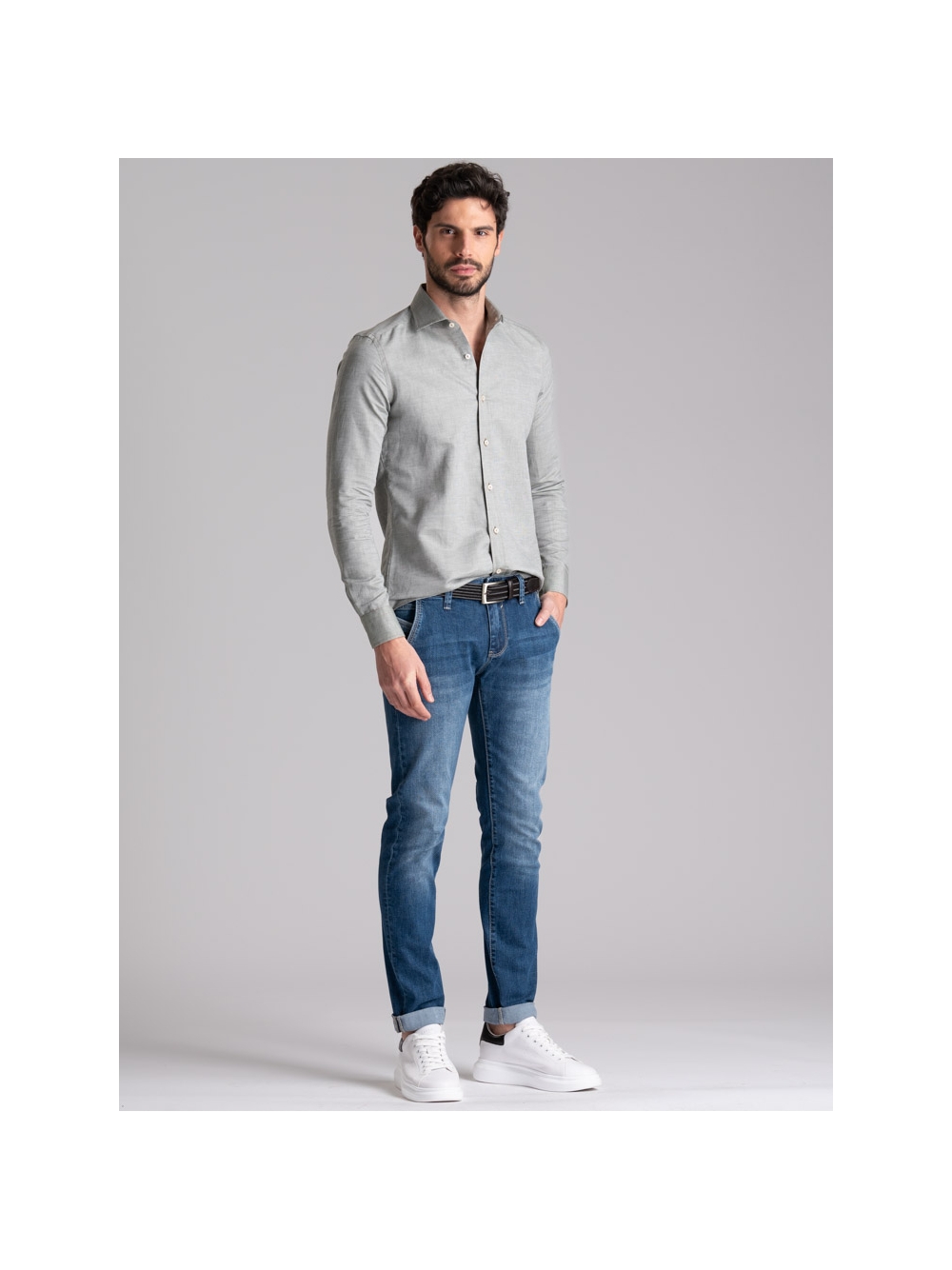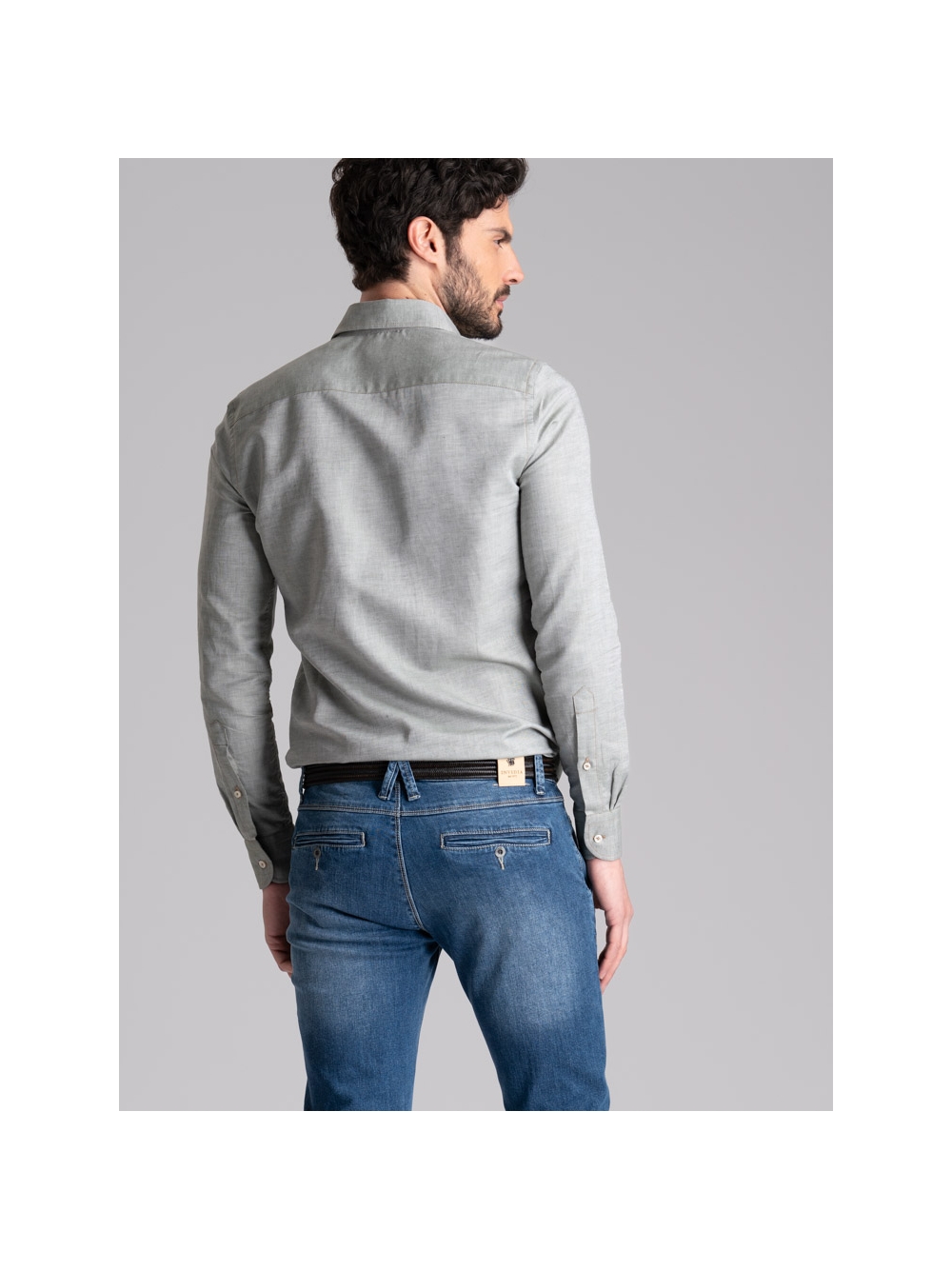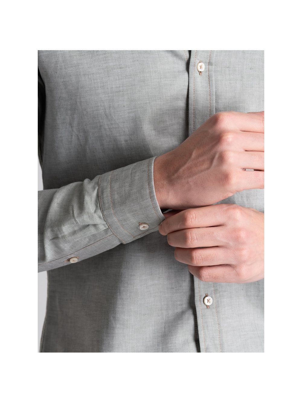 Camicia uomo con collo semi francese realizzata in tessuto misto lino tinta unita verde, a manica lunga e vestibilità slim. La camicia è arricchita da cuciture a contrasto color sabbia.