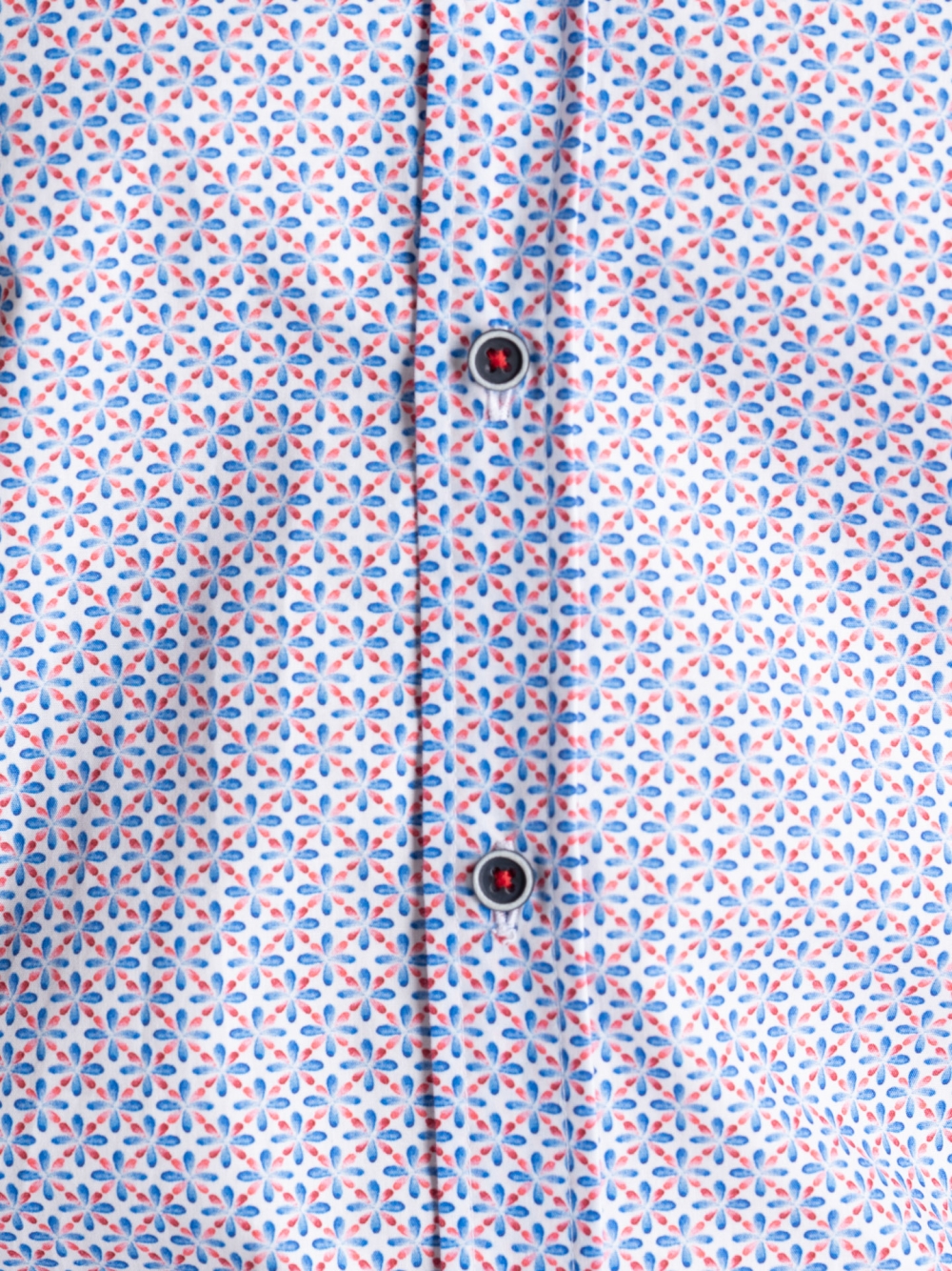 Camicia uomo con collo semi francese realizzata in tessuto popeline fantasia fiorellino nei toni dell’azzurro e del rosso, a manica lunga e vestibilità slim. La camicia è arricchita da un nastro applicato all'interno del collo, e bottoni bicolore blu e bianco.