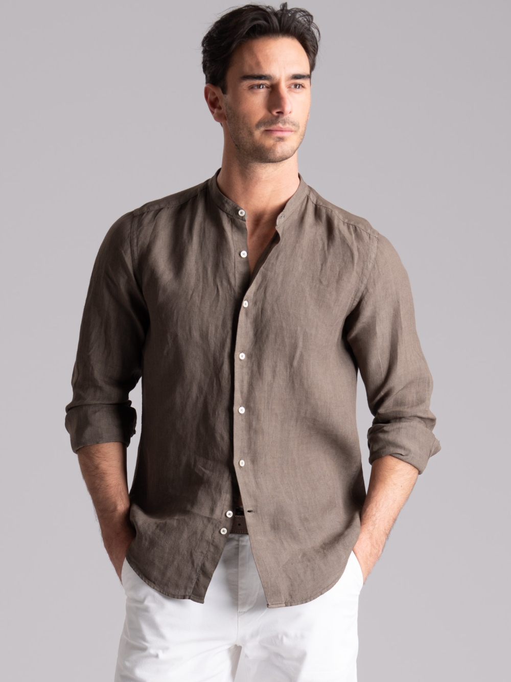 Camicia uomo realizzata in tessuto 100% lino tinto capo con collo alla coreana, fresca e giovanile per una moda uomo casual.