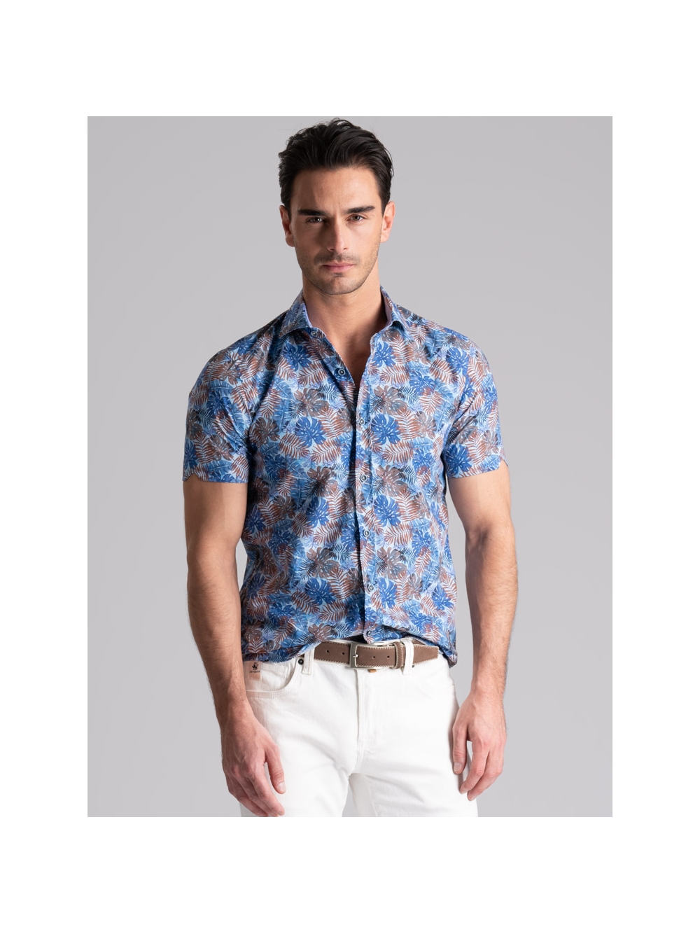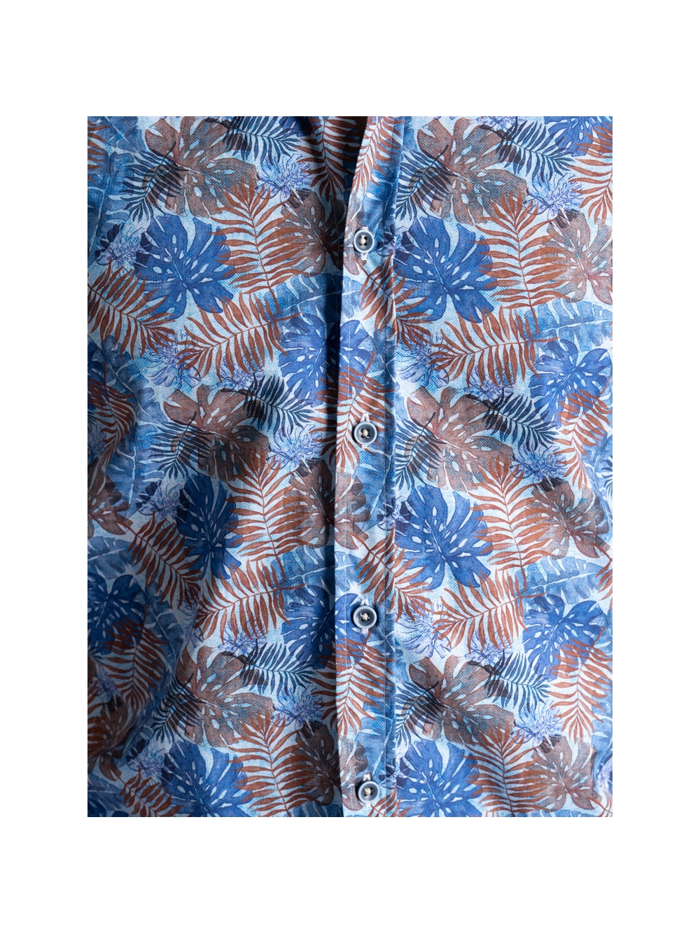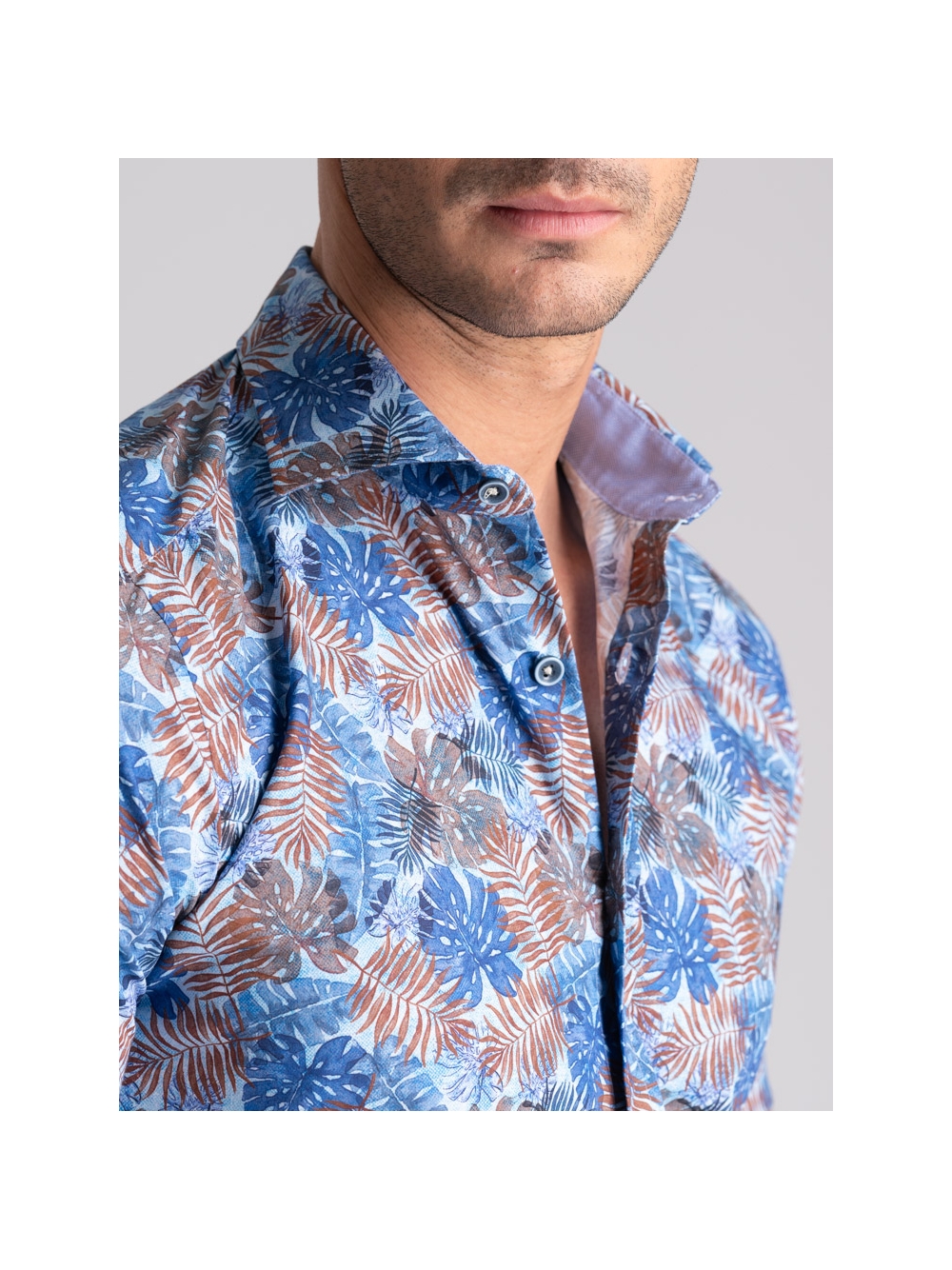 Camicia uomo mezza manica con collo semi francese, realizzata in tessuto popeline di cotone con stampa di ispirazione Hawaii nei toni dell’azzurro e moro. La camicia con vestibilità slim, è arricchita con un inserto a contrasto in tessuto azzurro nell’interno collo e bottoni bicolore avio e azzurro.