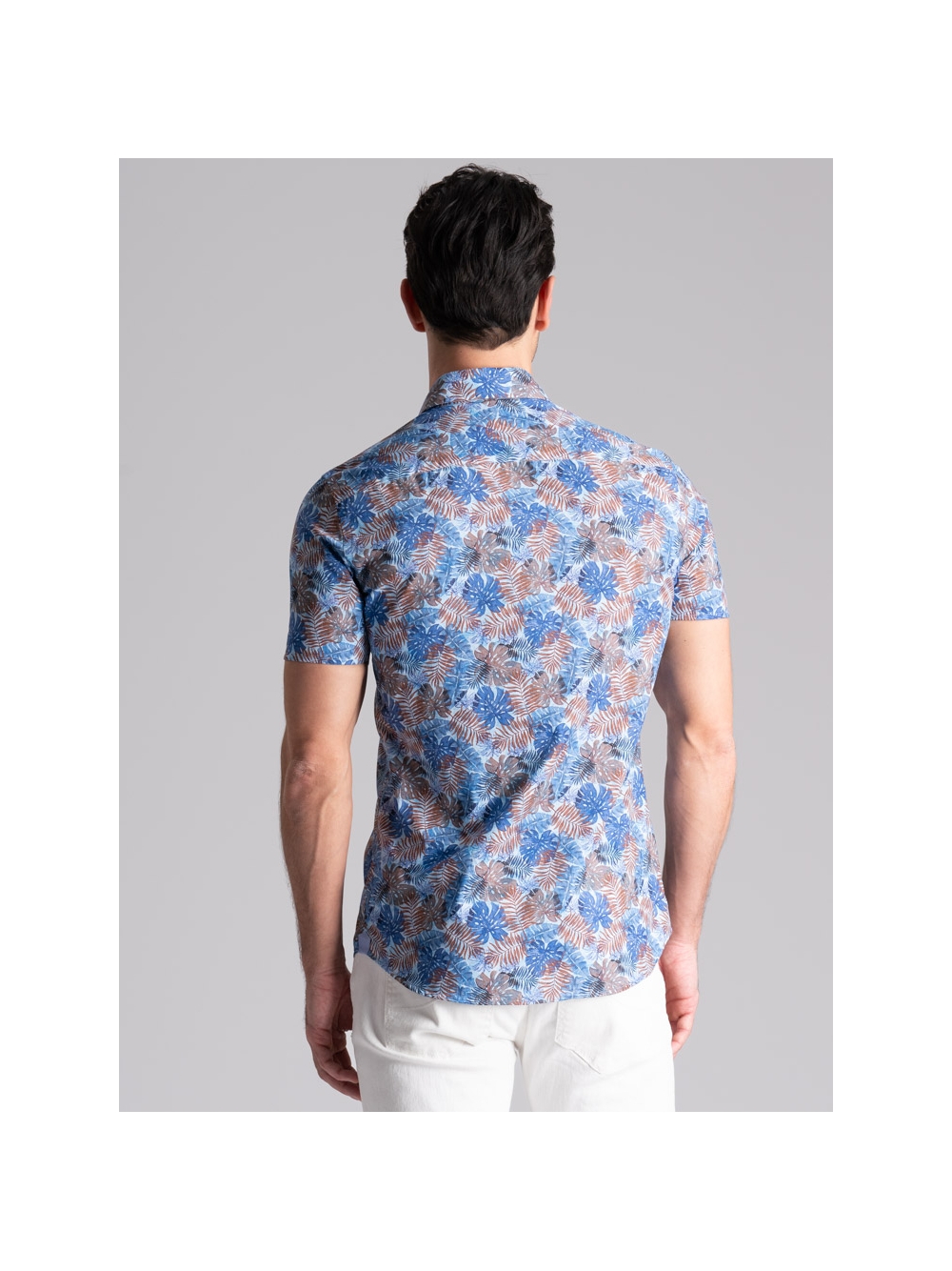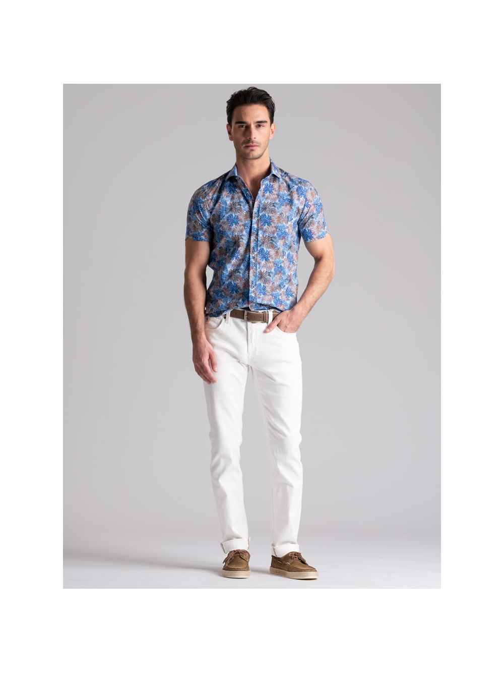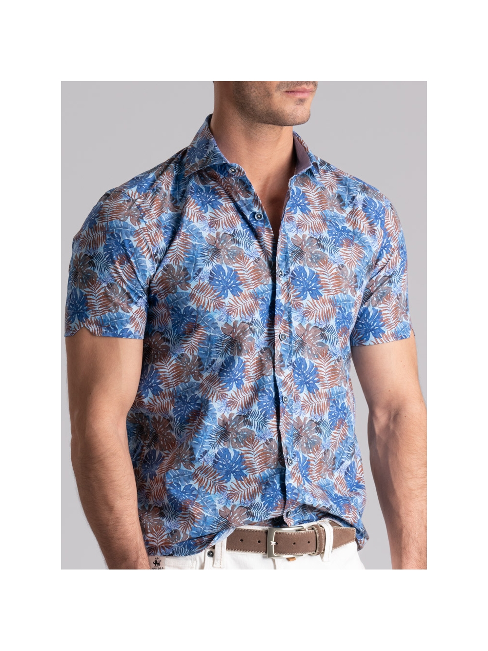 Camicia uomo mezza manica con collo semi francese, realizzata in tessuto popeline di cotone con stampa di ispirazione Hawaii nei toni dell’azzurro e moro. La camicia con vestibilità slim, è arricchita con un inserto a contrasto in tessuto azzurro nell’interno collo e bottoni bicolore avio e azzurro.