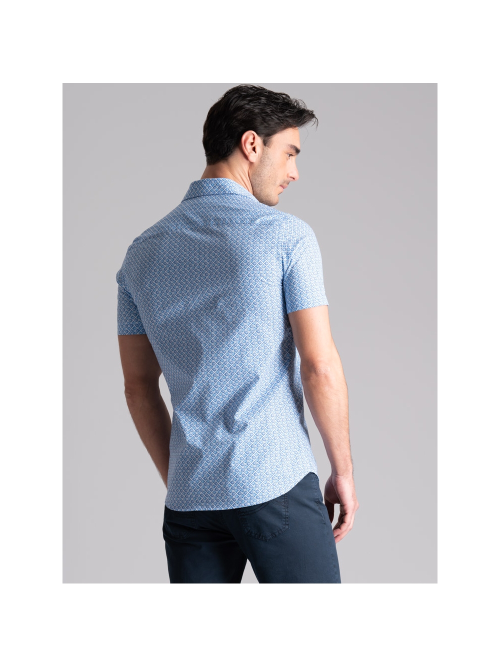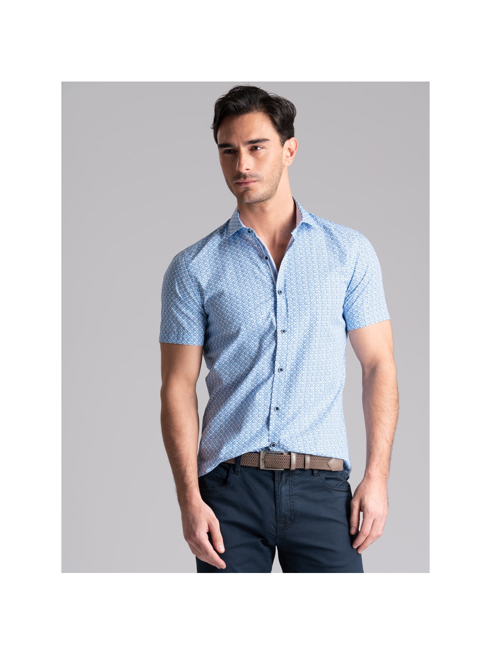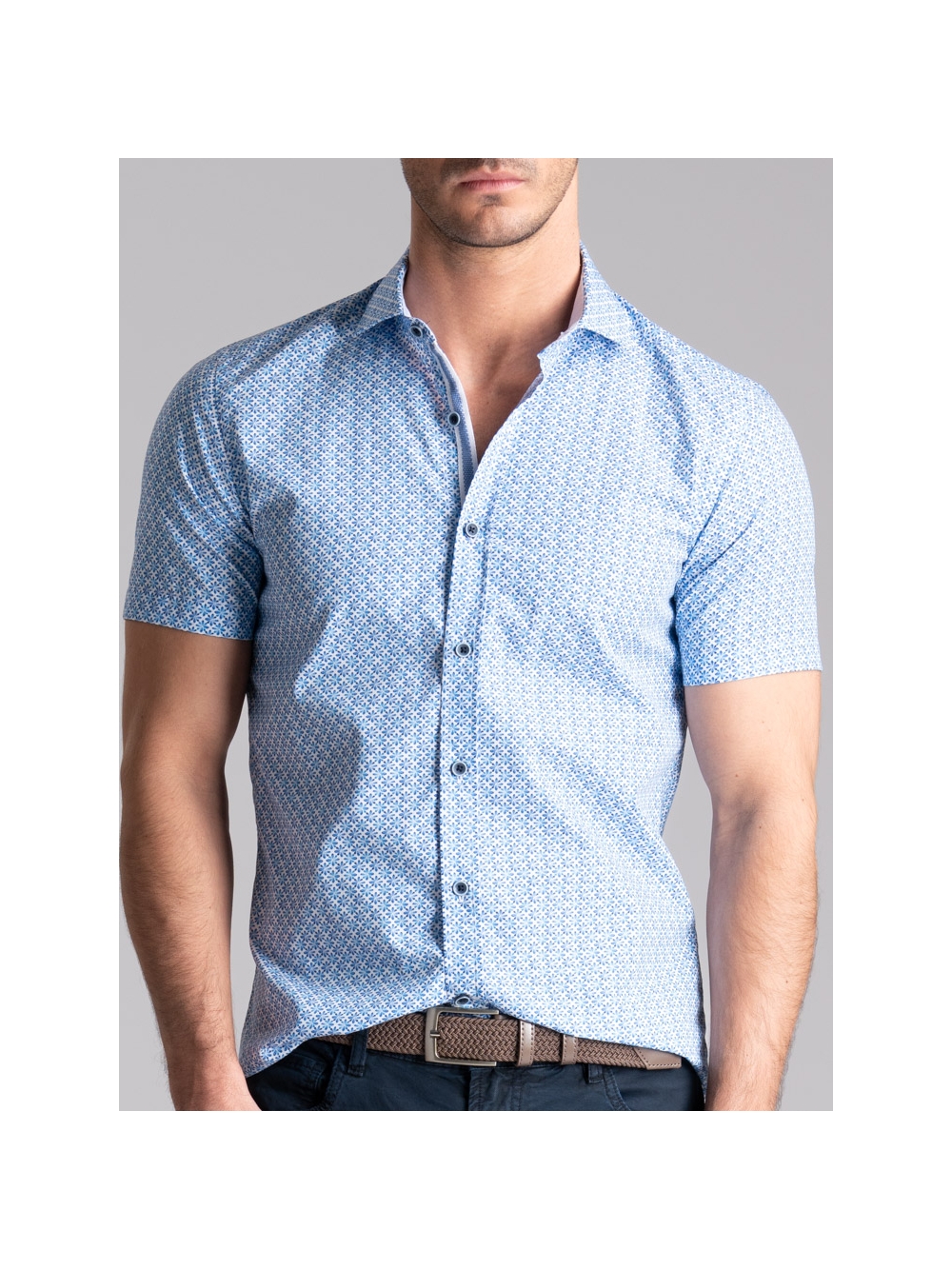 Camicia uomo mezza manica con collo semi francese, realizzata in tessuto popeline di cotone con stampa floreale nei toni dell’azzurro. La camicia con vestibilità slim, è arricchita con un inserto a contrasto in tessuto azzurro nell’interno collo, nastro applicato lungo il canolo e bottoni bicolore avio e azzurro.