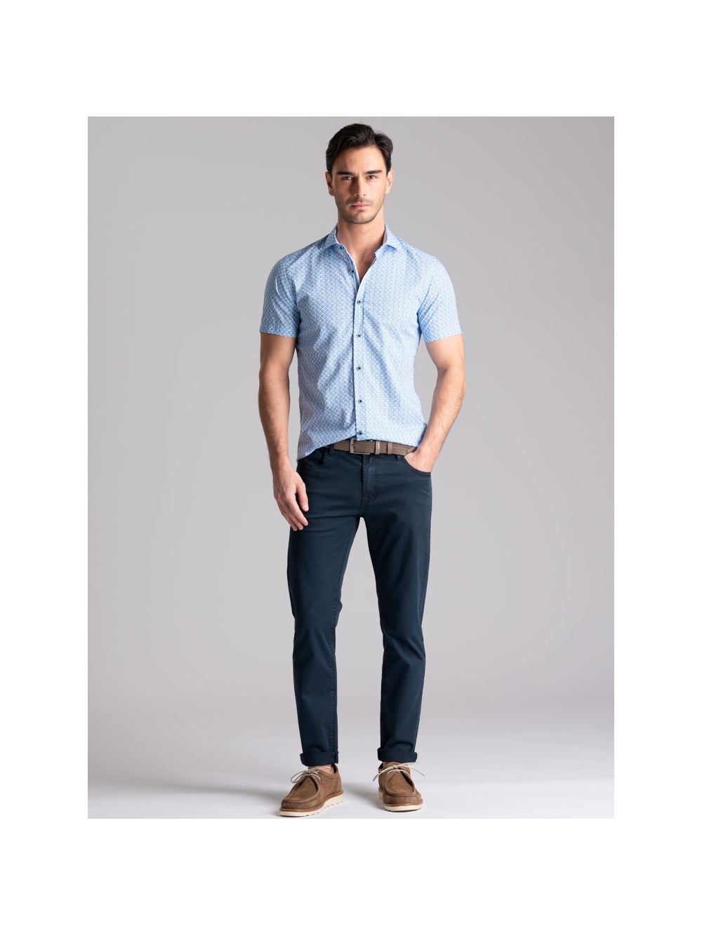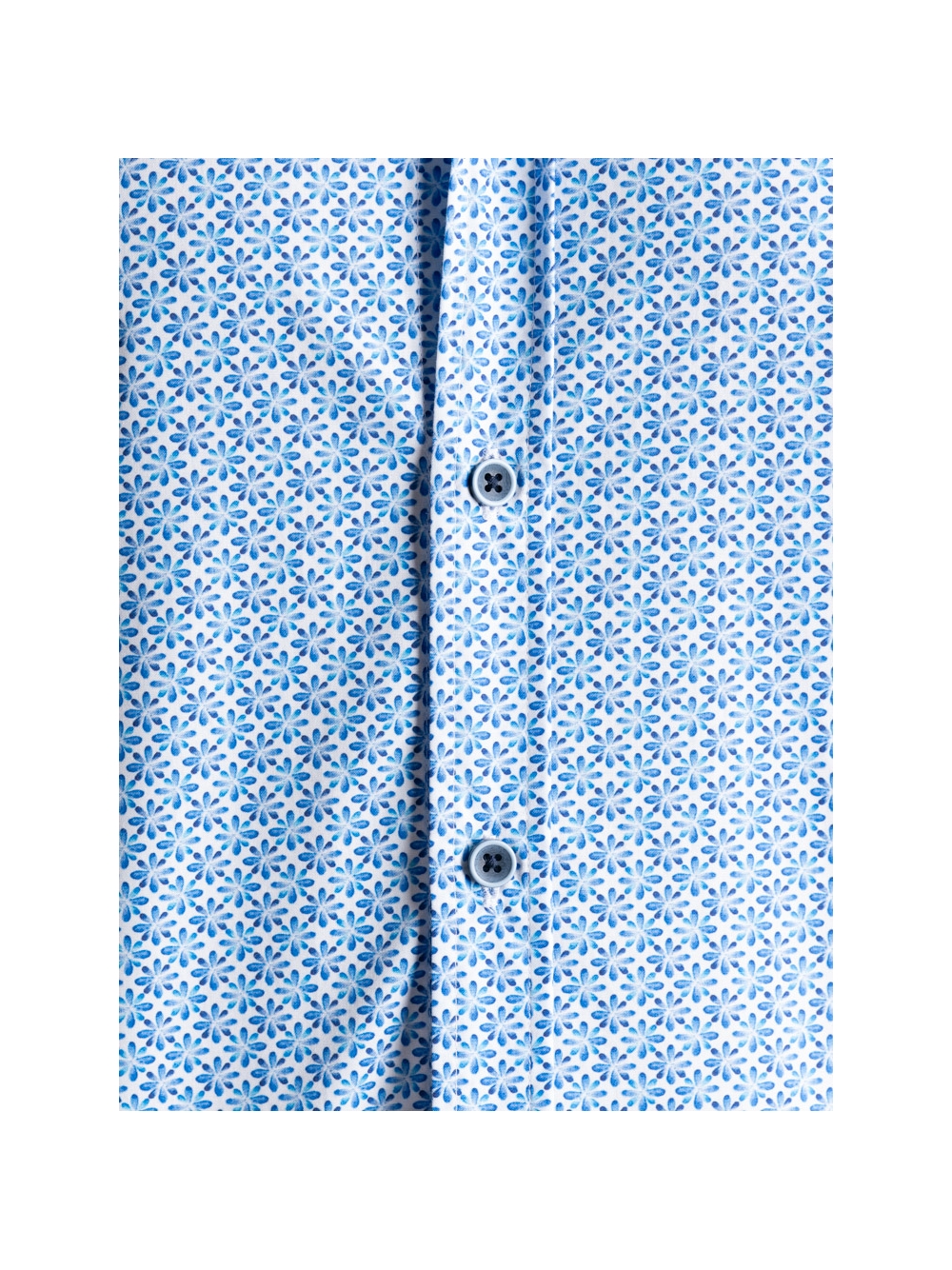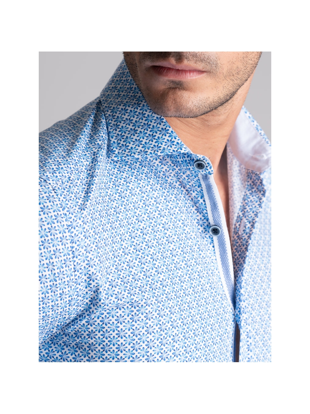 Camicia uomo mezza manica con collo semi francese, realizzata in tessuto popeline di cotone con stampa floreale nei toni dell’azzurro. La camicia con vestibilità slim, è arricchita con un inserto a contrasto in tessuto azzurro nell’interno collo, nastro applicato lungo il canolo e bottoni bicolore avio e azzurro.