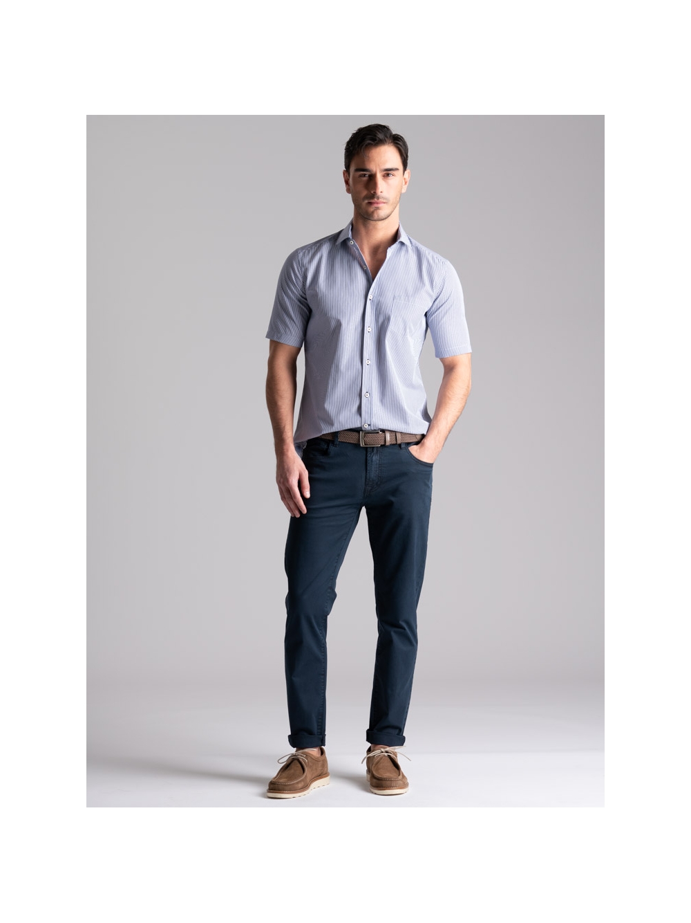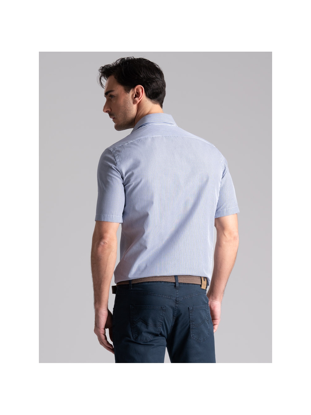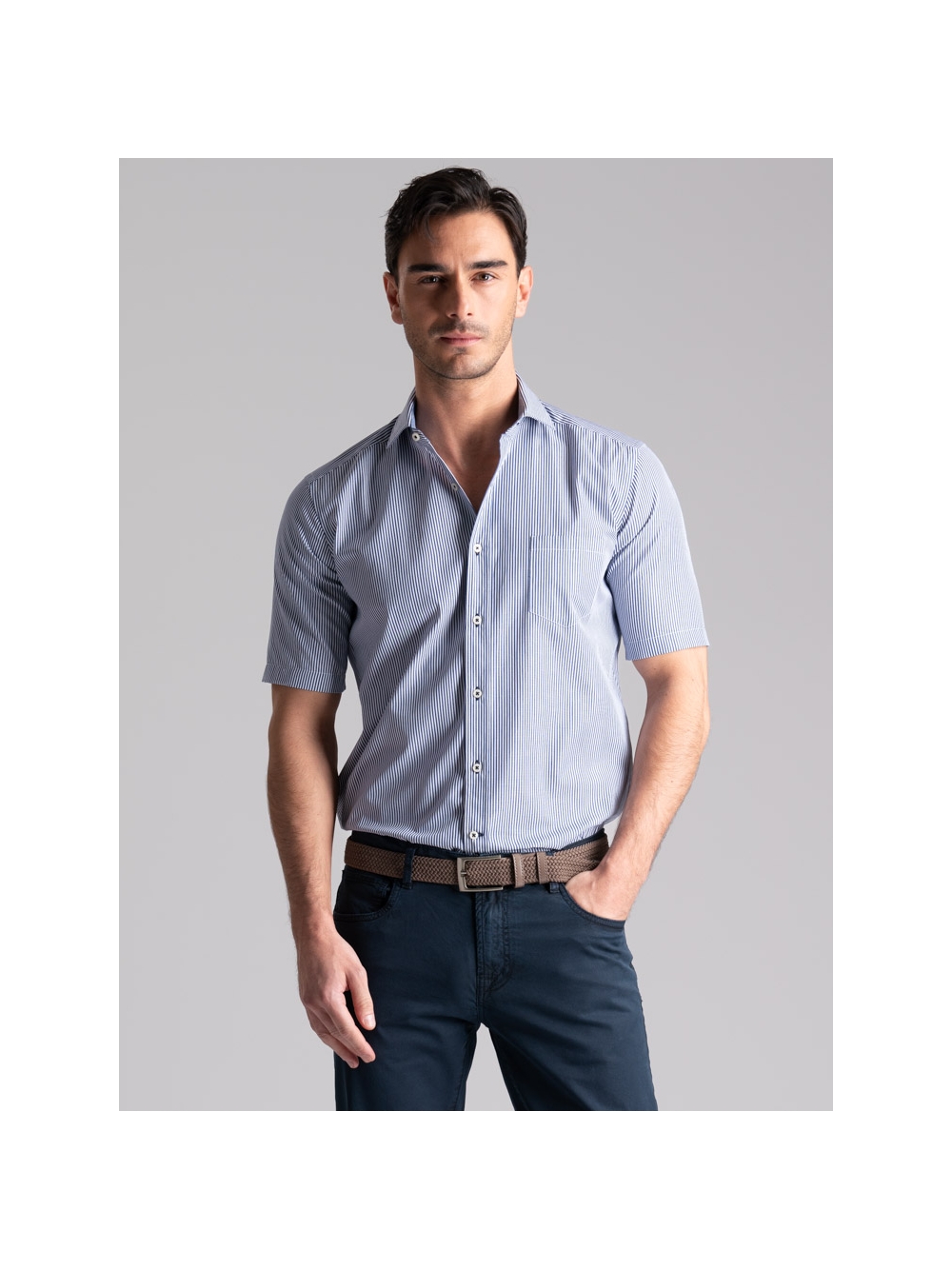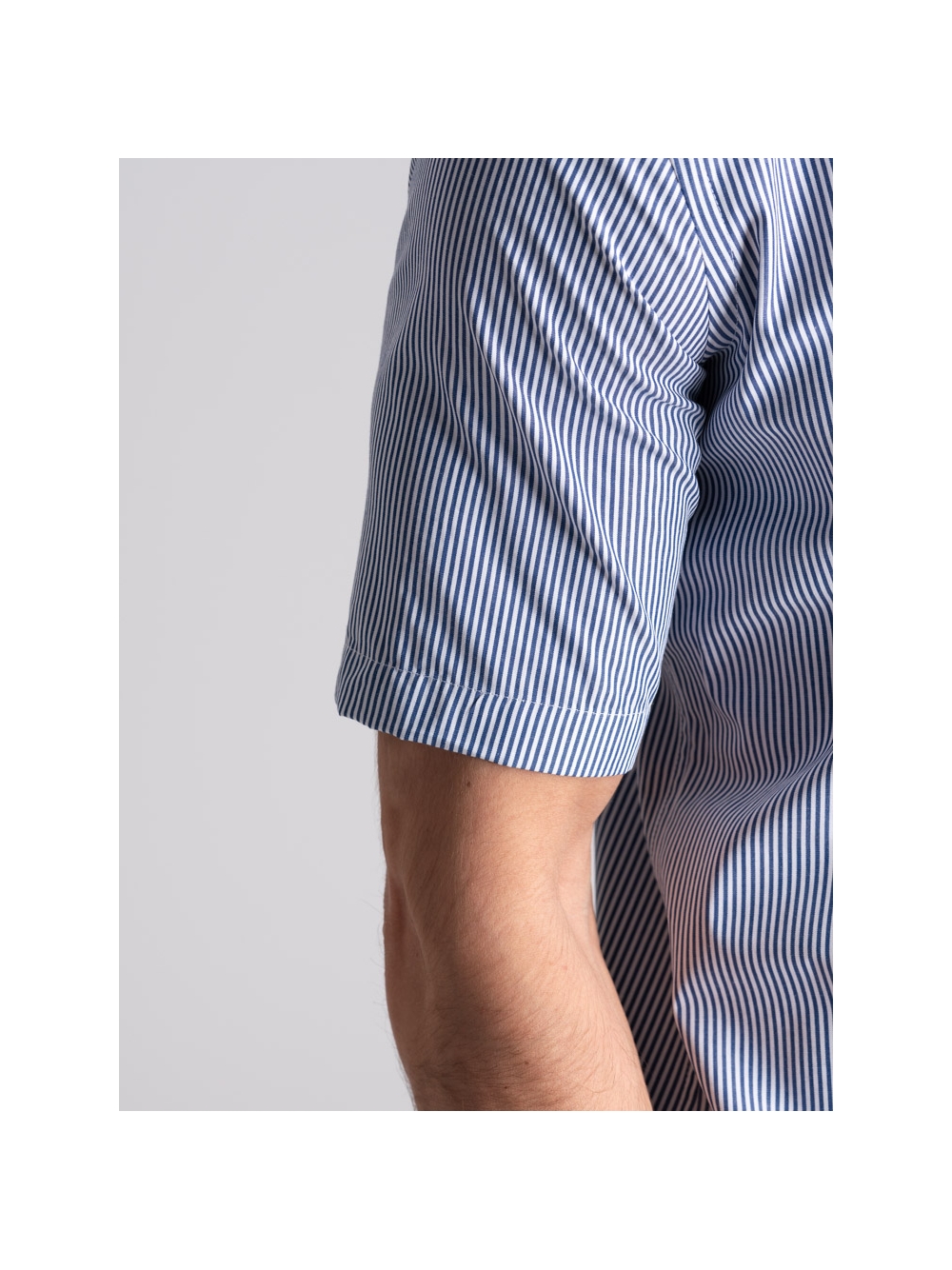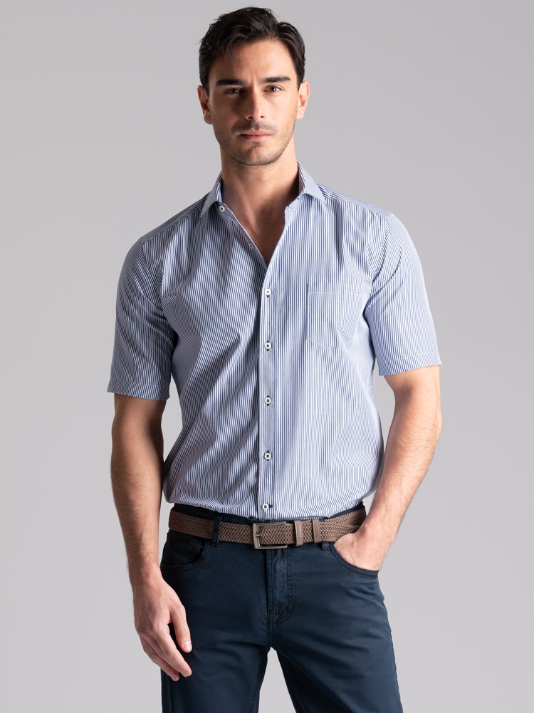 Camicia uomo vestibilità regular in tessuto popeline di cotone con fantasia a righe blu e bianco, mezza manica e collo semi francese.