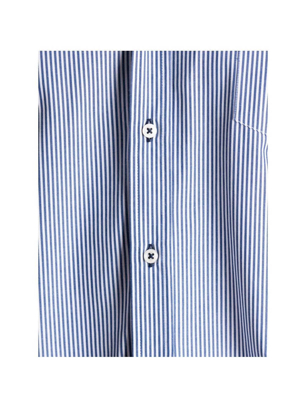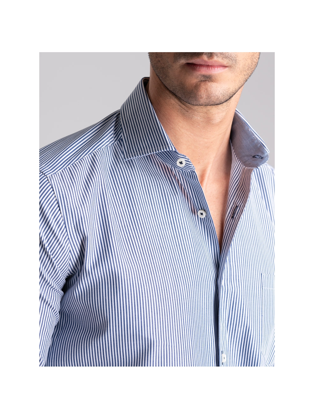 Camicia uomo con collo semi francese realizzata in tessuto popeline di cotone fantasia a righe blu e bianco, a manica corta e vestibilità regular. Questa camicia è arricchita dall’inserto collo in tessuto blu, in abbinamento all’asola e all'attaccatura dei bottoni blu.