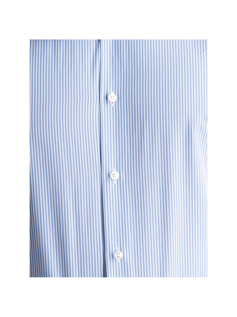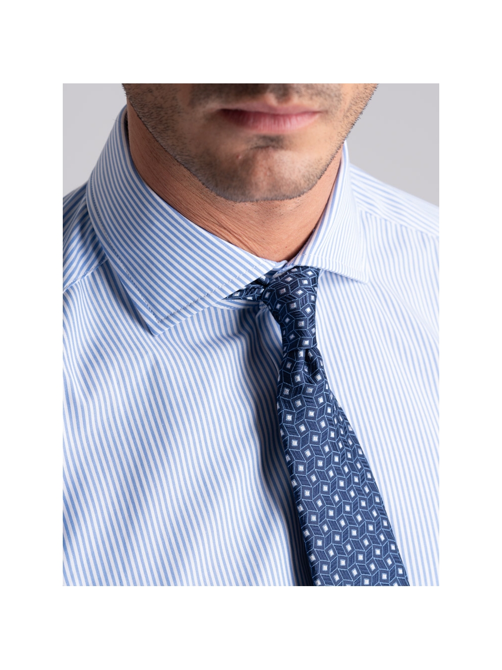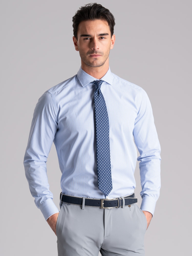 Camicia uomo con collo semi francese realizzata in tessuto di cotone popeline con riga bastoncino pari pari bianco e blu, a manica lunga e vestibilità regular. Questa camicia uomo ufficio è adatta ad una moda uomo elegante.