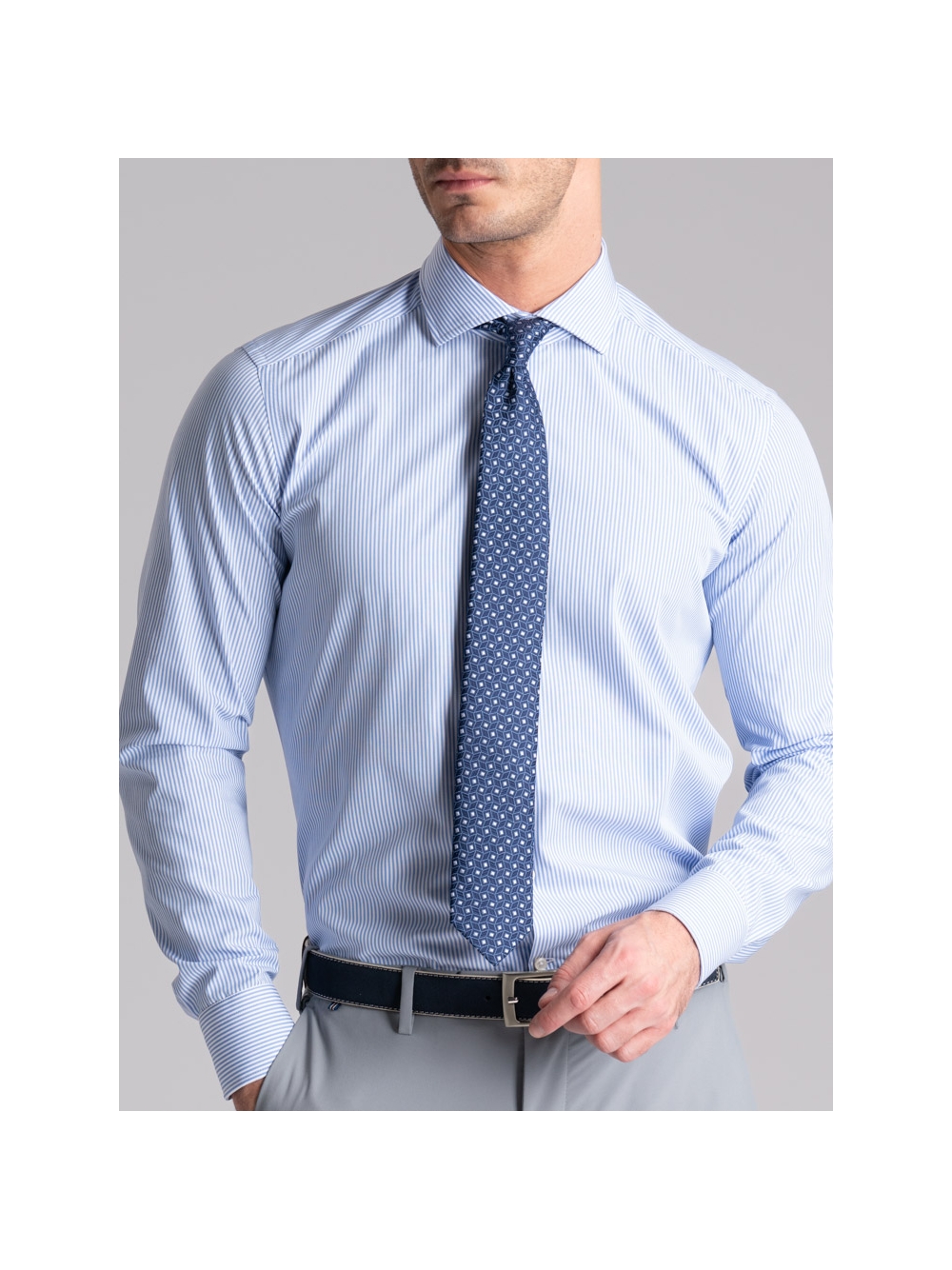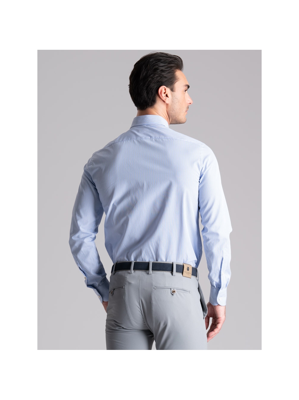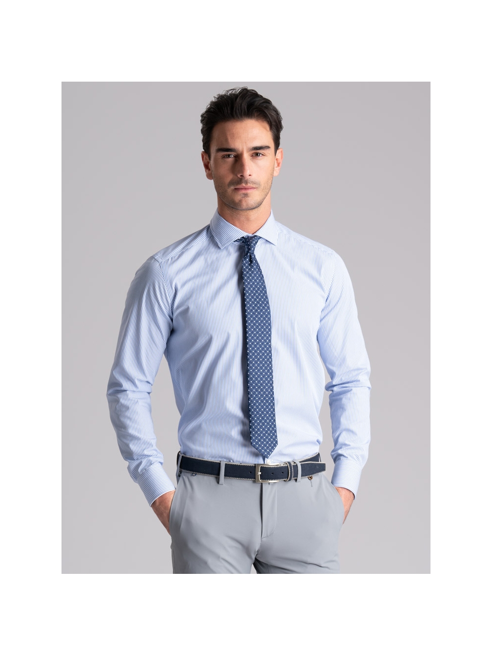 Camicia uomo con collo semi francese realizzata in tessuto di cotone popeline con riga bastoncino pari pari bianco e blu, a manica lunga e vestibilità regular. Questa camicia uomo ufficio è adatta ad una moda uomo elegante.