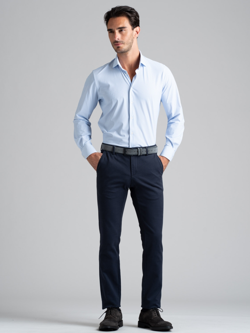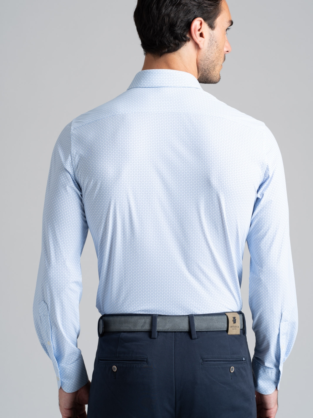 Camicia uomo a manica lunga, con collo semi francese, realizzata in tessuto TECNO stampato con micro disegno azzurro e bianco. I tessuti della linea TECNO sono altamente performanti e assicurano: elasticità e resistenza, perfetta vestibilità, traspirabilità e leggerezza, controllo termico, rapida asciugatura e stiro facile.