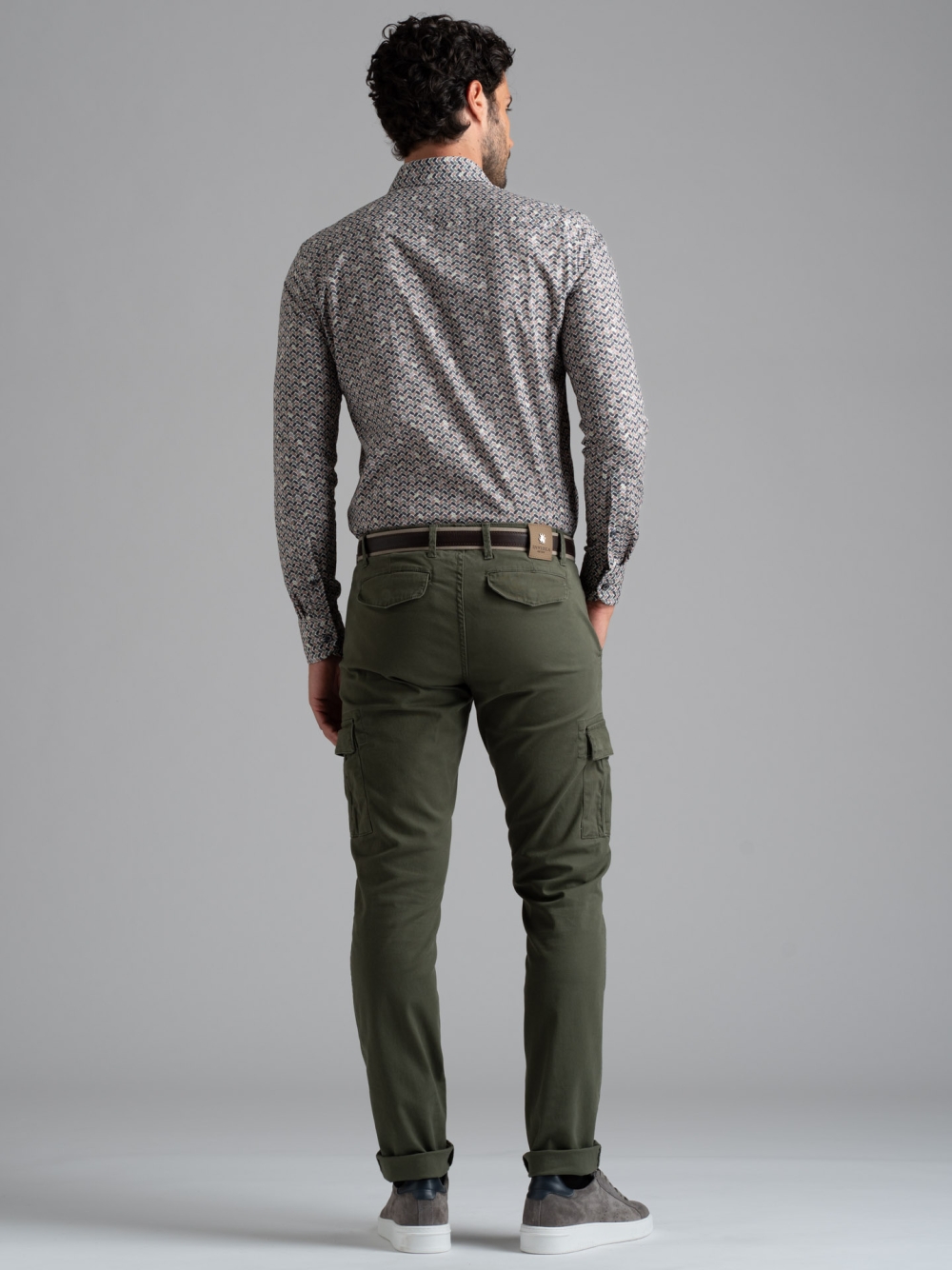 Camicia uomo con collo semi francese realizzata in tessuto popeline a stampa fantasia geometrica verde, marrone, grigio chiaro e scuro, a manica lunga. La camicia è arricchita da bottoni bicolore moro e avio e dal parasudore beige all’interno del collo.