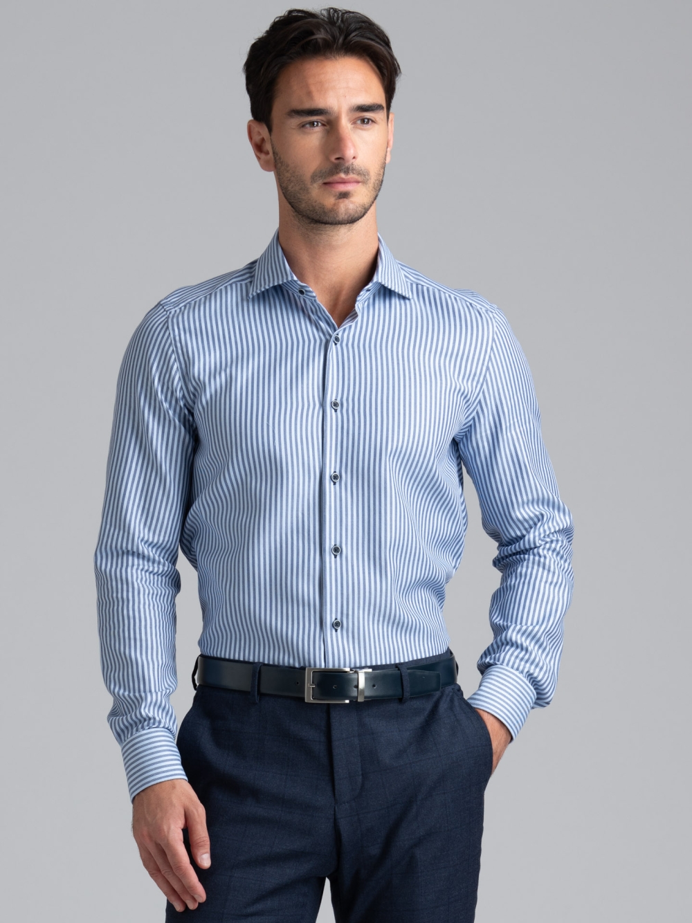 Camicia uomo con collo semi francese realizzata in tessuto royal twill rigato azzurro e blu, a manica lunga e vestibilità slim. La camicia è arricchita da inserti in tessuto micro armaturato nell’interno collo e polsi, asole a contrasto blu e bottoni bicolore.