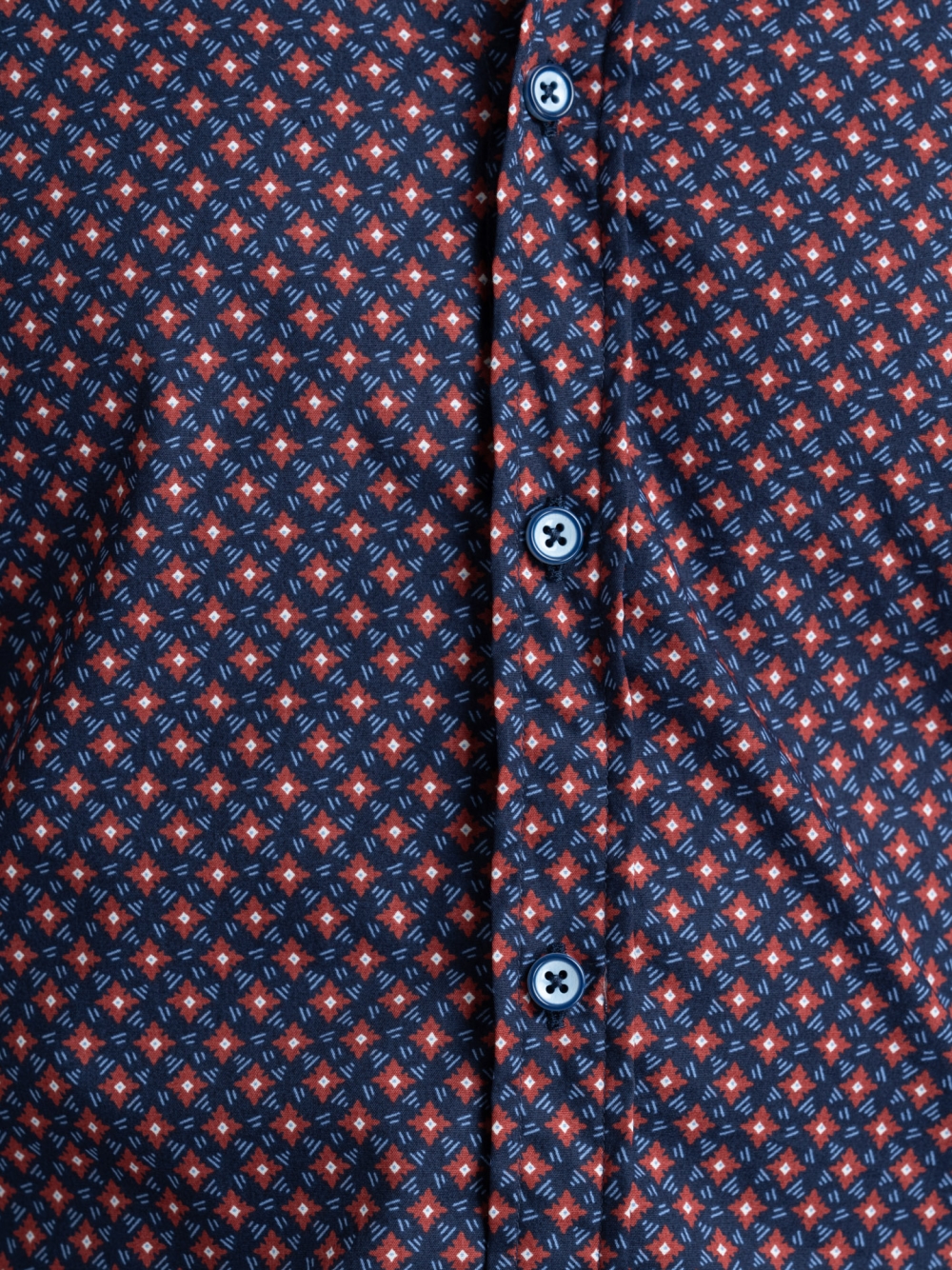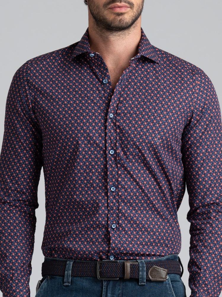 Camicia uomo vestibilità regular in popeline con stampa fantasia geometrica blu e mattone e collo semi francese.
