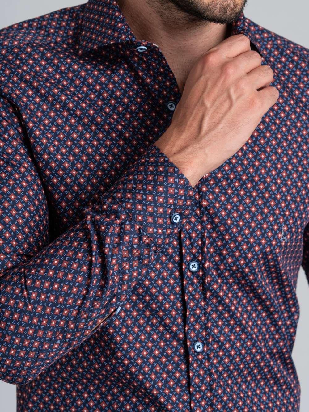 Camicia uomo con collo semi francese realizzata in tessuto popeline a stampa fantasia geometrica blu e mattone, a manica lunga e vestibilità regular. La camicia è arricchita da bottoni bicolore blu e avio e dal parasudore beige all’interno del collo.