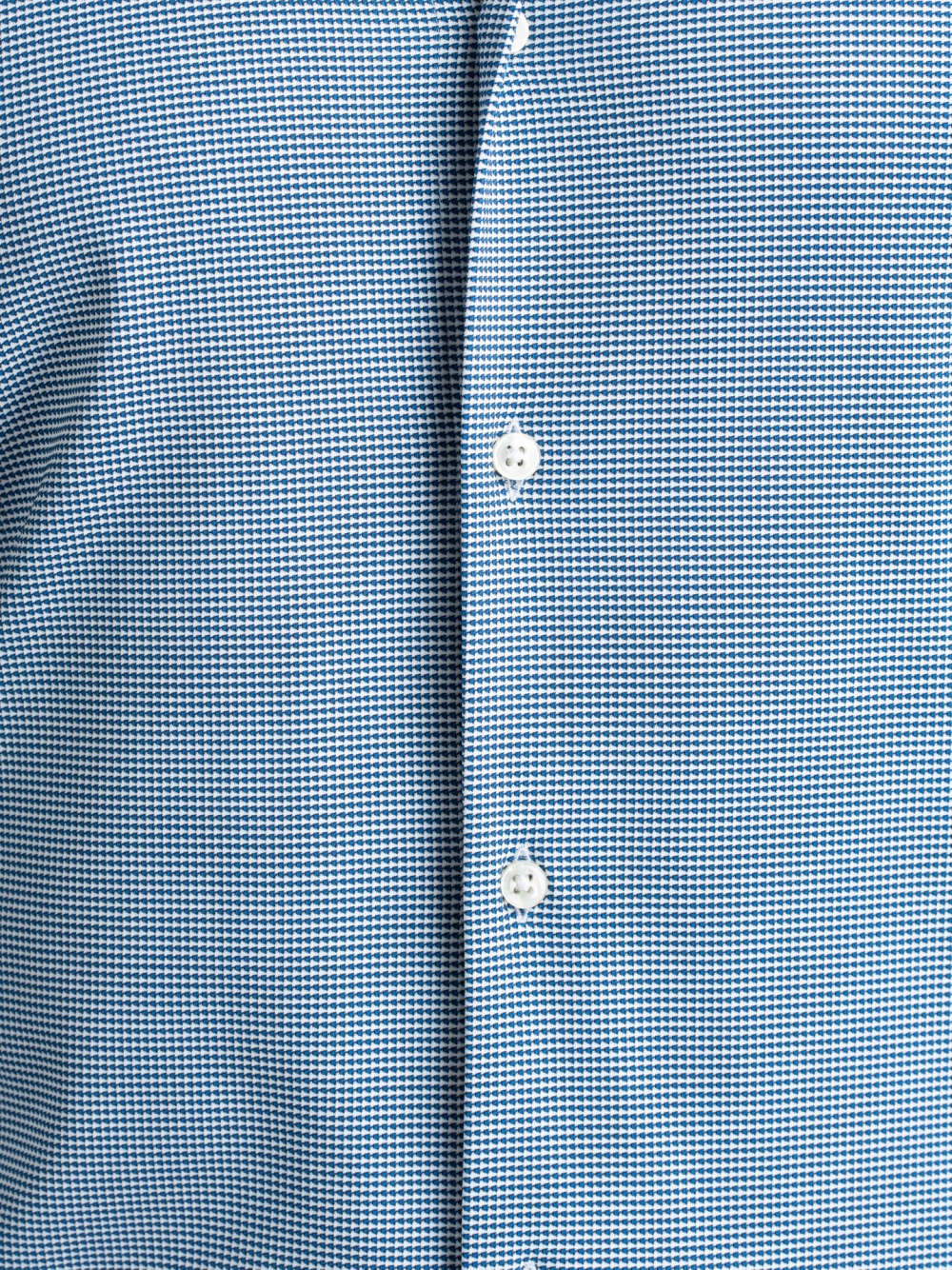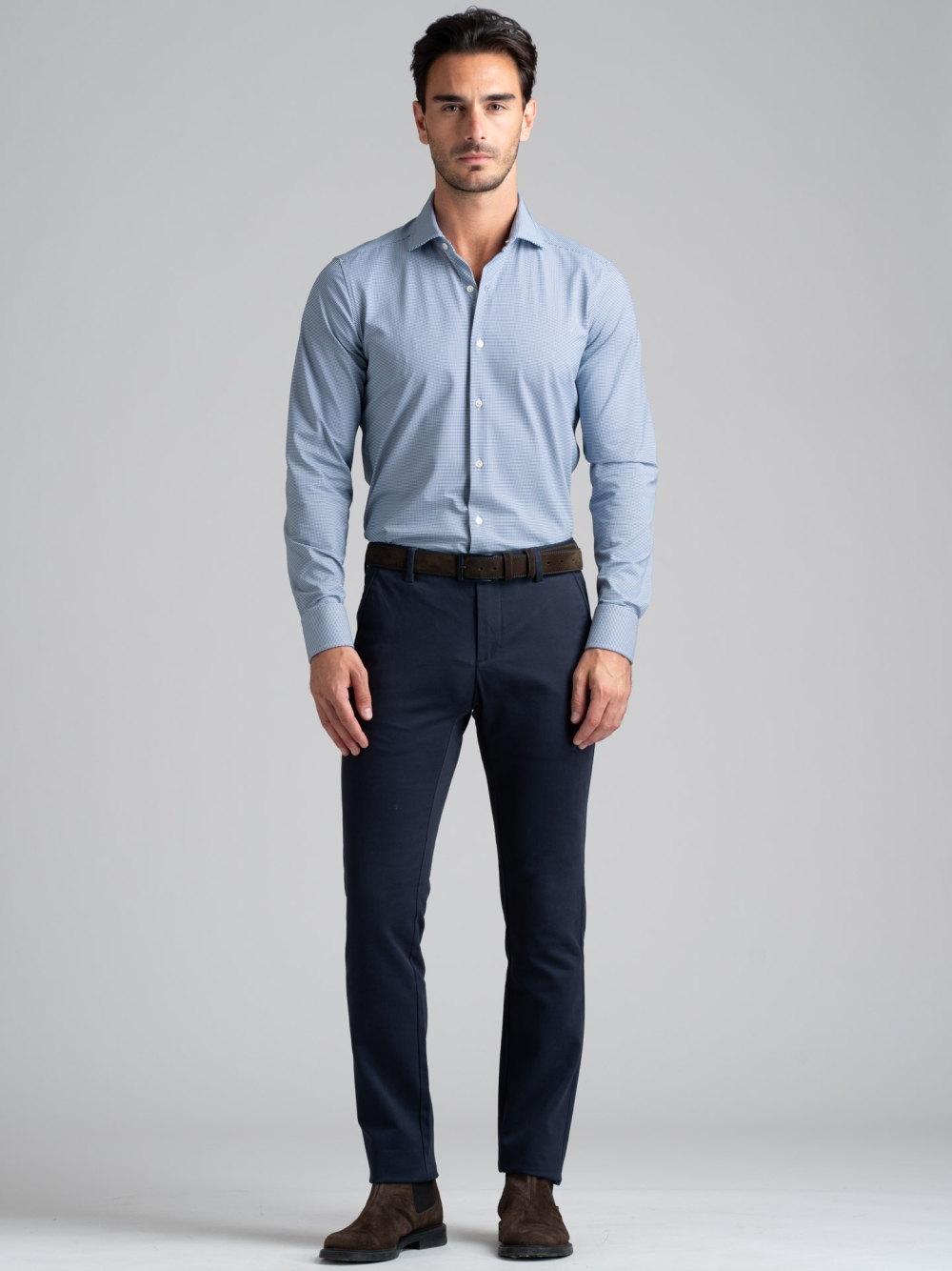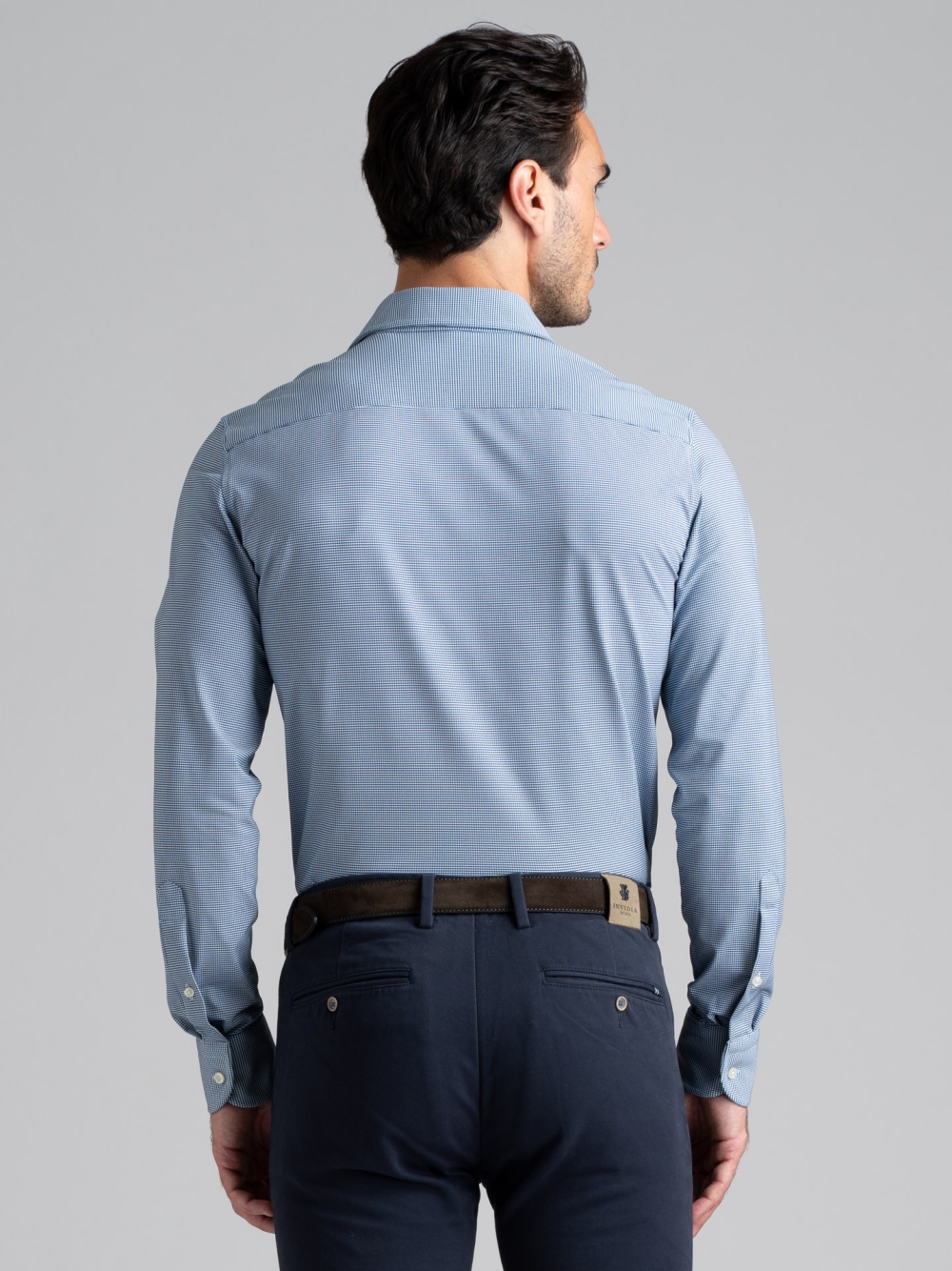Camicia uomo a manica lunga, con collo semi francese, realizzata in tessuto TECNO armaturato blu e bianco. I tessuti della linea TECNO sono altamente performanti e assicurano: elasticità e resistenza, perfetta vestibilità, traspirabilità e leggerezza, controllo termico, rapida asciugatura e stiro facile.