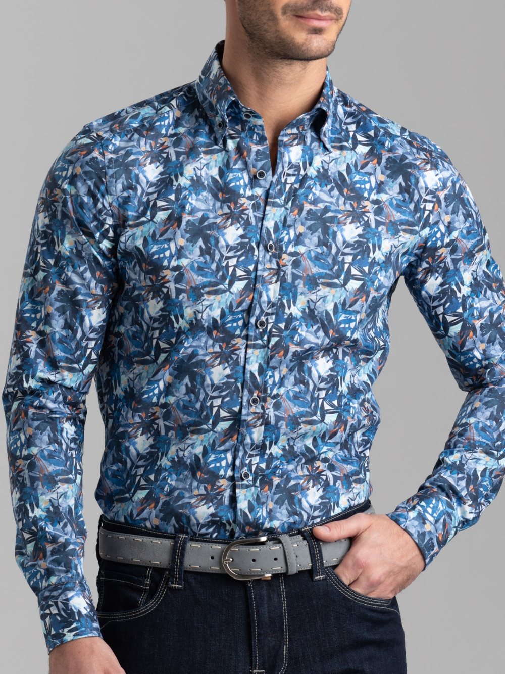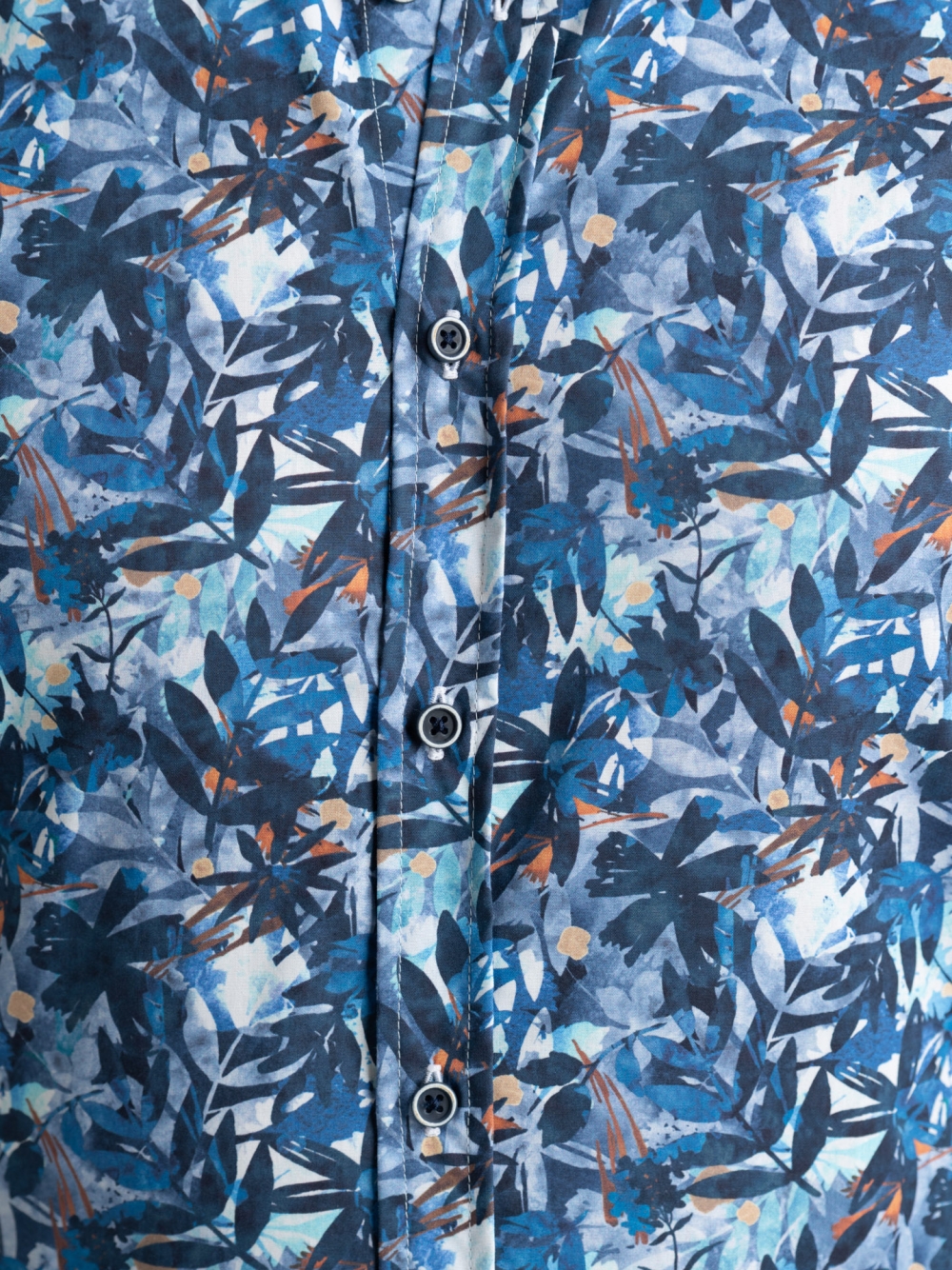 Camicia uomo in popeline con stampa a grandi foglie nei toni del blu, collo button down e dettagli a contrasto.