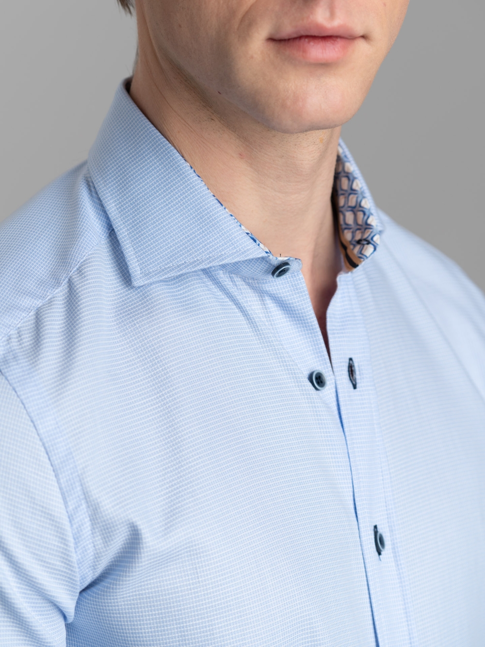 Camicia uomo in tessuto micro armaturato 100% cotone, tinta unita azzurra con collo semi francese. La camicia presenta un’asola blu, bottoni bicolore blu e avio, nastro applicato e inserti in tessuto con fantasia geometrica all'interno del collo e sui polsi.