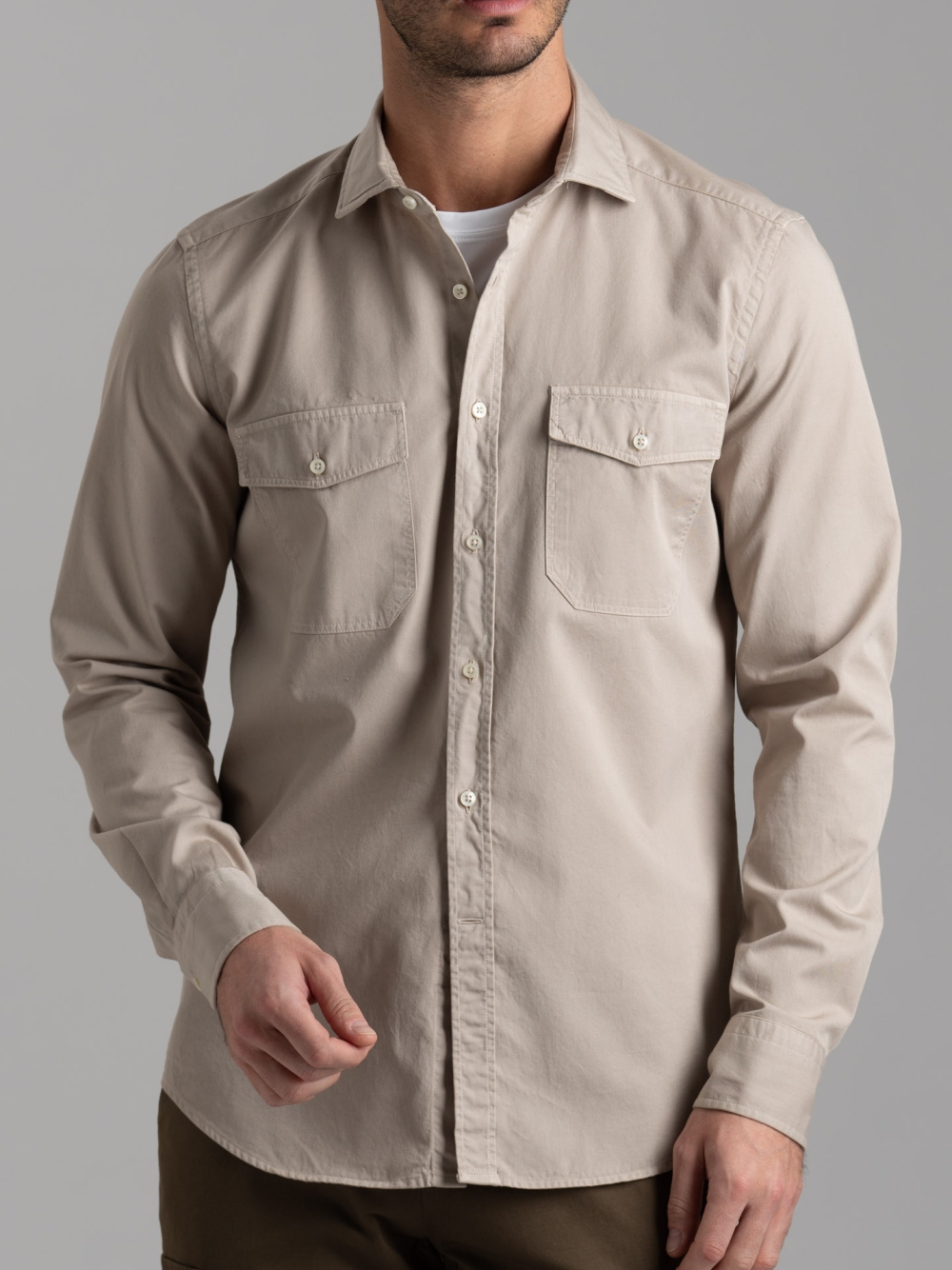 Camicia uomo slim realizzata in tessuto di cotone twill tinto capo con tasche applicate. Disponibile nelle varianti colore nero, corda e verde, questa camicia è ideata per una moda uomo casual e look rilassati.