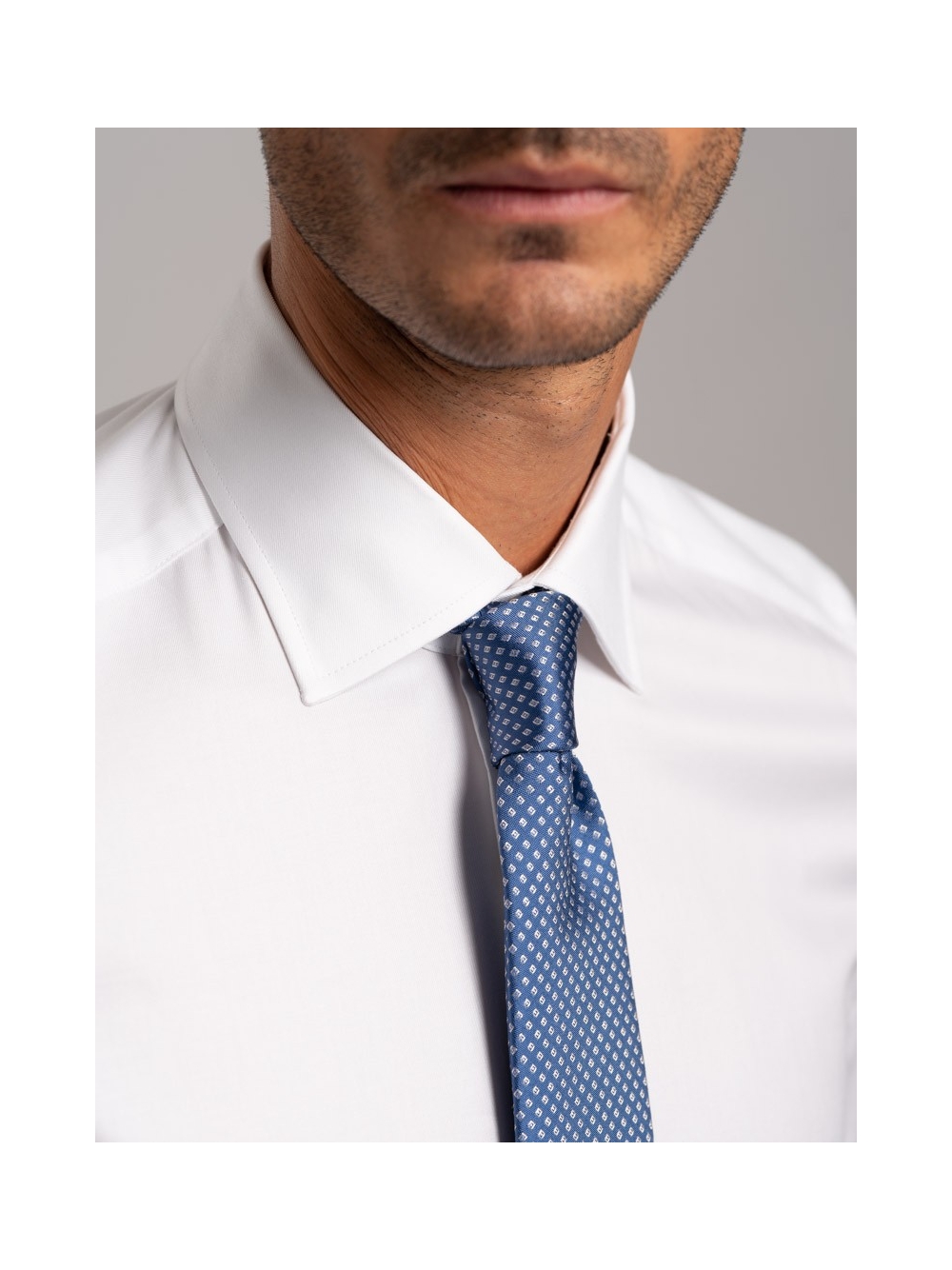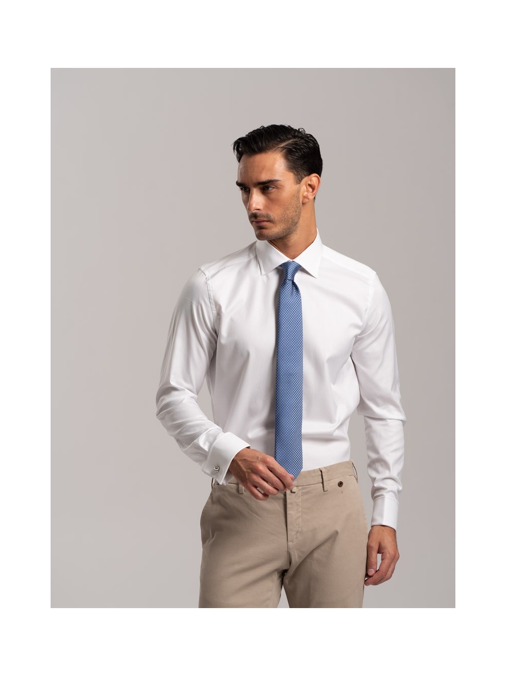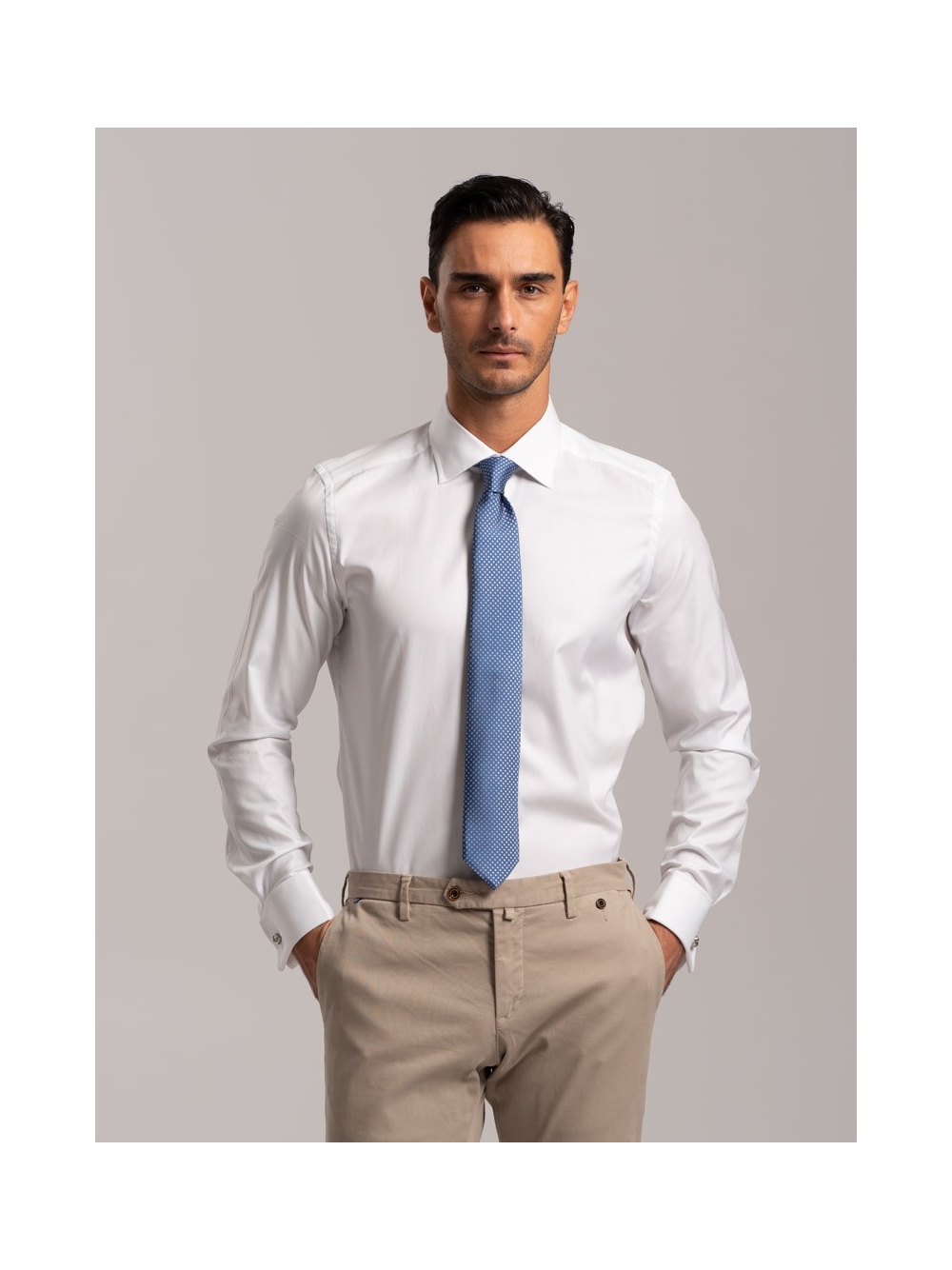 Camicia uomo tinta unita dal taglio sartoriale, vestibilità slim fit, realizzata in cotone twill doppio ritorto, collo semi francese