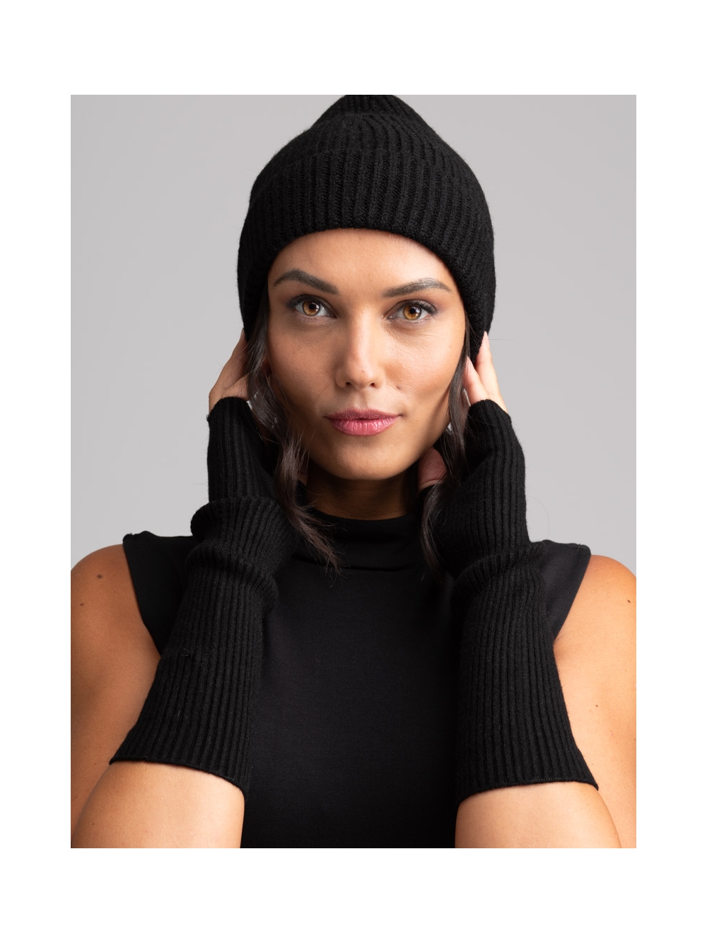 Cappellino donna stile berretto realizzato in tessuto di maglia con lavorazione a coste inglese disponibile nelle varianti colore panna, cammello, nero e grigio melange, da portare in abbinamento ai guantini lunghi e senza dita in maglia degli stessi colori.