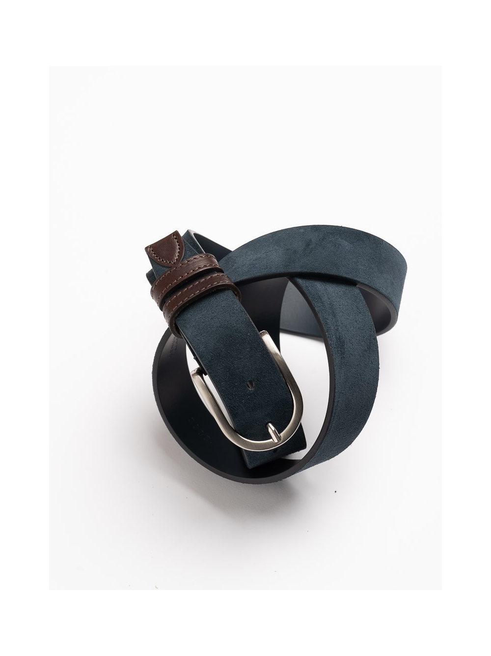 Cintura uomo in camoscio con contrasto colore nel passa cintura, senza cuciture sui bordi. Altezza cintura cm 3,5.