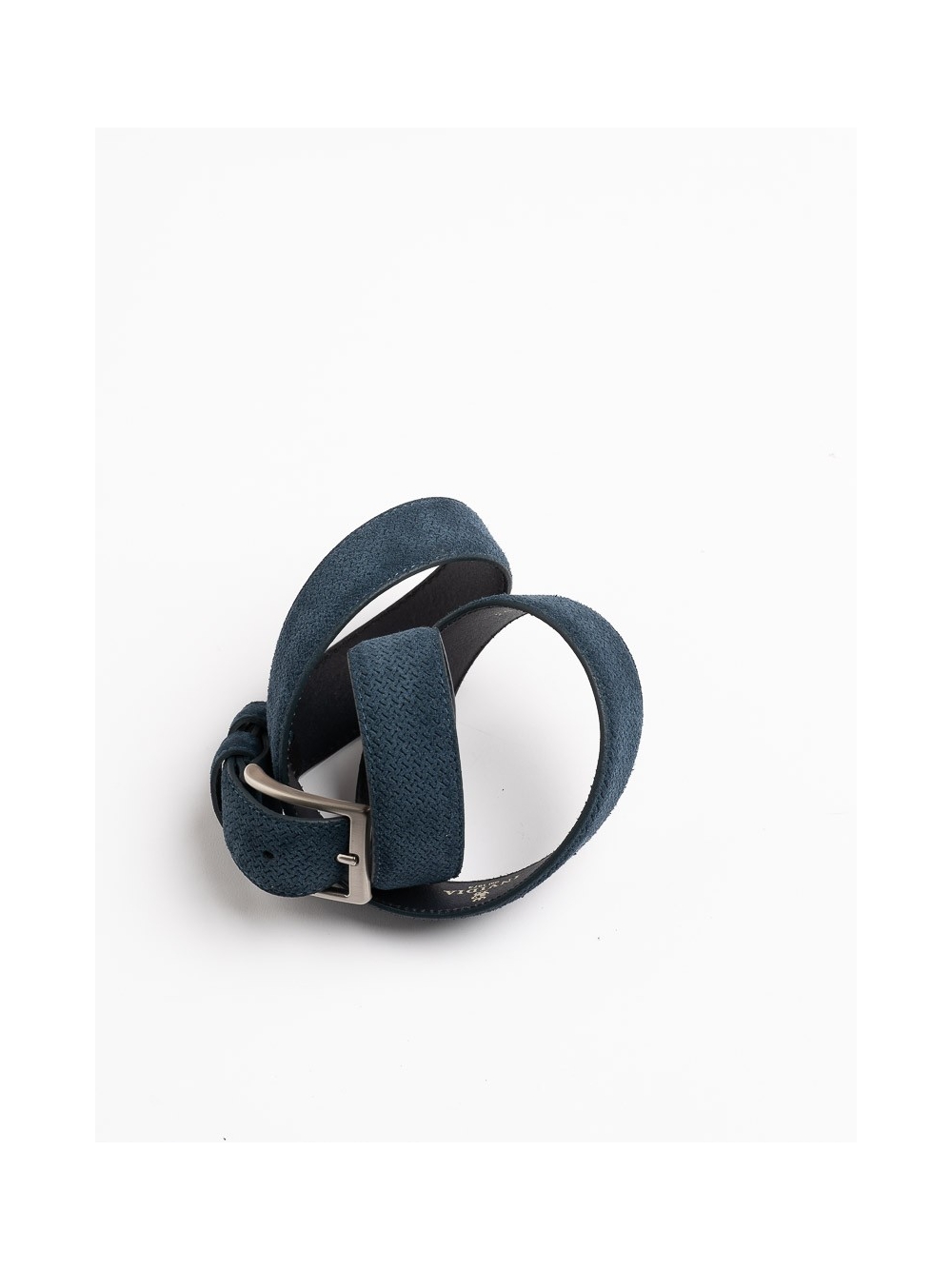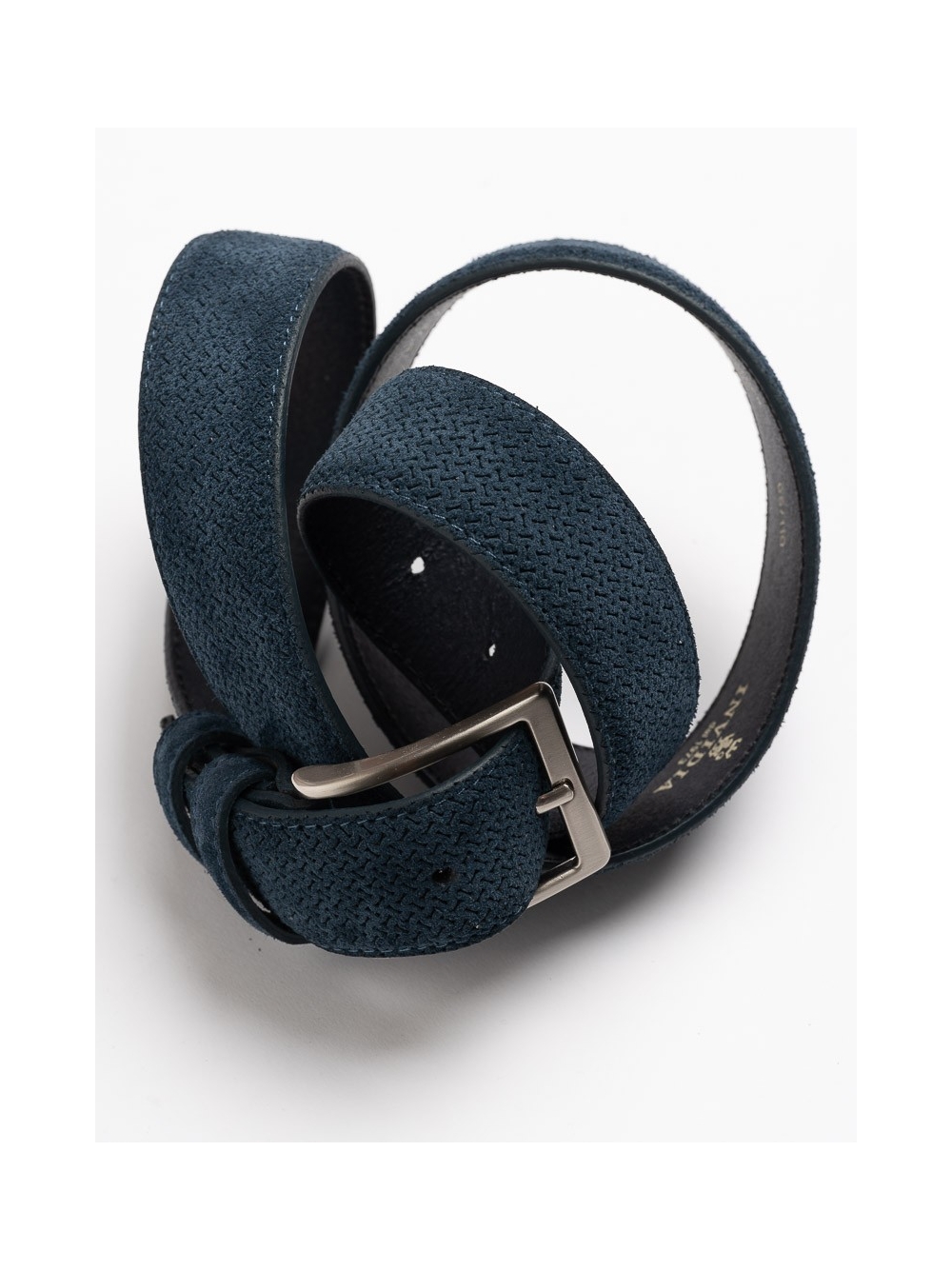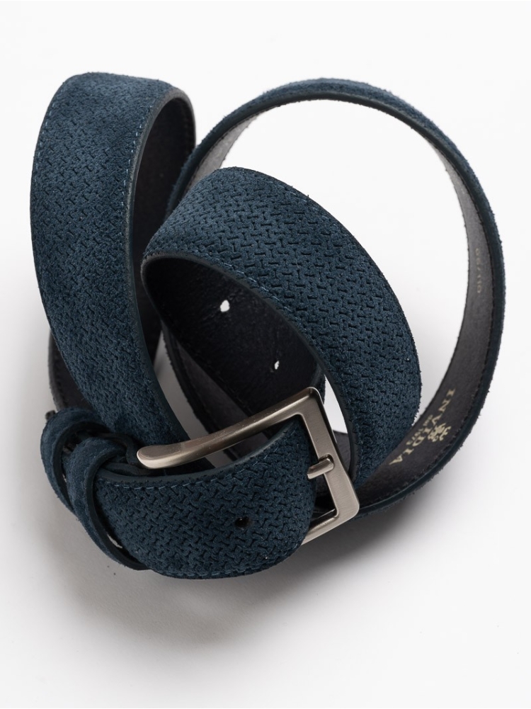 Cintura uomo in camoscio stampata effetto micro disegno. Bombata con cuciture tono su tono. Altezza cintura cm 3,5.