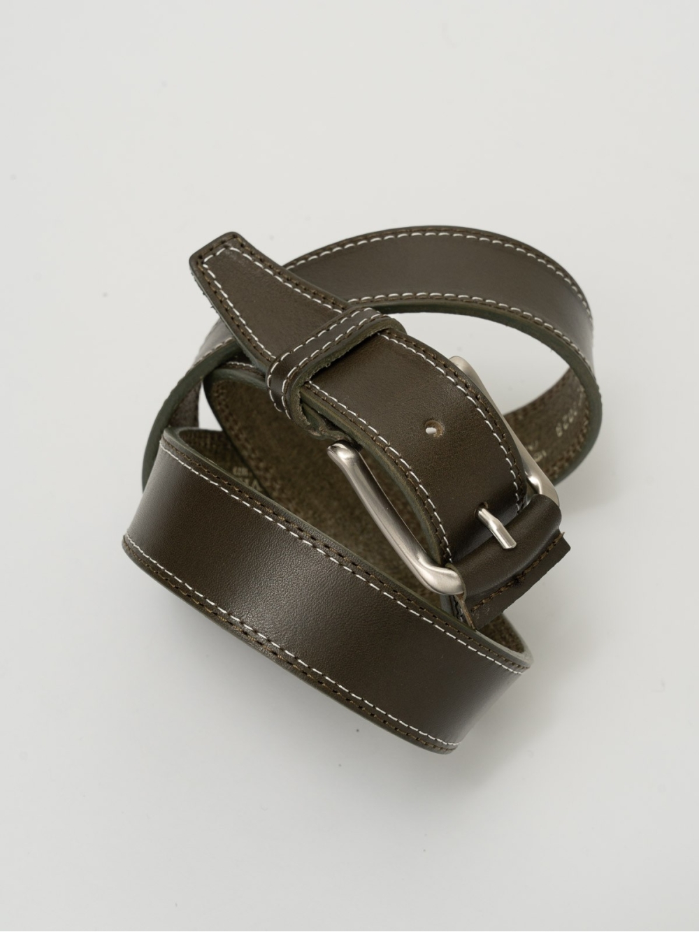 Cintura uomo 100% pelle con doppia impuntura – una tono su tono e una a contrasto – fibbia con inserto in pelle per l’ardiglione.