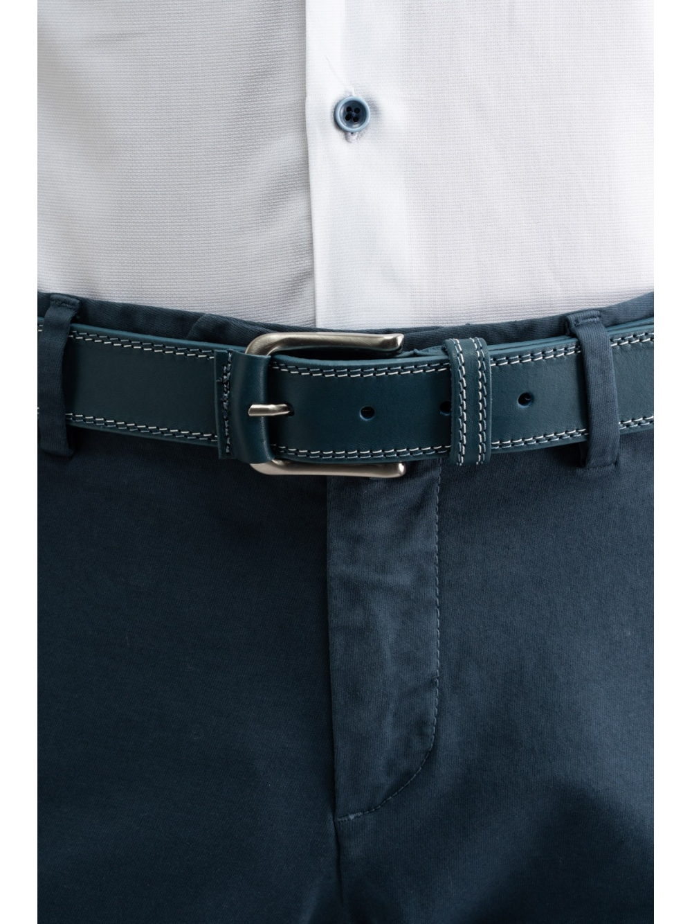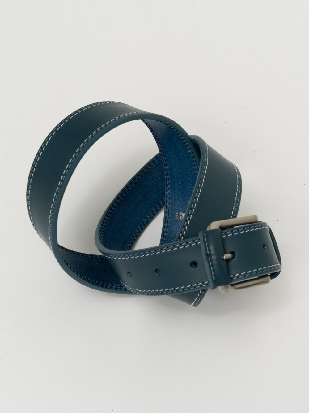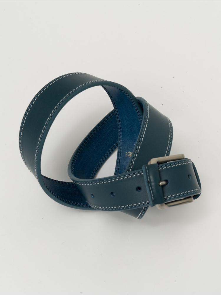 Cintura uomo 100% pelle con doppia impuntura – una tono su tono e una a contrasto – fibbia con inserto in pelle per l’ardiglione.