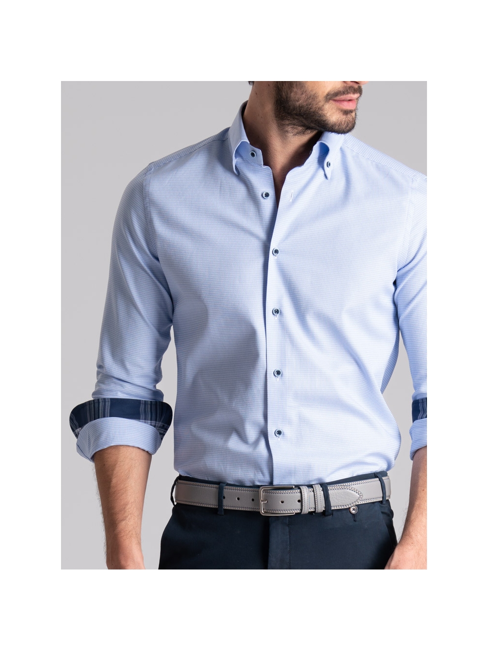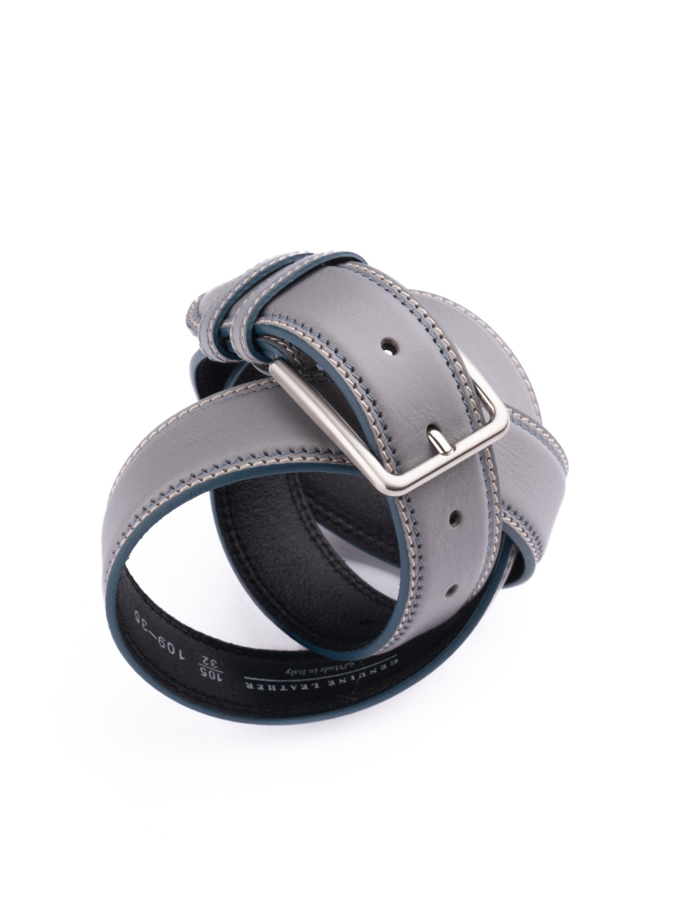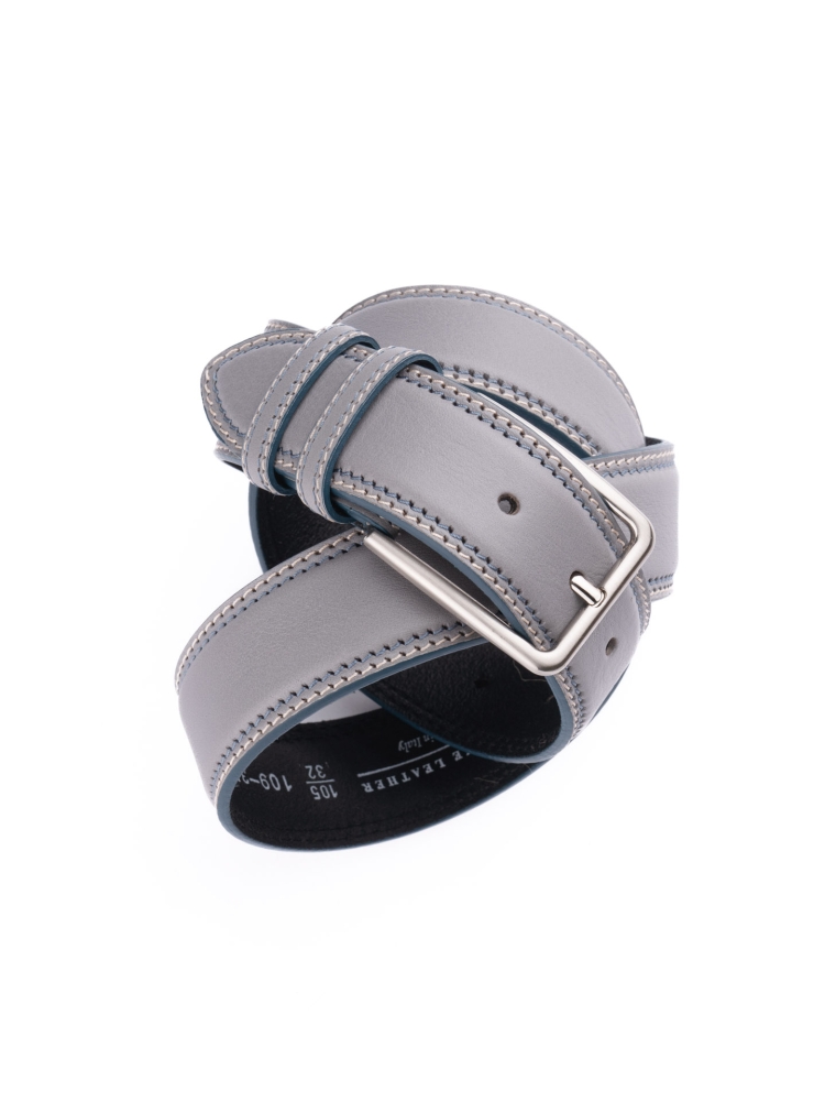 Cintura uomo in pelle con bordo a contrasto e impunture di due colori, disponibile nelle varianti colore blu e grigio