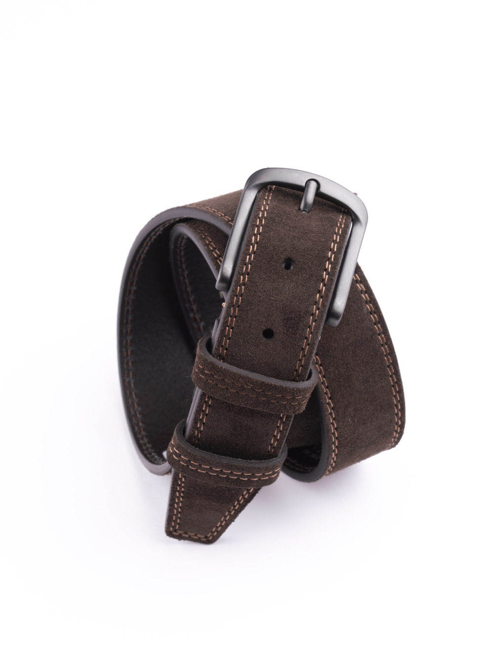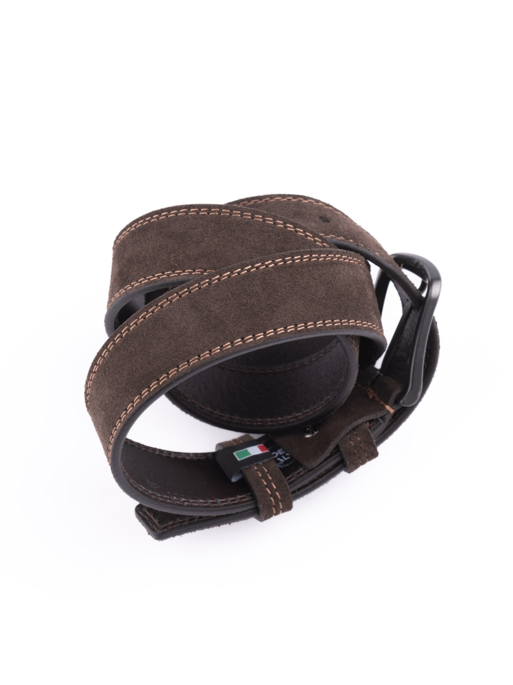 Cintura uomo in camoscio nelle varianti colore moro, sabbia e avio, con doppia impuntura a contrasto.